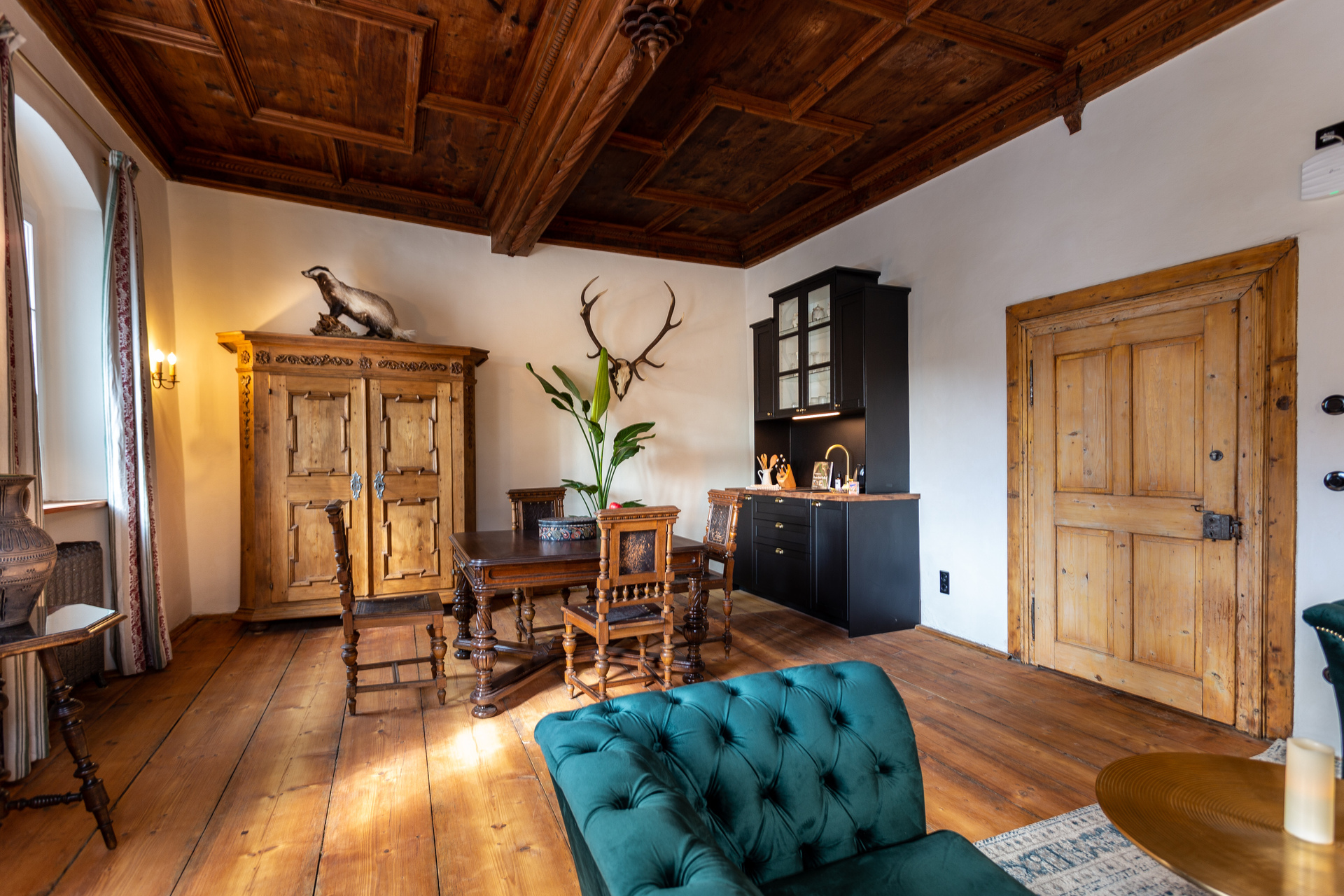Die „Beletage“ im 1. Stock des Gebäudes steht nun allen zur Verfügung. Hier wurden in unmittelbarem Verband mit der Wohnung des Bauherrn durch den Einbau von Gemeinschaftsküche, Speisesaal und Kaminzimmer Orte des zwanglosen Miteinander geschaffen.