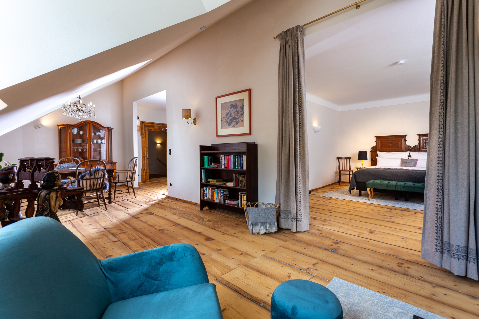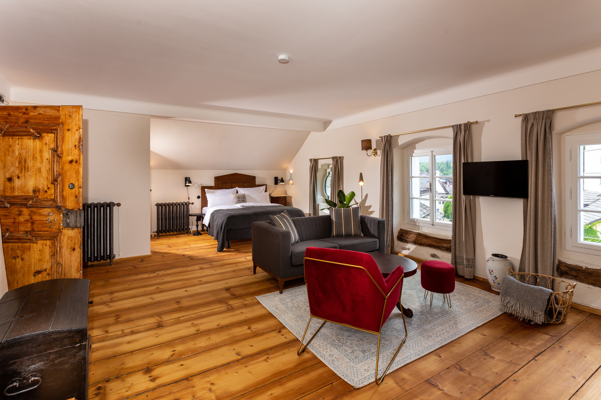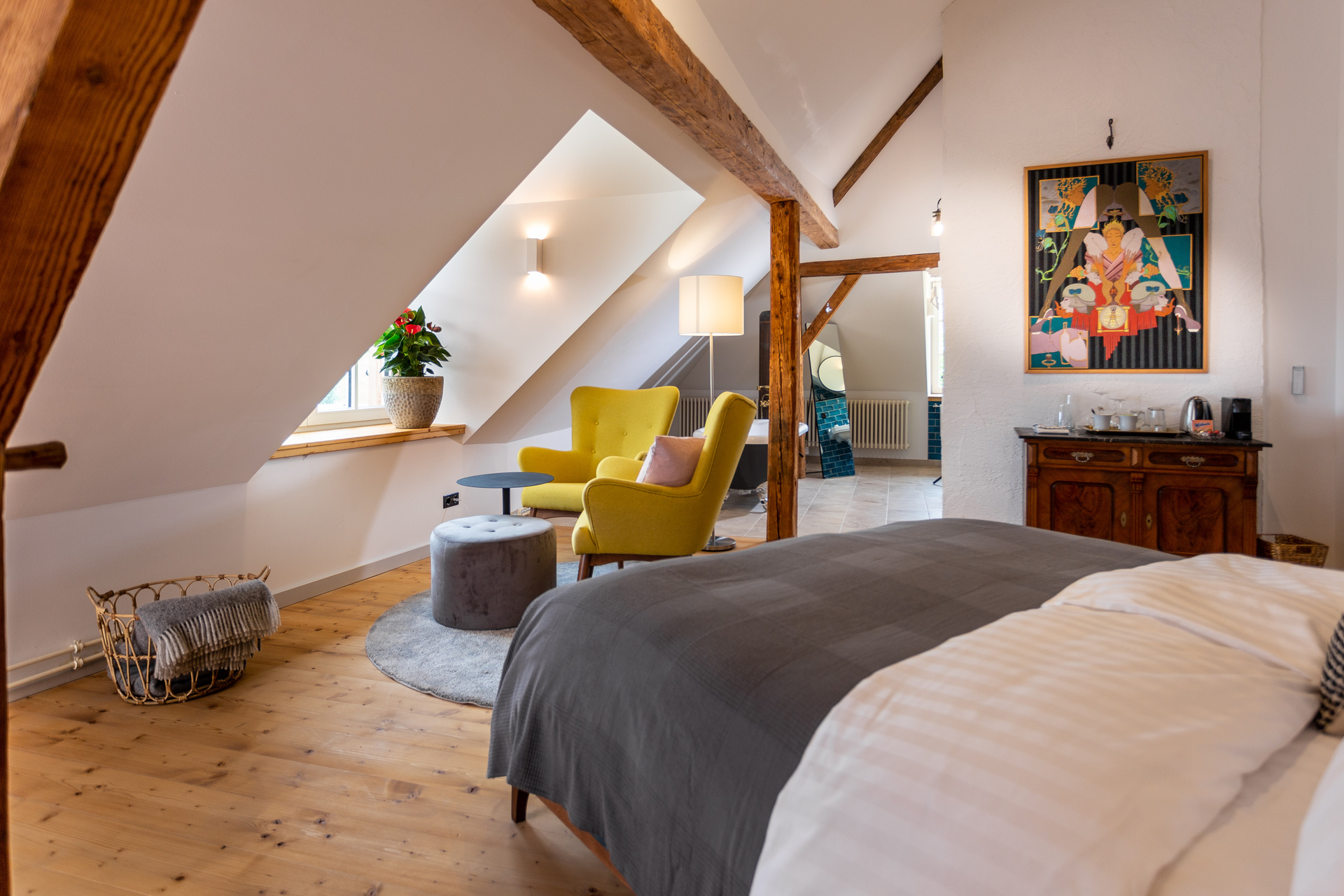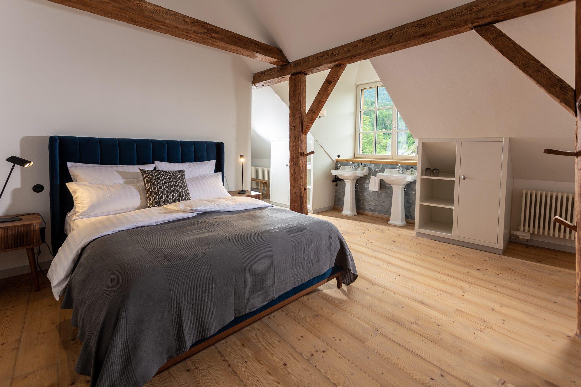 Ein wesentlicher Bestandteil der Planung war die Nutzung des großvolumigen Daches, welches über zwei Geschosse ausgebaut wurde, wobei der historische Dachstuhl mit gehacktem Holz aus dem 15. Jhd. belassen und, wo notwendig, statisch verstärkt wurde.