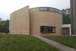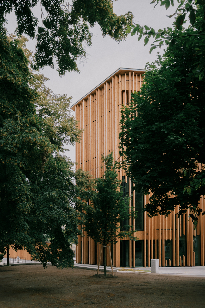 Nicht so beim jüngsten Neuzugang. Eine Art niedriger Turm, gehüllt in Holzlamellen, hinter denen Fensterflächen dunkle Diagonalen zeichnen. Der Eingang ein Trichter aus Sichtbeton, gestaffelt wie das Stufenportal einer Kathedrale. Also eine Kirche? Wobei, die Holzfassade sieht eher nach einem Forschungszentrum aus. Aber wozu dann die riesige Loggia im zweiten Stock mit Blick auf den Park und seinen alten Baumbestand? Ein Beobachtungsposten für Eichhörnchenfans? Oder doch ein Museum? Aber was für eines?
