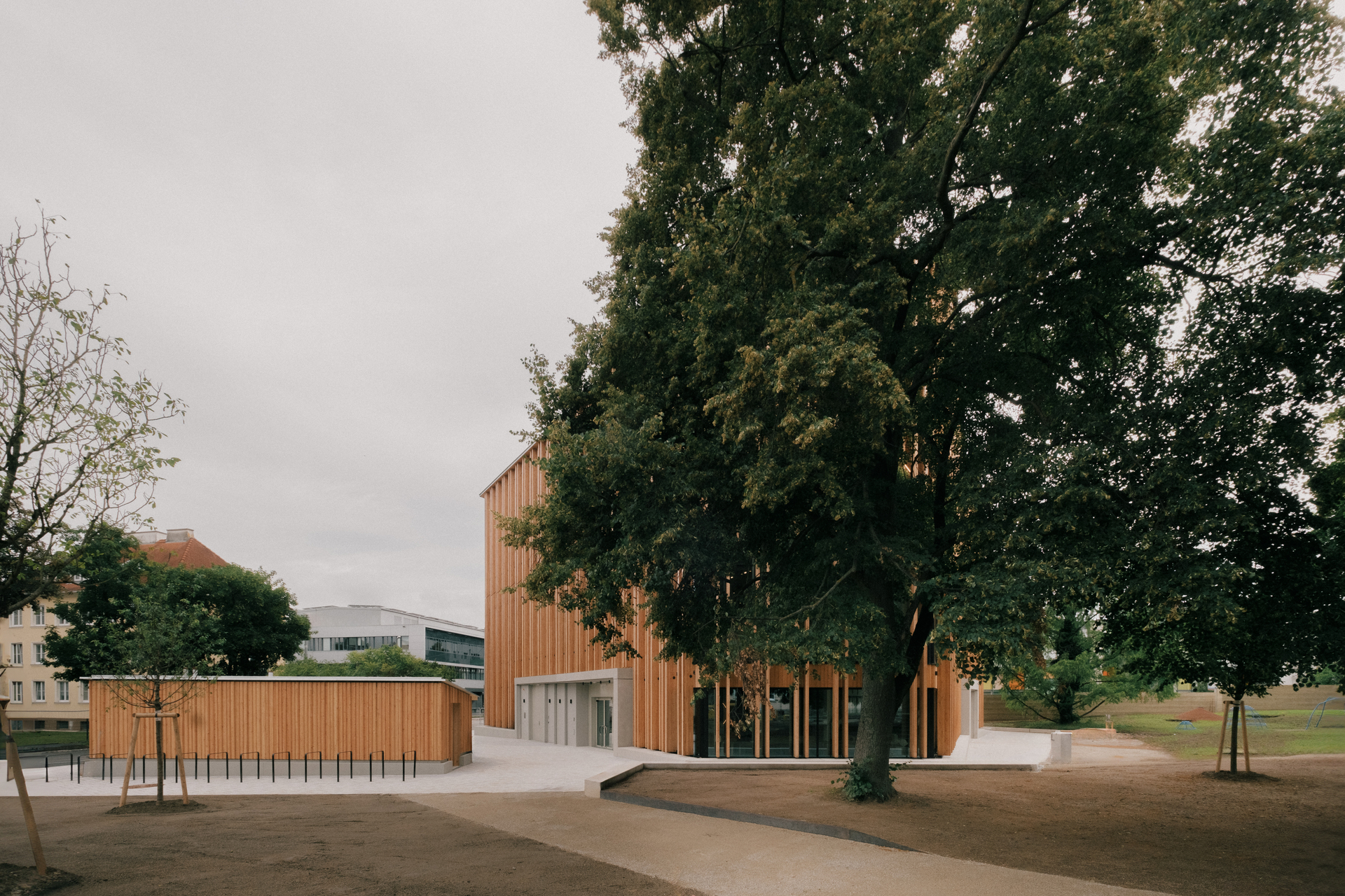 Den ausgelobten Architekturwettbewerb gewann das Wiener Büro Schenker Salvi Weber, und das, wie Michael Salvi erzählt, mit großer Freude. Denn wann hat man als Architekt schon Gelegenheit, einen Gebäudetyp zu entwerfen, für den es kein Vorbild, keinen Normenkatalog, kein Handbuch gibt? Hilfestellung kam vom Kinderbeirat, der den Entwurfsprozess fachlich begleitete, für die Architekten eine beglückende Erfahrung, sagt Salvi. „Wir wollten nicht didaktisch, sondern mit Freude an die Sache herangehen und die Ideen der Kinder ernst nehmen. Denn wenn Architektur den Kindern gegenüber wertschätzend ist, ist sie es auch für Erwachsene.“ Das spürt man vor Ort, von außen wie von innen. Hier ist nichts verniedlichend, nichts kindisch, nichts Rot-Gelb-Blau. Es ist ein Haus, das auf eine kantige Art behaglich ist und auf eine elegante Art robust. Kristallin in der Form, aber warm und berührbar im Material. Ein organischer, freundlicher Monolith. Die turmähnliche Form ergab sich daraus, dass die Architekten so viel wie möglich vom Park erhalten und diesem einen räumlichen Halt am Rand geben wollten.