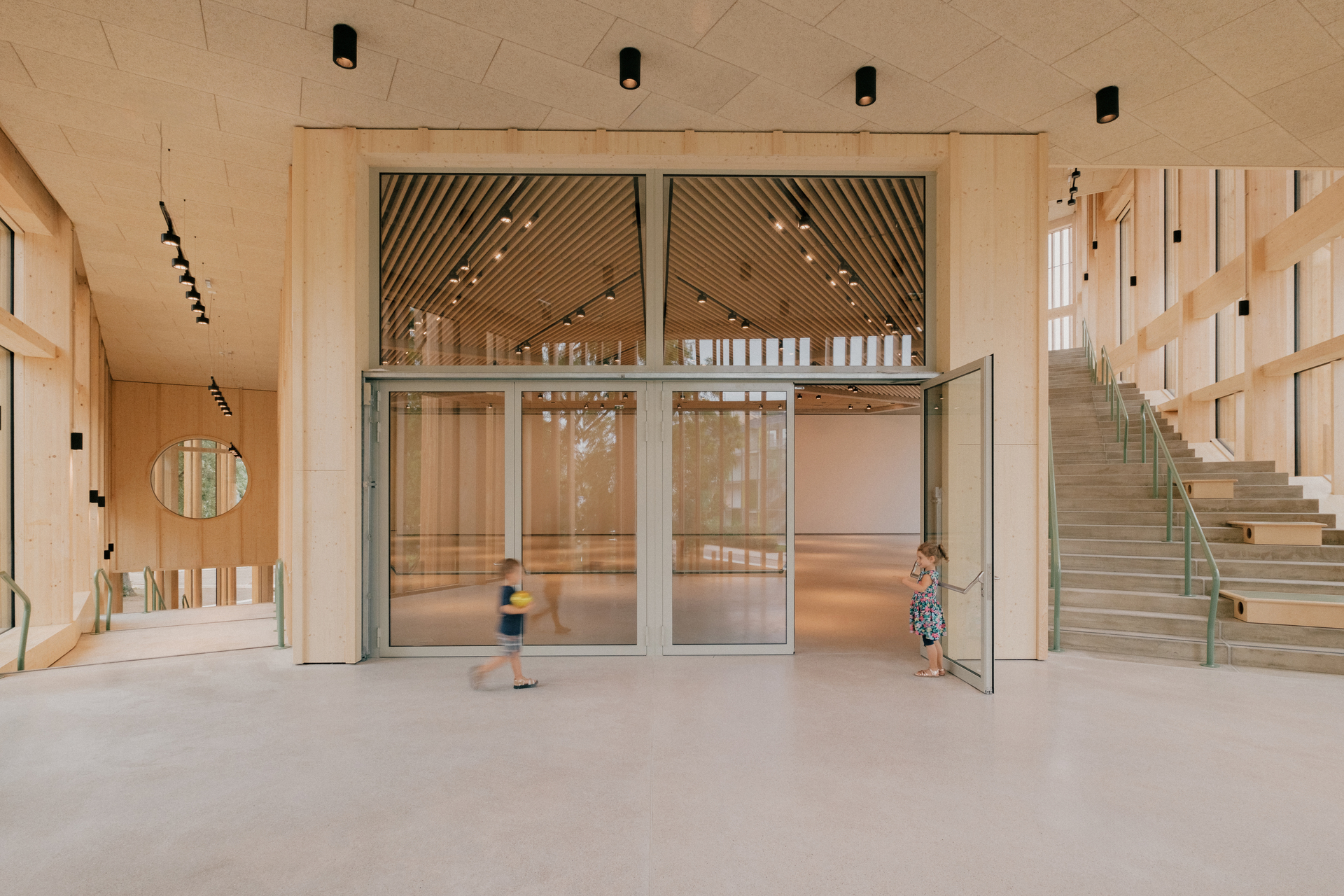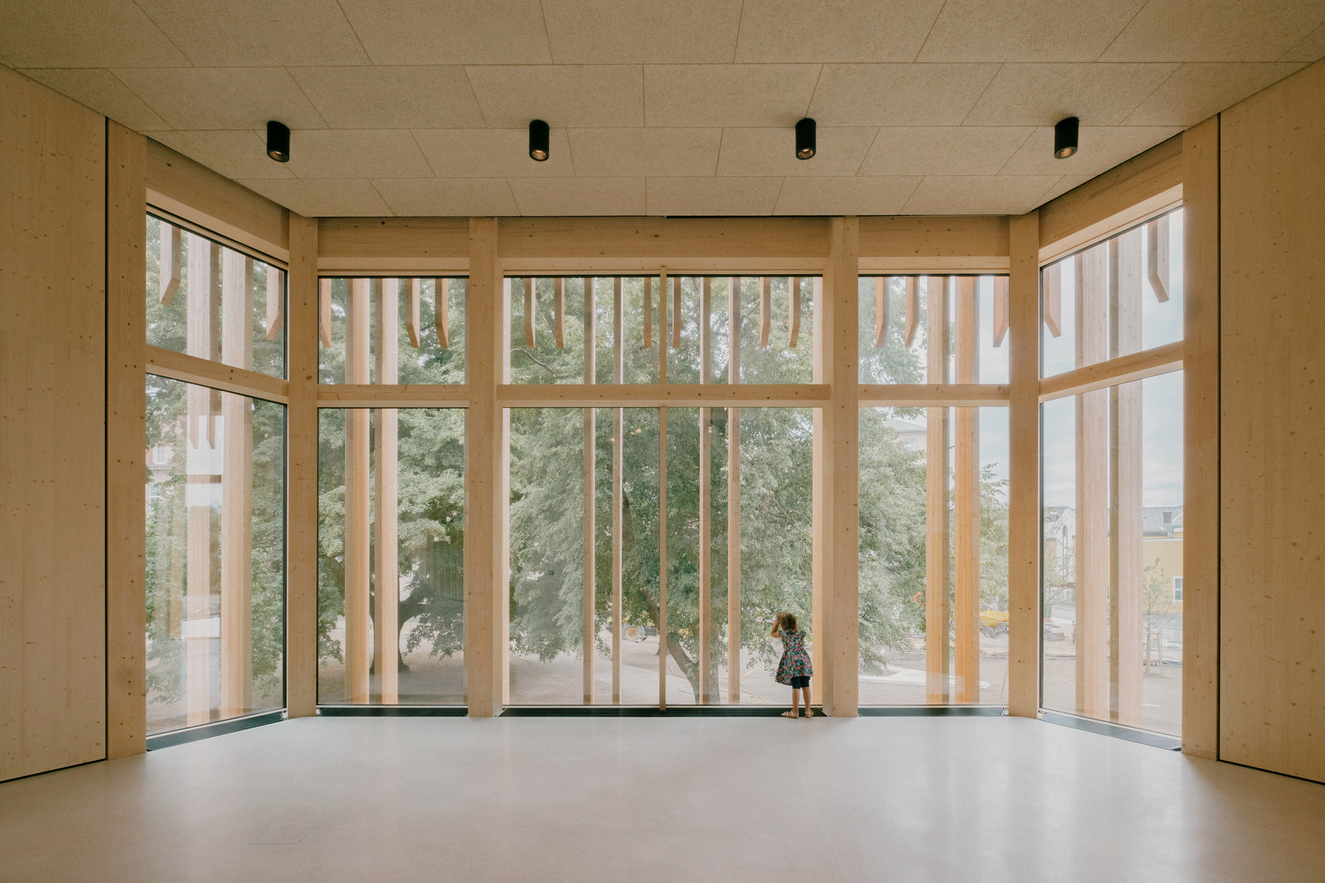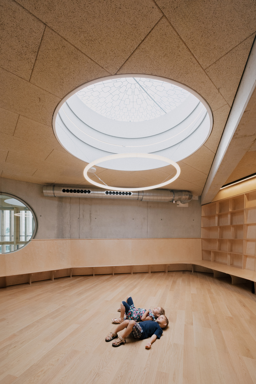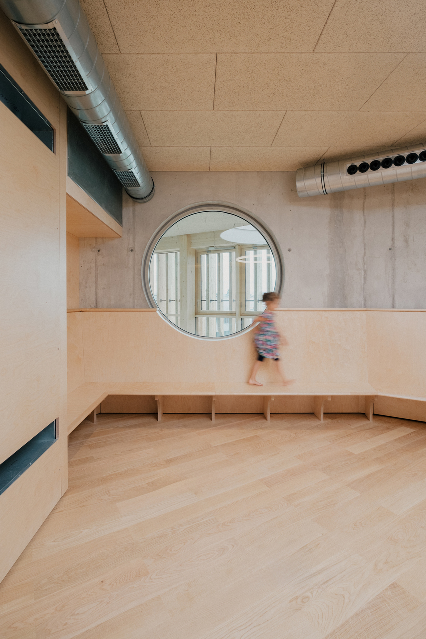 Als Form wählten sie ein gleichseitiges Dreieck mit stumpfen Ecken, an allen drei Seiten knickt die Fassade leicht nach innen. Da der Weg durchs Haus an der Fassade entlangführt, ergibt sich so eine Sogwirkung im Bewegungsablauf, ein Kontinuum an einladenden Gesten und belohnenden Blickrichtungen, Futter für unstillbare Neugier. Es sollten, sagt Michael Salvi, euphorische, feierliche Räume werden. Das mag etwas sakral klingen, bedeutet aber einfach, dem Kind nicht eine Schrumpfversion der Welt anzubieten, sondern im Gegenteil besonders große Türen in diese zu öffnen.