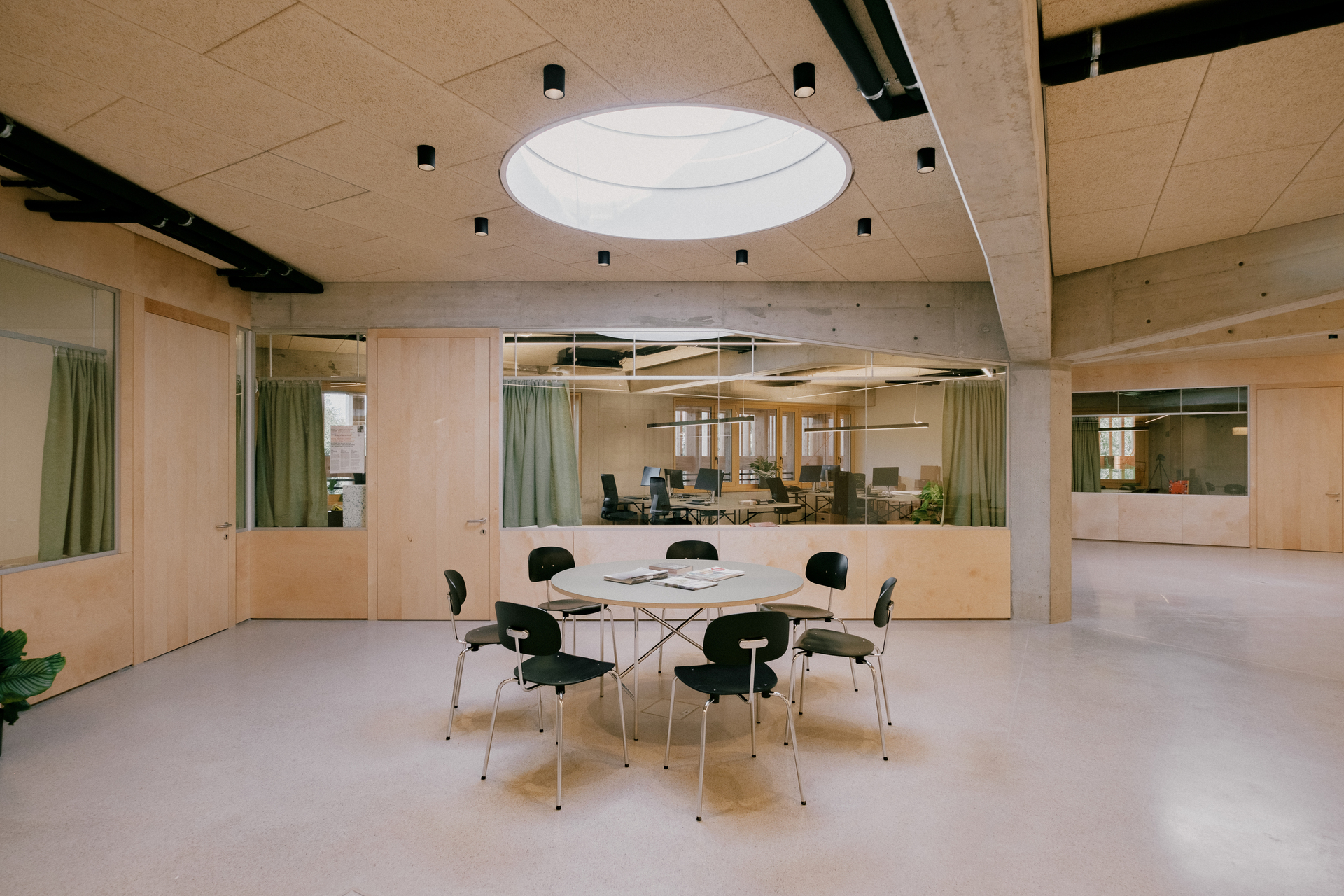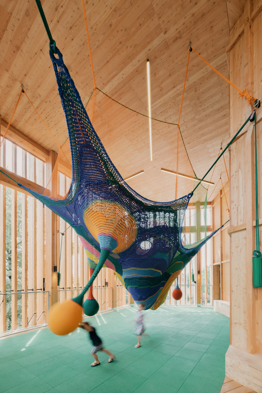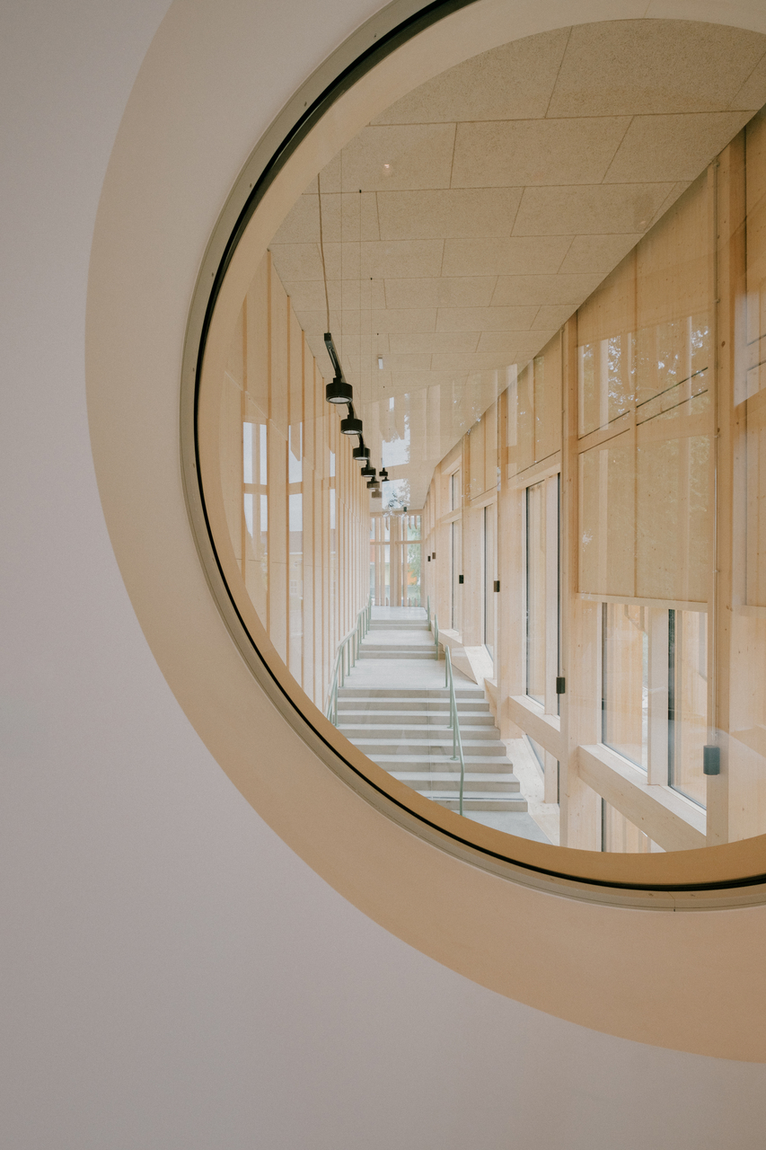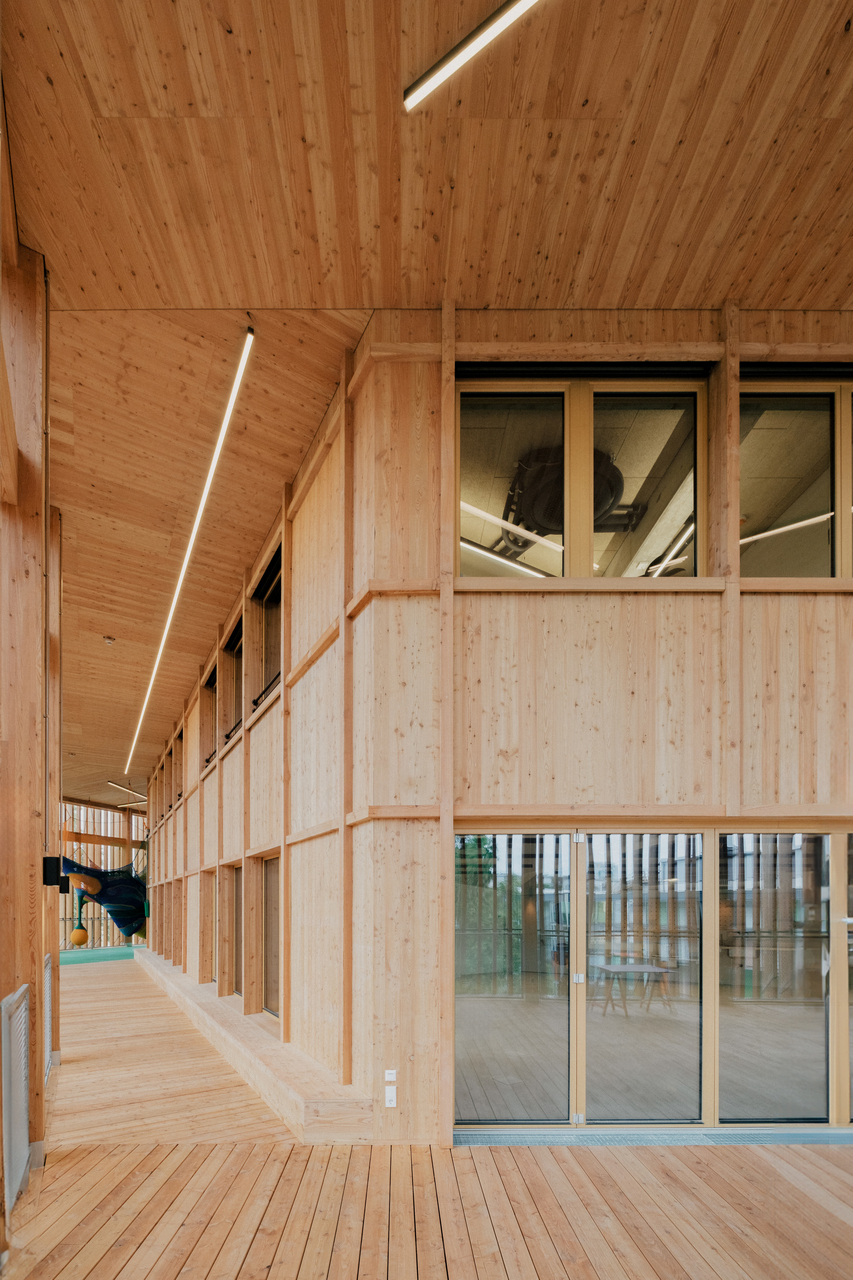 Als Form wählten sie ein gleichseitiges Dreieck mit stumpfen Ecken, an allen drei Seiten knickt die Fassade leicht nach innen. Da der Weg durchs Haus an der Fassade entlangführt, ergibt sich so eine Sogwirkung im Bewegungsablauf, ein Kontinuum an einladenden Gesten und belohnenden Blickrichtungen, Futter für unstillbare Neugier. Es sollten, sagt Michael Salvi, euphorische, feierliche Räume werden. Das mag etwas sakral klingen, bedeutet aber einfach, dem Kind nicht eine Schrumpfversion der Welt anzubieten, sondern im Gegenteil besonders große Türen in diese zu öffnen.