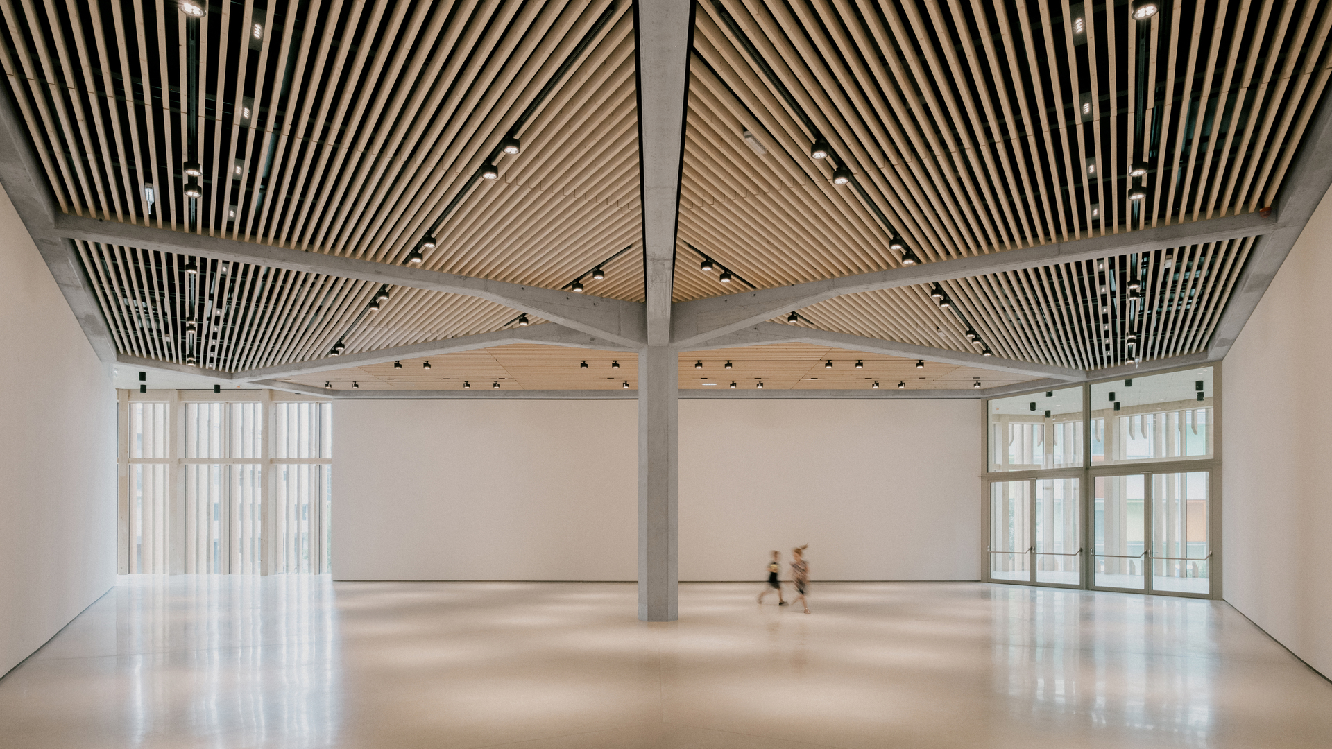 Das, was das Museum zum Museum macht, der eigentliche Ausstellungsraum, bildet das Herz des Ganzen, das Dreieck im Dreieck. Nicht nur in der Kontur ein ungewöhnlicher Raum, sondern auch in der Struktur. Versuchen Architekten und Kuratoren normalerweise mit allen Mitteln, aus Museumsräumen stützenfreie White Cubes zu machen, wurde hier die Statik der komplexen Geometrie auf ganz naheliegende Weise gelöst: durch eine selbstbewusste dicke Stütze genau in der Mitte.