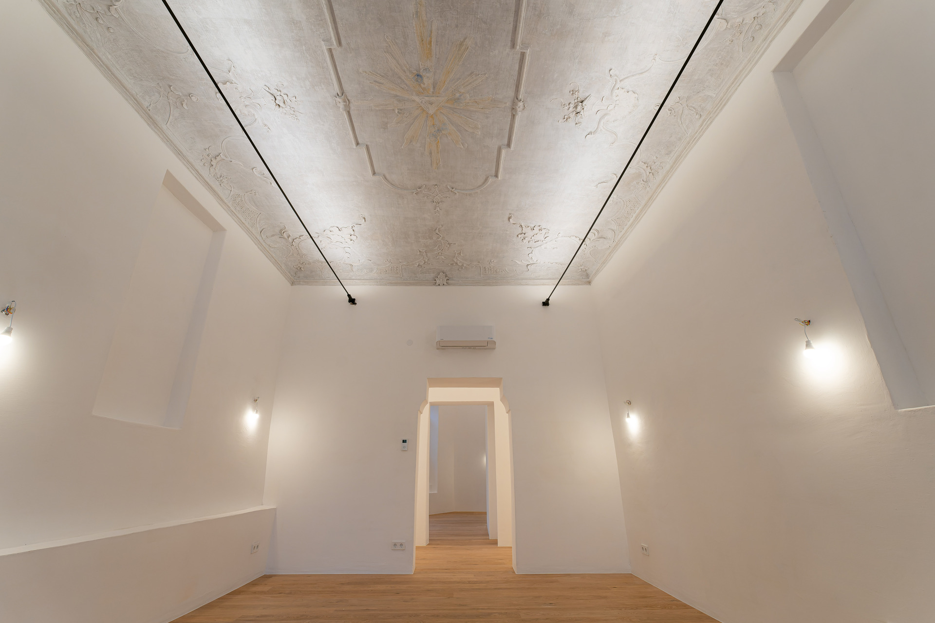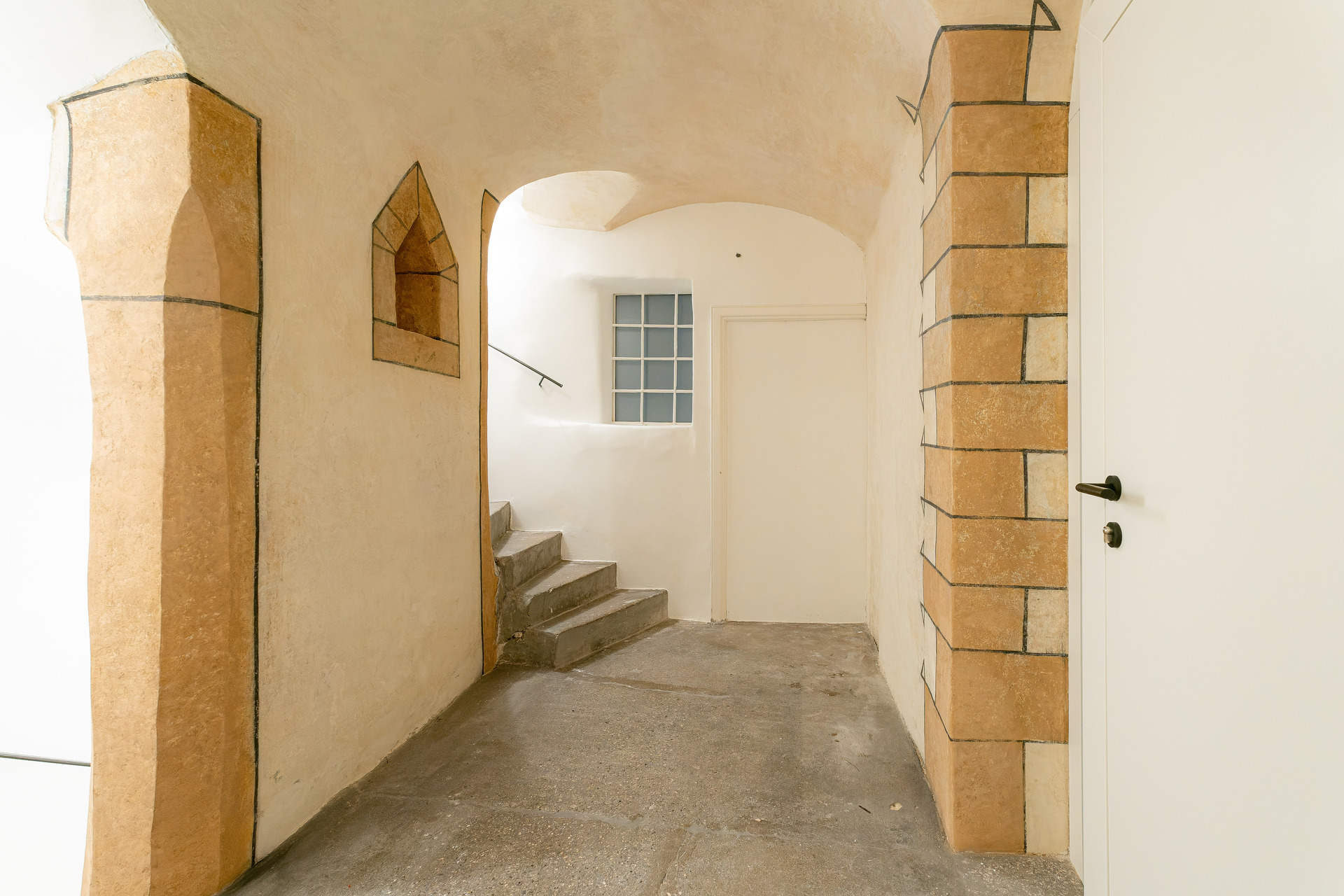 Die einstige Vorstadt Nonntal liegt am Fuße des Stiftes Nonnberg, dem weltweit ältesten Frauenkloster mit ununterbrochener Tradition. Die meisten Häuser stehen hier direkt oder indirekt im Zusammenhang mit dem Kloster, so auch das 1380 erstmals erwähnte Haus in der Nonntaler Hauptstraße 22. Im Zuge der Revitalisierung dieses Objekts, das sich baulich bereits in einem bedenklichen Zustand befand, konnte ein reiches kulturelles Erbe erhalten und wieder instandgesetzt werden. Reicher Stuckdekor des Rokokos und des Klassizismus wurde freigelegt und restauriert. Überraschenderweise tauchten am Deckengewölbe in einer ehemaligen Sakristei, die heute als Foyer dient, Stuckdekore unter einer Putzschicht aus Zement auf. Als Ausstattung des rund 500 Jahre alten gotischen Stiegenhauses wurden Reste einer ockergelben gotischen Wandmalerei entdeckt und wieder sichtbar gemacht.Die ursprünglich geplante studentische Nutzung wurde im Zuge der Planungen zugunsten einer dem Gebäudebestand besser entsprechenden Einteilung mit wenigen größeren Wohneinheiten geändert. Neben dem Geschäftslokal im Erdgeschoss, der ehemaligen Kapelle, entstanden zwei Wohneinheiten im Hauptgeschoss und zwei Maisonetten im Dachraum. Der neue Lift konnte so positioniert werden, dass keine wertvollen Gewölbe tangiert wurden. Die bestehende desolate Grabendachkonstruktion musste aufgrund der Vorschrift des Denkmal- und des Altstadtschutzes formgleich ersetzt werden. Durch den Einbau einer Stahlkonstruktion im zweigeschossigen Dachbereich wurde das Haus von Grund auf stabilisiert. Sie ist frei sichtbar, von der Außenhaut klar abgesetzt und trägt eingehängte Galeriedecken aus Brettsperrholz. Der Respektabstand zwischen Stahlrahmen und Bestandswänden lässt durchgängige Lufträume mit spannenden Raumverbindungen zu. Die Hinterleuchtung der Träger betont dieses Zusammenspiel.