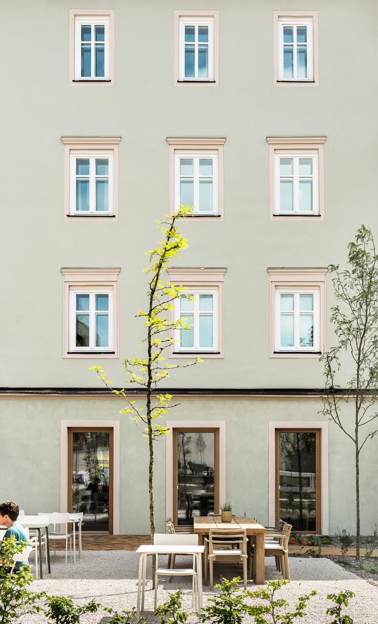 Dank der nahezu geschlossenen Bauweise entstand ein vom enormen Verkehrsaufkommen an der Saint-Julien- und der Elisabethstraße abgeschotteter Innenhof. Auf der vormals asphaltierten Parkplatzfläche befindet sich nunmehr ein begrünter Innenhof im Ausmaß von 5.000 m². Diese Freifläche mit Blüh- und Nutzgarten sowie einer ausgedehnten Spiellandschaft bieten sowohl den Hotelgästen als auch den Bewohner:innen eine Oase der Erholung und Entspannung inmitten der Stadt.