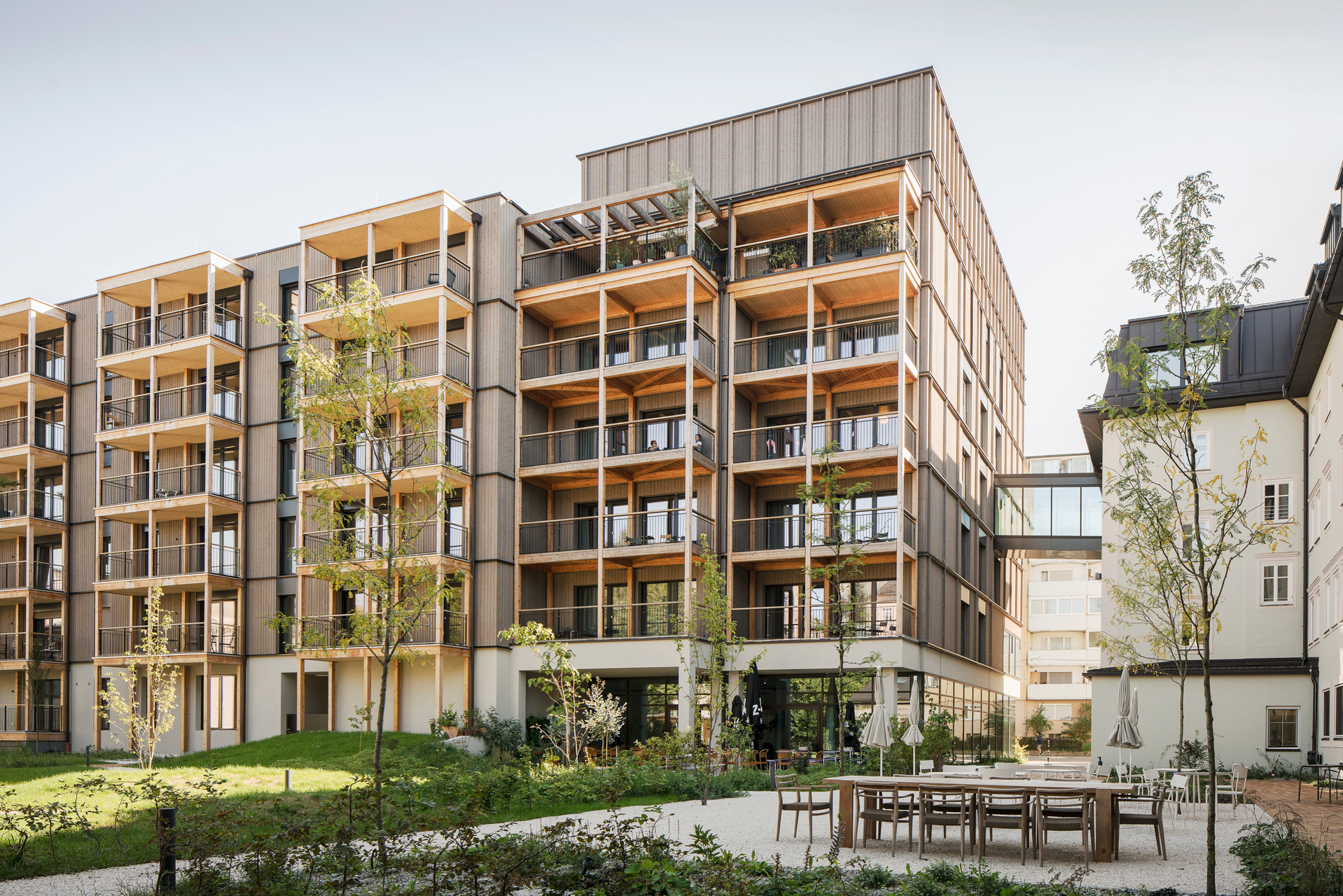 Für die beiden Anbauten wurden insgesamt an die 1.000 Kubikmeter Holz verbaut. Die großformatigen CLT-Massivholzplatten in Sichtholzqualität sind energieeffizient, langlebig, recycelbar, hoch belastbar und CO2-neutral. Das Material Holz ist für die Bewohner:innen auch innen spürbar: Sichtbare Holzdecken und -wände sorgen für eine warme Atmosphäre und ein besonderes Wohngefühl. (Text: Roman Höllbacher, nach einem Text der Architekten)