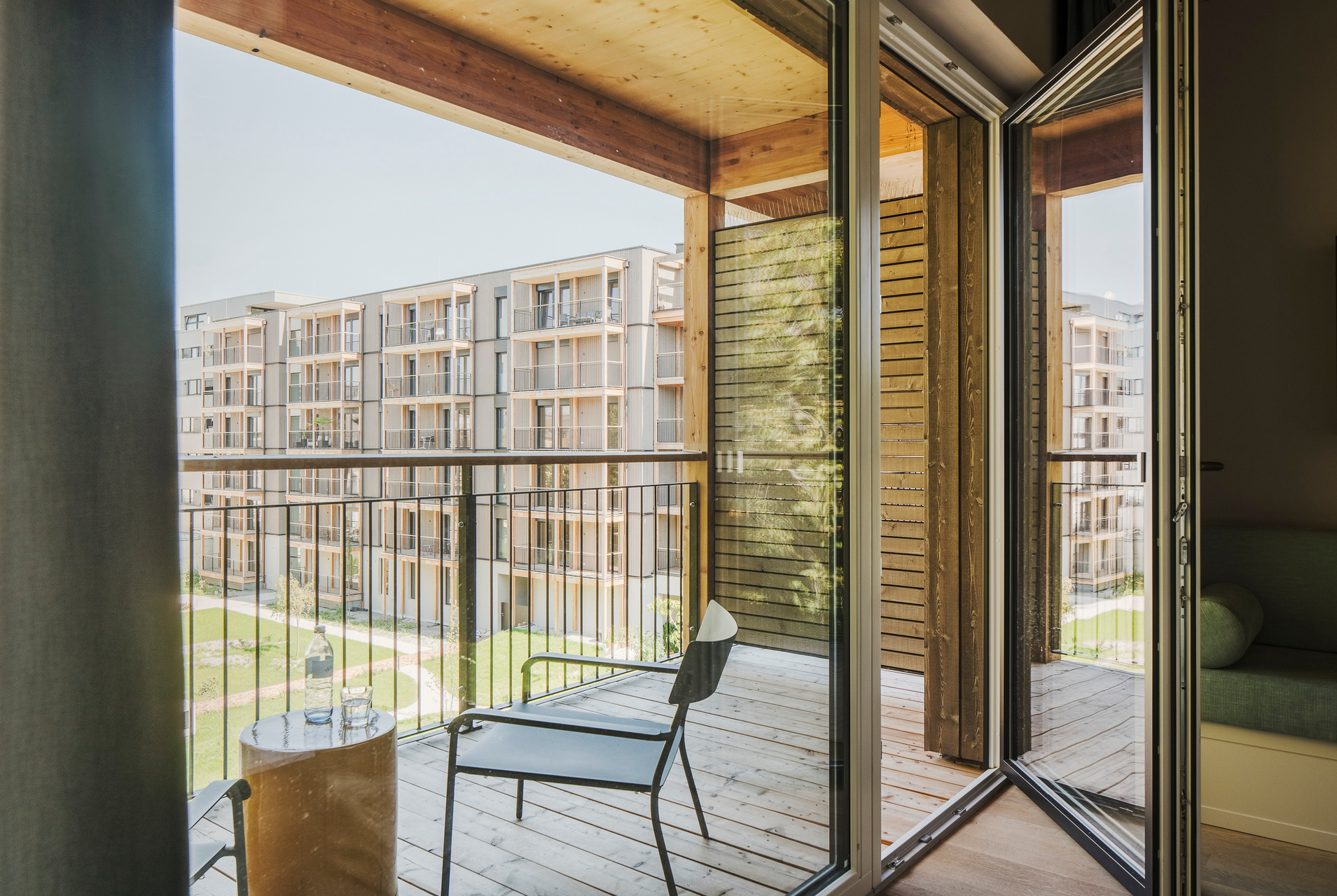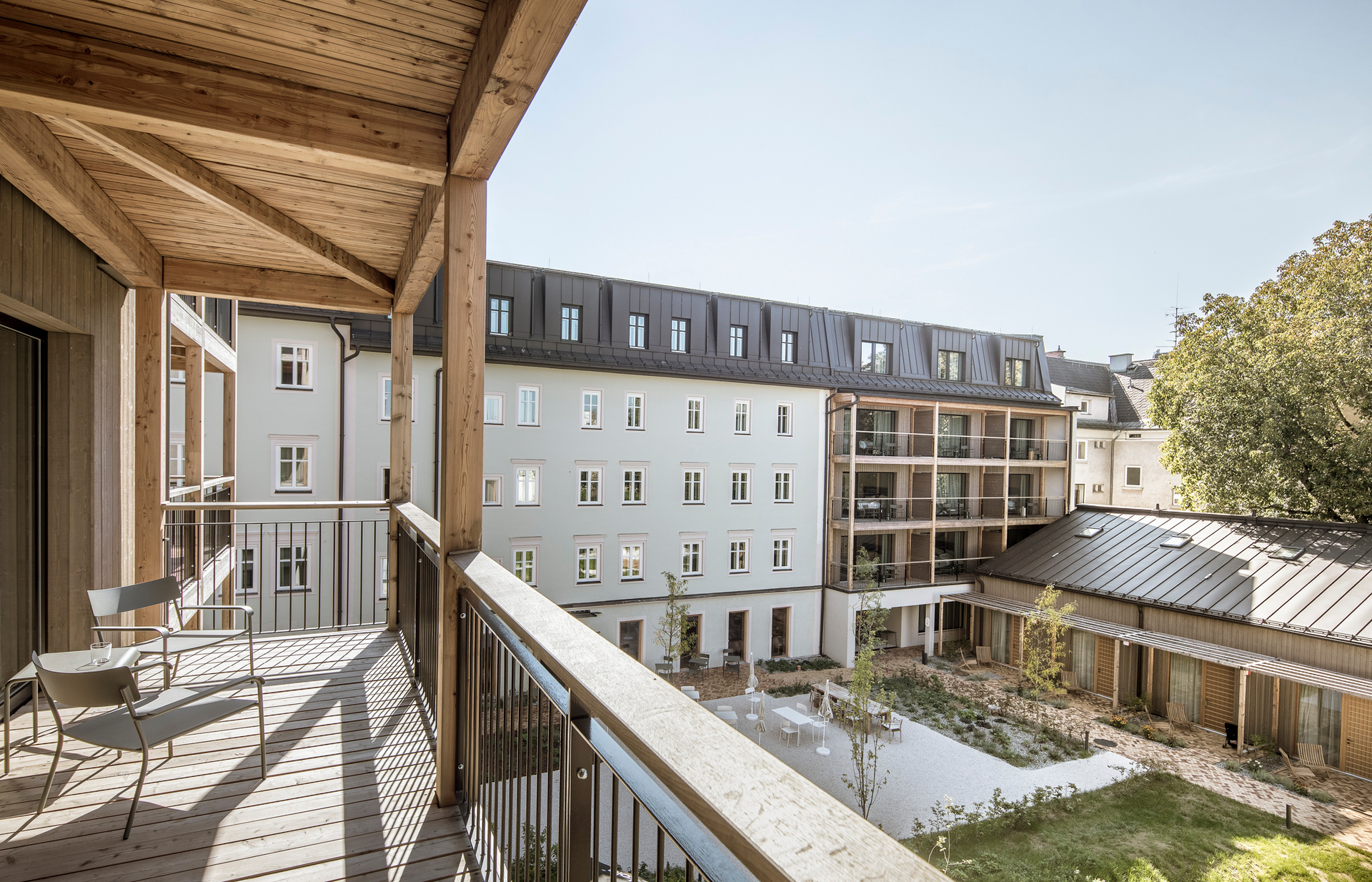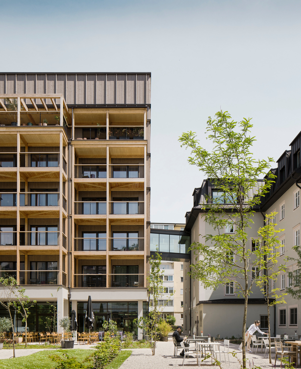 Die Geschichte des Hotels „Zum Hirschen“ in der Elisabeth-Vorstadt in Salzburg reicht bis ins 16. Jahrhundert zurück. Die jetzige Eigentümerfamilie erwarb den Gasthof 1830 und formte daraus einen Gastronomie- und Hotelbetrieb, der nunmehr in der elften (!) Generation durch die Eigentümer geführt wird. Mit dem Bewusstsein, diese Tradition der Gastlichkeit nicht nur zu bewahren, sondern für die Zukunft zu sichern, wurde das bestehende Hotel sanft entstaubt und um moderne Akzente ergänzt. Unter dem Namen „Am Hirschengrün“ entstanden neben dem kernsanierten Hotel auch eine Erweiterung der Hotelnutzung an der St.-Julien-Straße, ein weiterer Baukörper mit 40 frei finanzierten Eigentums- und Mietwohnungen, Gastronomie- und Büroflächen sowie eine zweigeschossige Tiefgarage. Letztere stellte im berüchtigten Salzburger Seeton nicht nur eine technische, sondern auch eine finanzielle Herausforderung dar. Ein ehemaliges Nebengebäude des Hotelbetriebs an der Westseite der Liegenschaft wurde im Zuge der Neugestaltung ebenfalls überarbeitet. Es zählt zum Hotel und enthält Familienapartments, die als Maisonetten ausgestaltet sind. Im Erdgeschoss liegen die Aufenthaltsräume und im Dachbereich die Schlafzimmer.Im Sinne der Nachhaltigkeit wurde die Hotelerweiterung sowie der 6-geschossige, L-förmige Wohntrakt in Holz-Hybrid-Bauweise ausgeführt. Letzterer setzt mit seiner nördlichen Stirnseite an die Brandwand des Nachbargebäudes an. An der gegenüberliegenden Stirnseite ist er über eine transparente Brücke im 3. Stock mit dem Hotel an der Ecke Elisabeth-/St. Julien-Straße verbunden. Mit der prägnanten Holzfassade sowie der Staffelung in der Tiefe wie in der Höhe setzt der Bau einen gestalterisch wohltuenden Kontrapunkt gegenüber den monolithischen Wohnblocks der 1960er-Jahre, die das unmittelbare Umfeld prägen.