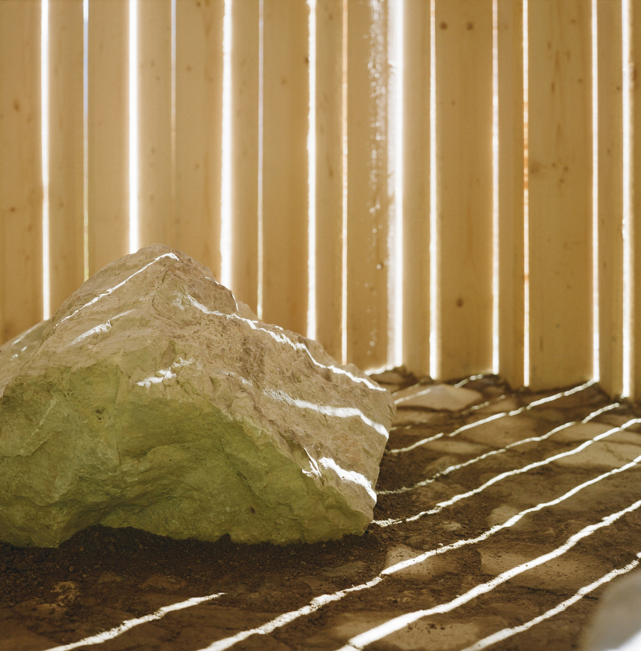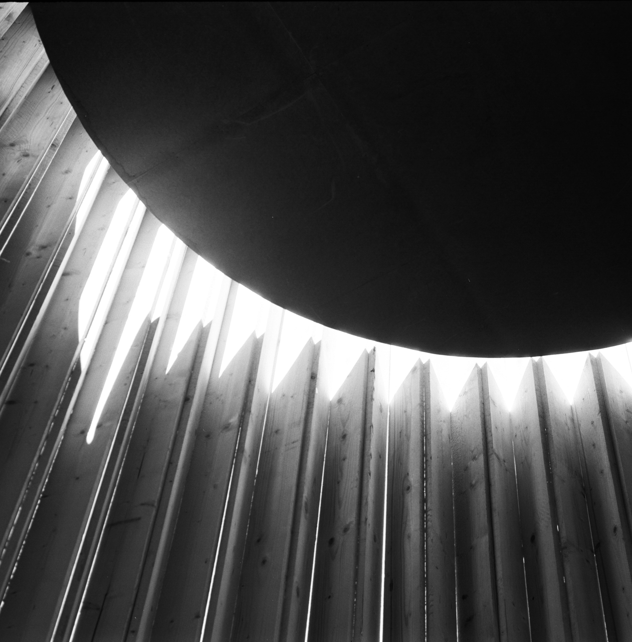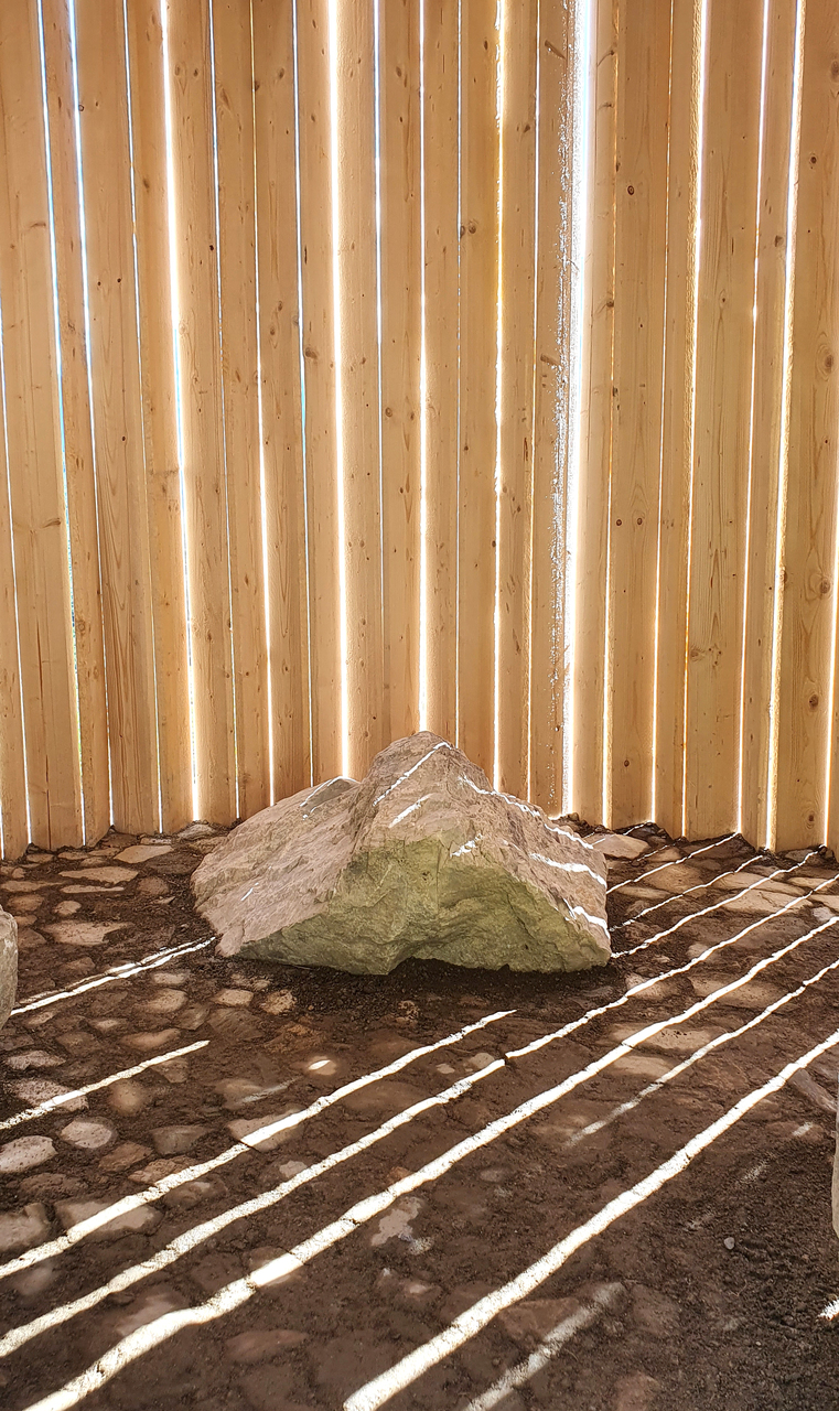 100 sägeraue Holzbretter wurden zig-zag-förmig in einem Kreis angeordnet und an drei Druckringen aus gebogenem Holz befestigt. Dadurch entsteht eine steife Tonnenform. Das flache Dach hat einen um 30 cm kleineren Durchmesser als der Innenraum. Die sichelförmige Dachöffnung schafft zusammen mit den senkrechten, auf Knirsch gesetzten Brettern eine intime, nach oben gerichtete Lichtstimmung. Durch das von allen Seiten einfallende Licht verändert sich die Innenraumatmosphäre je nach Tageszeit und Wetterlage. Drei Findlinge dienten als Sitzflächen.