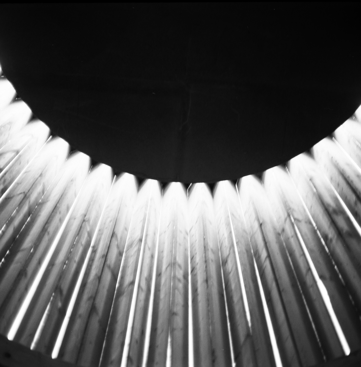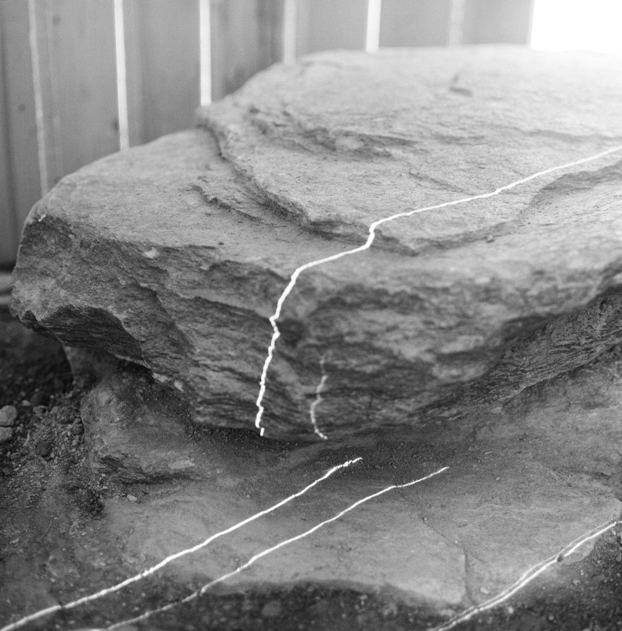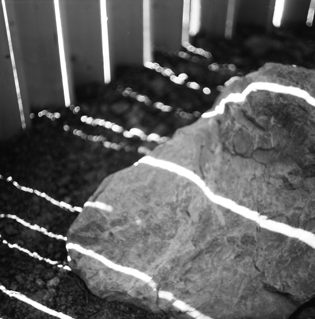 100 sägeraue Holzbretter wurden zig-zag-förmig in einem Kreis angeordnet und an drei Druckringen aus gebogenem Holz befestigt. Dadurch entsteht eine steife Tonnenform. Das flache Dach hat einen um 30 cm kleineren Durchmesser als der Innenraum. Die sichelförmige Dachöffnung schafft zusammen mit den senkrechten, auf Knirsch gesetzten Brettern eine intime, nach oben gerichtete Lichtstimmung. Durch das von allen Seiten einfallende Licht verändert sich die Innenraumatmosphäre je nach Tageszeit und Wetterlage. Drei Findlinge dienten als Sitzflächen.
