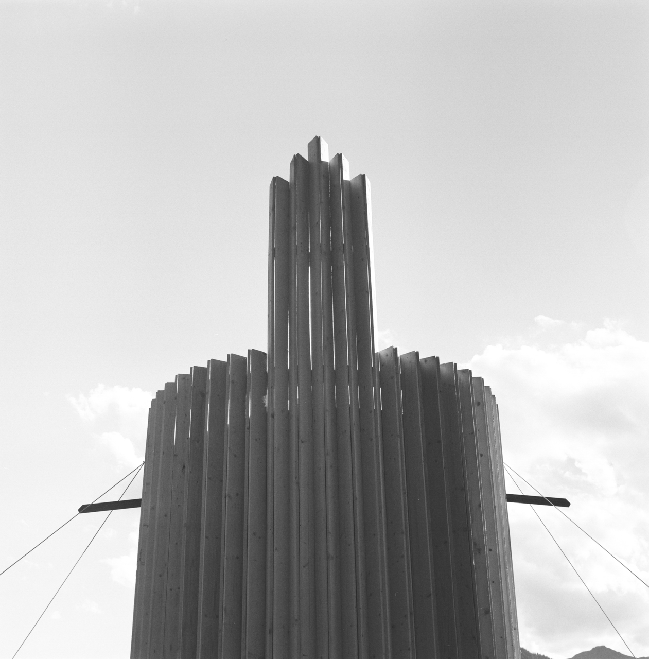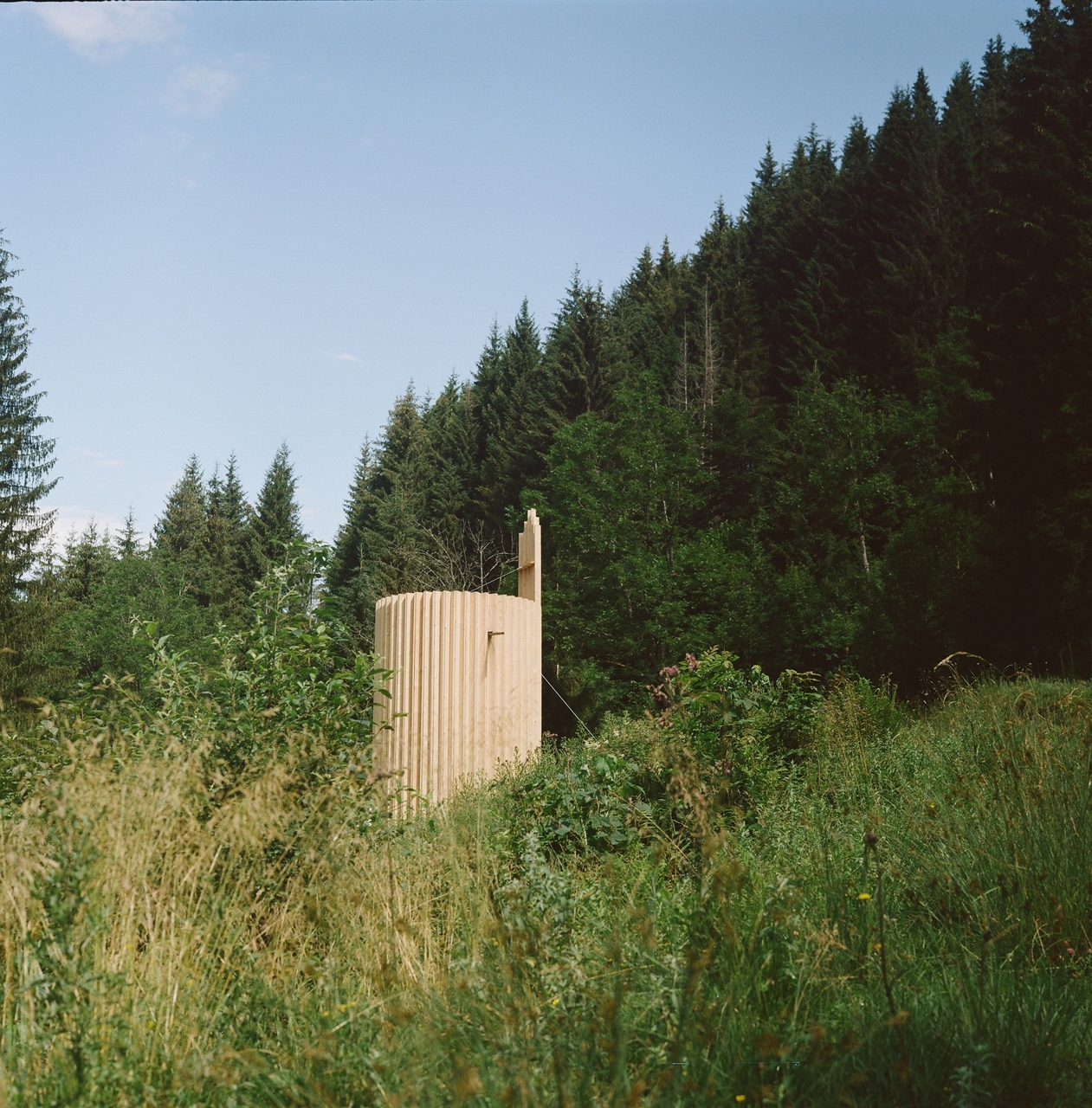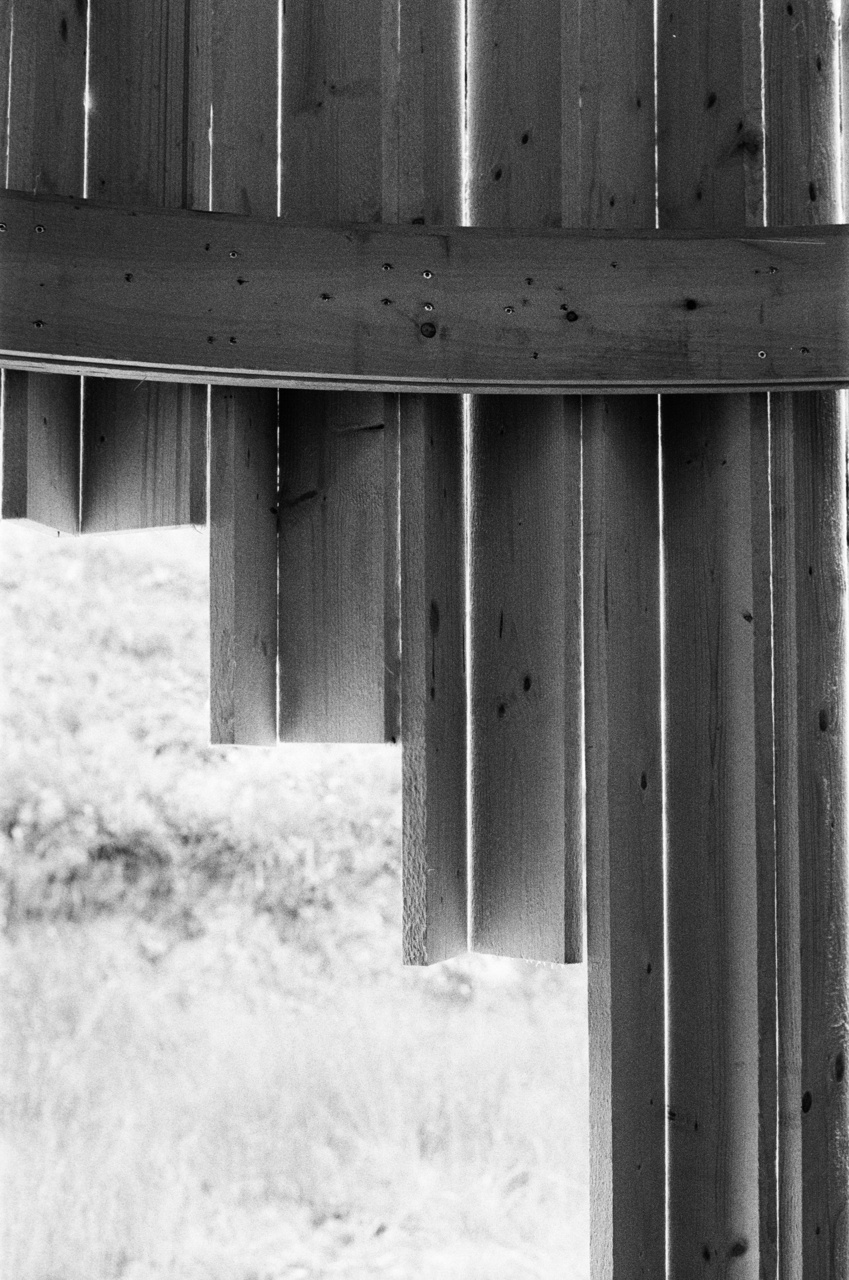 Alle Teile des Gebäudes sind tragend und haben zwei oder mehr Funktionen: die vertikalen, sägerauen Holzbretter sind Stützen und Außenschalung, die U-Profile leiten das Wasser ab und tragen das runde Dach, der Turm formt die Tür und dient als Kontenpunkt für das Dach.