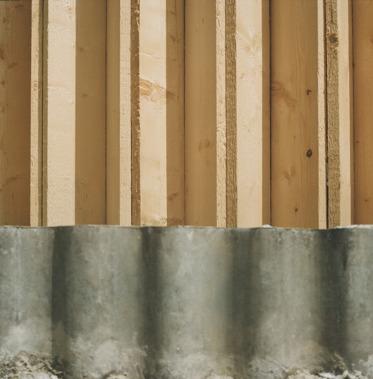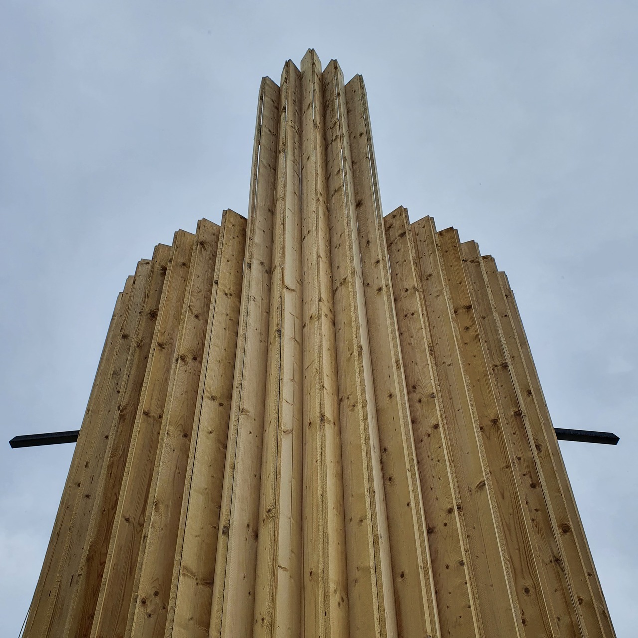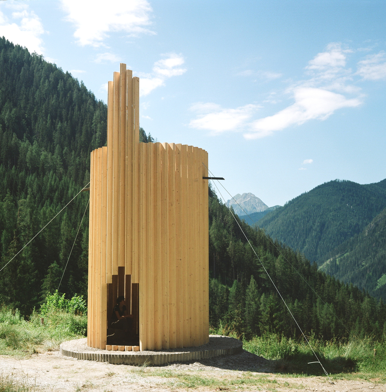 Alle Teile des Gebäudes sind tragend und haben zwei oder mehr Funktionen: die vertikalen, sägerauen Holzbretter sind Stützen und Außenschalung, die U-Profile leiten das Wasser ab und tragen das runde Dach, der Turm formt die Tür und dient als Kontenpunkt für das Dach.