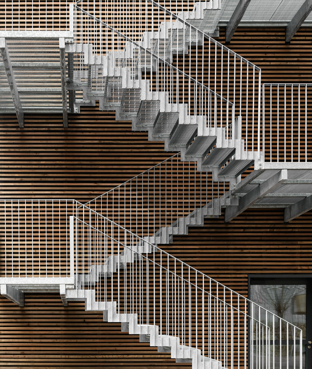 Die außenliegende, minimalistisch gestaltete Fluchttreppe aus Stahl ist als eigenständiges Objekt konzipiert und an jedes einzelne Geschoss angeschlossen.