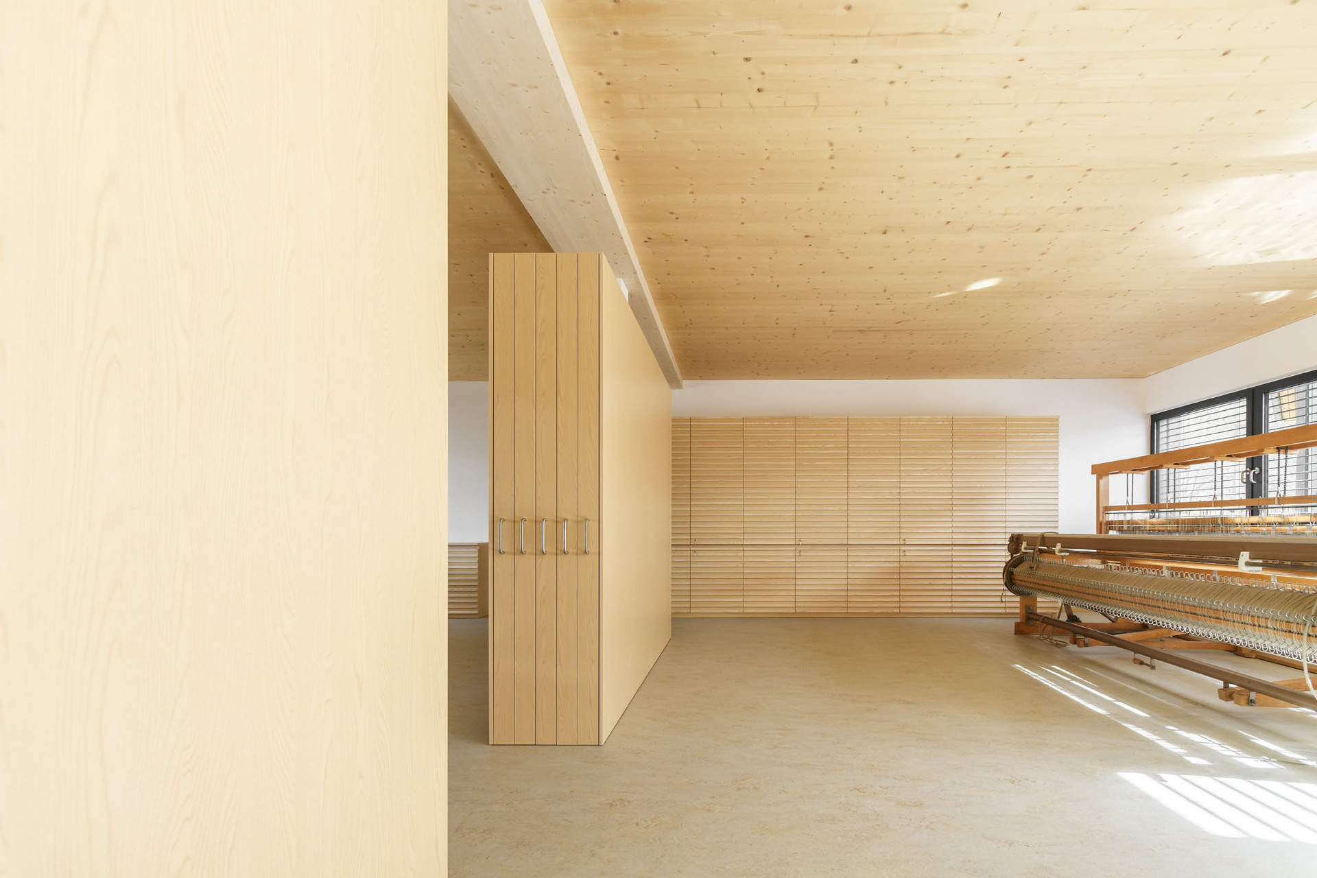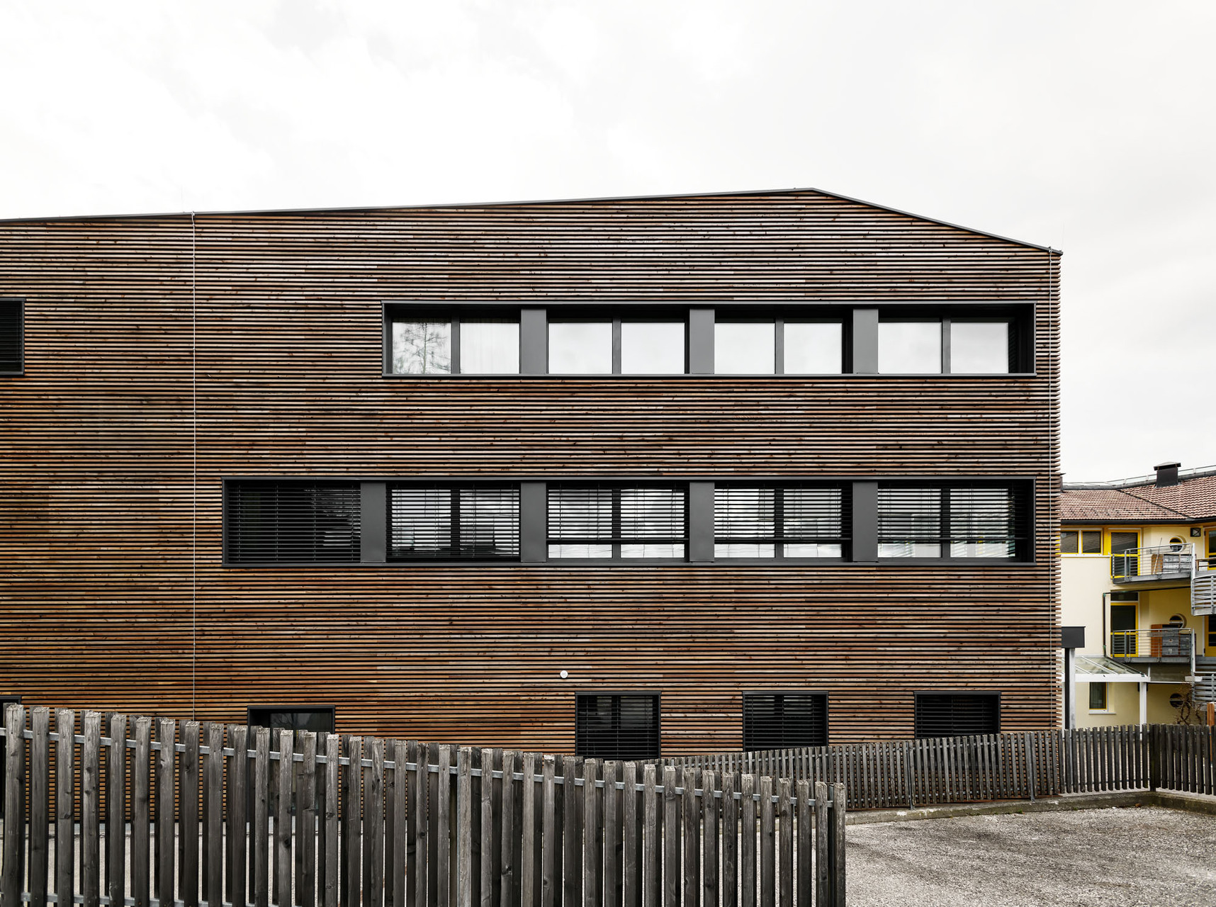 Umlaufende Fensterbänder gliedern das Gebäude horizontal, reduzieren dabei optisch die Gebäudehöhe und lassen von außen die handwerklich genutzten Haupträume erkennen. Über die Fenster der Sanitärräume und des Treppenhauses ist die Holzfassade gezogen; jede zweite Lattung fehlt, wodurch auch die sekundär genutzten Räume ausreichend Tageslicht erhalten.