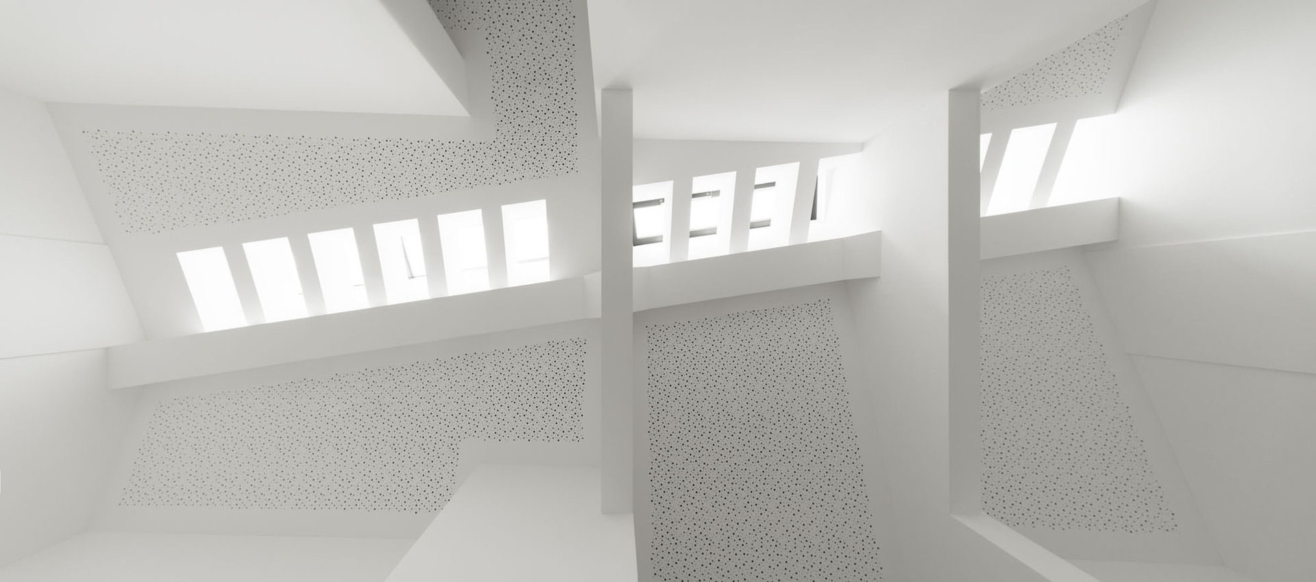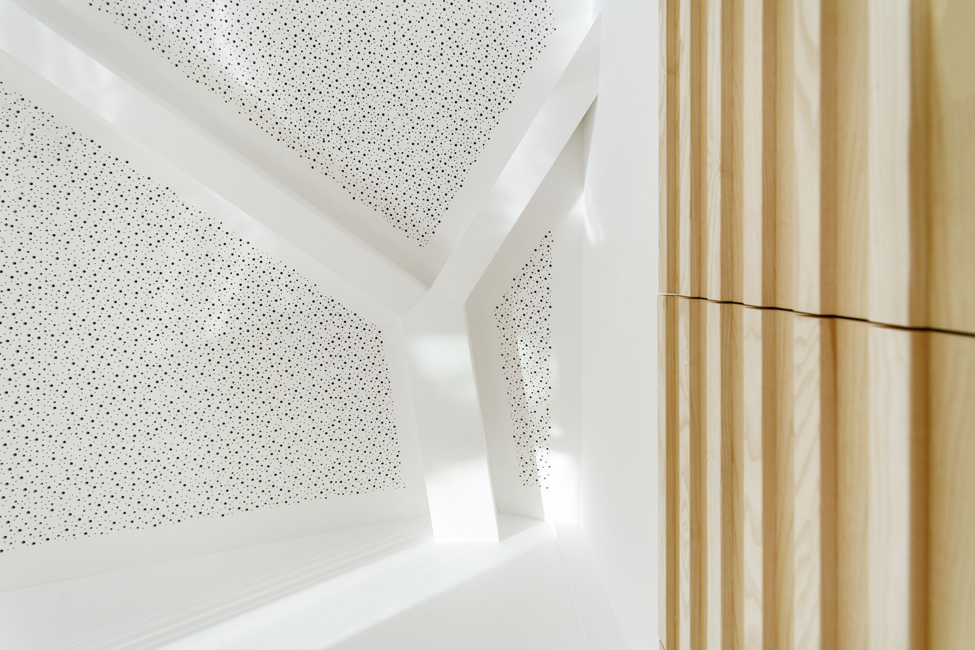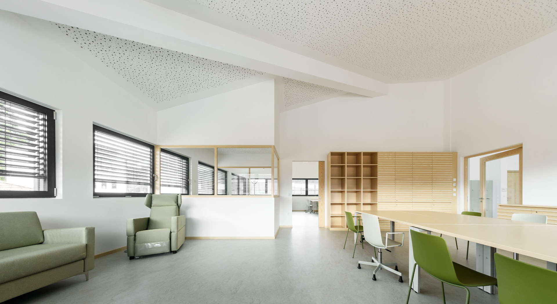 Das neue Volumen ist ohne Unterbrechung der bestehenden Gebäude-Abfolge in den Bestand integriert. Das leicht verdrehte Walmdach des einfachen und leicht verständlichen Baukörpers greift die Sprache des Bestands in modifizierter Form auf und verleiht ihm einen eigenen, klar wahrnehmbaren Charakter. Die Dachform ist im 2. OG auch innen ablesbar.