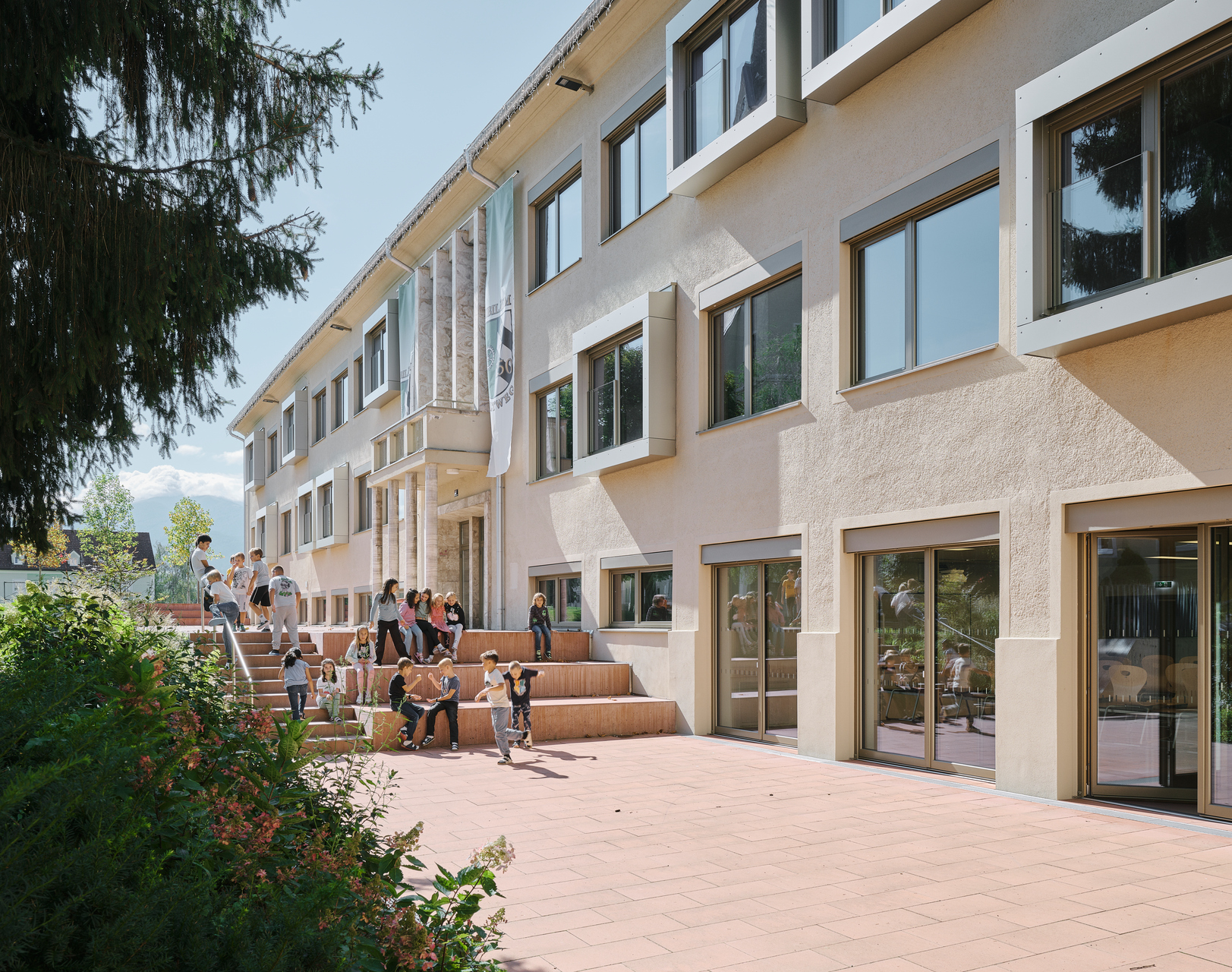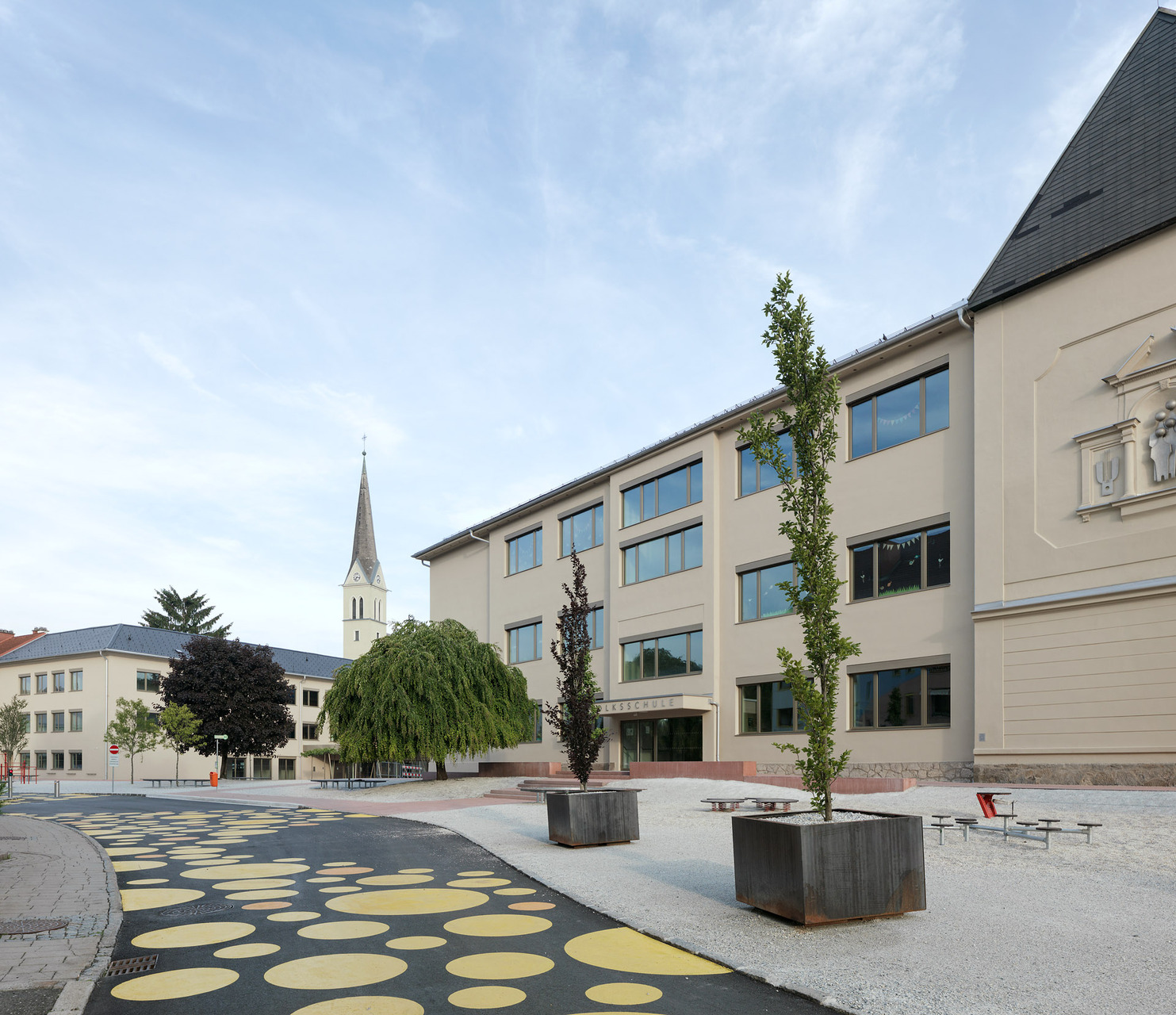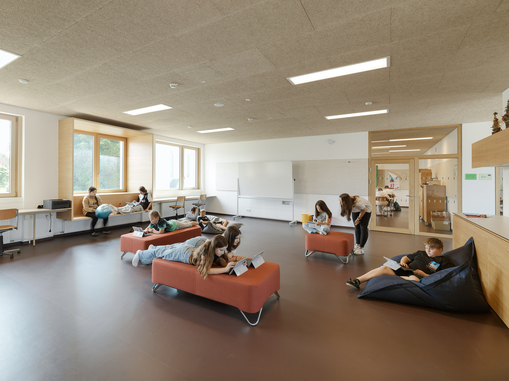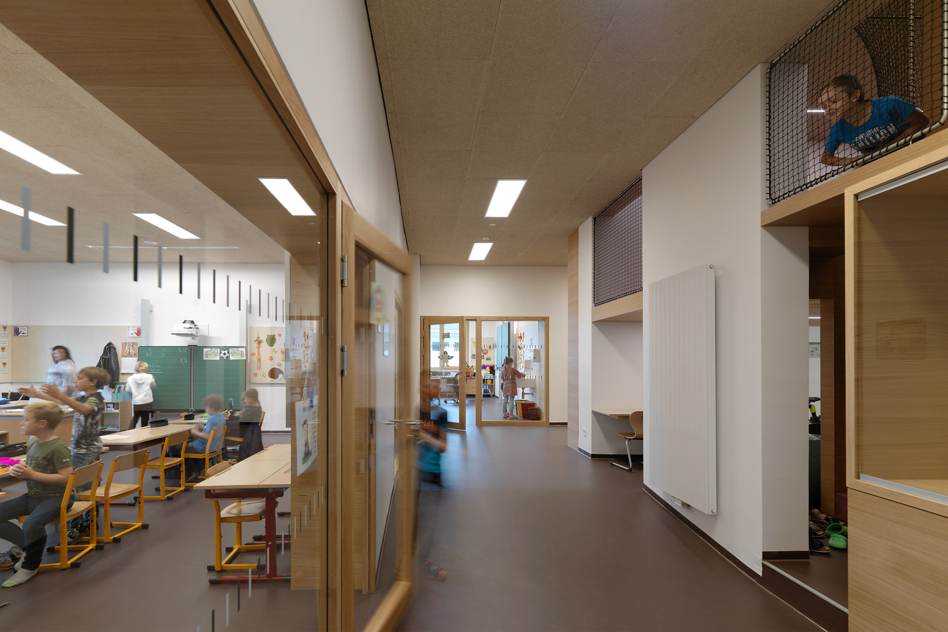 Die VS- und NMS-Cluster, bestehend aus dorfartig vernetzten Klassen, Gruppenräumen und offenen Lernzonen, geben den Lehrer:innen die erforderlichen Möglichkeiten in der zeitgemäßen Unterrichtsgestaltung. Alle Funktionen in den Gebäuden wurden in sinnvollen Raumgruppen organisiert, so zum Beispiel die gemeinsame Verwaltung von VS und NMS im Zentrum des Bildungscampus. Die so genannte „Magistrale“, die die Volksschule über die gemeinsame Bibliothek, Aula, Mehrzweckraum und Verwaltung mit den Werkräumen der NMS und dem Hauptplatz verbindet, bildet eine neue innere Verbindung mit hohen Aufenthaltsqualitäten.
