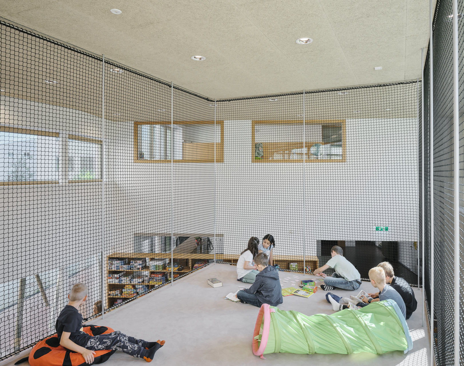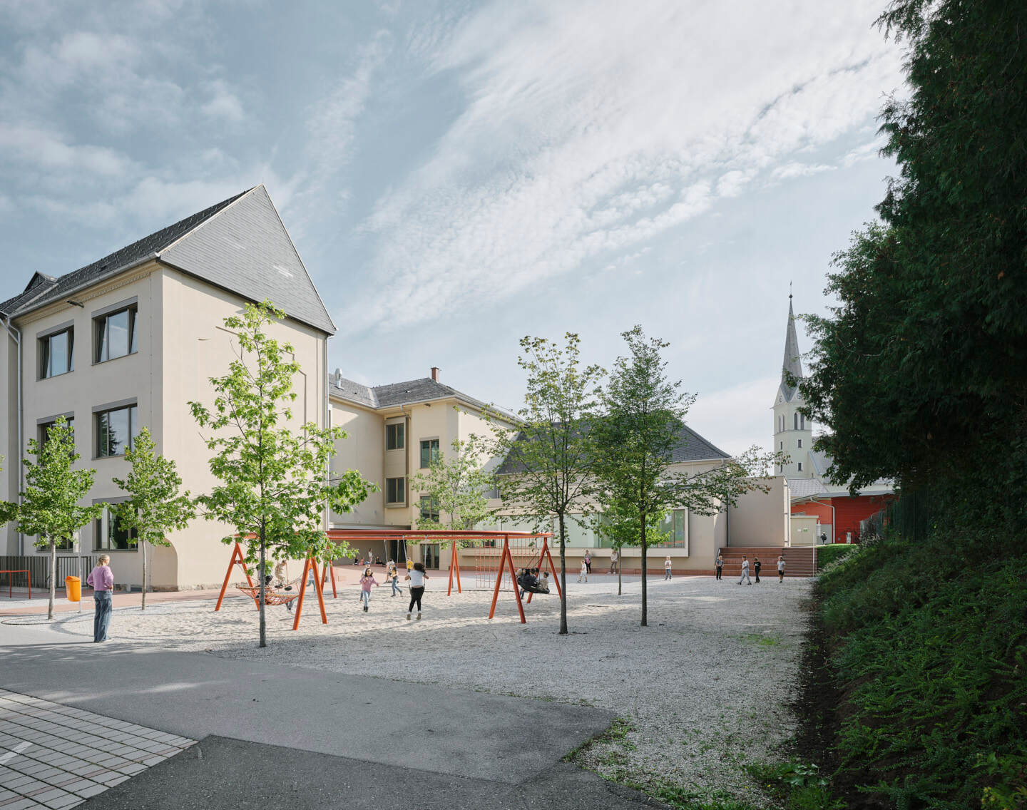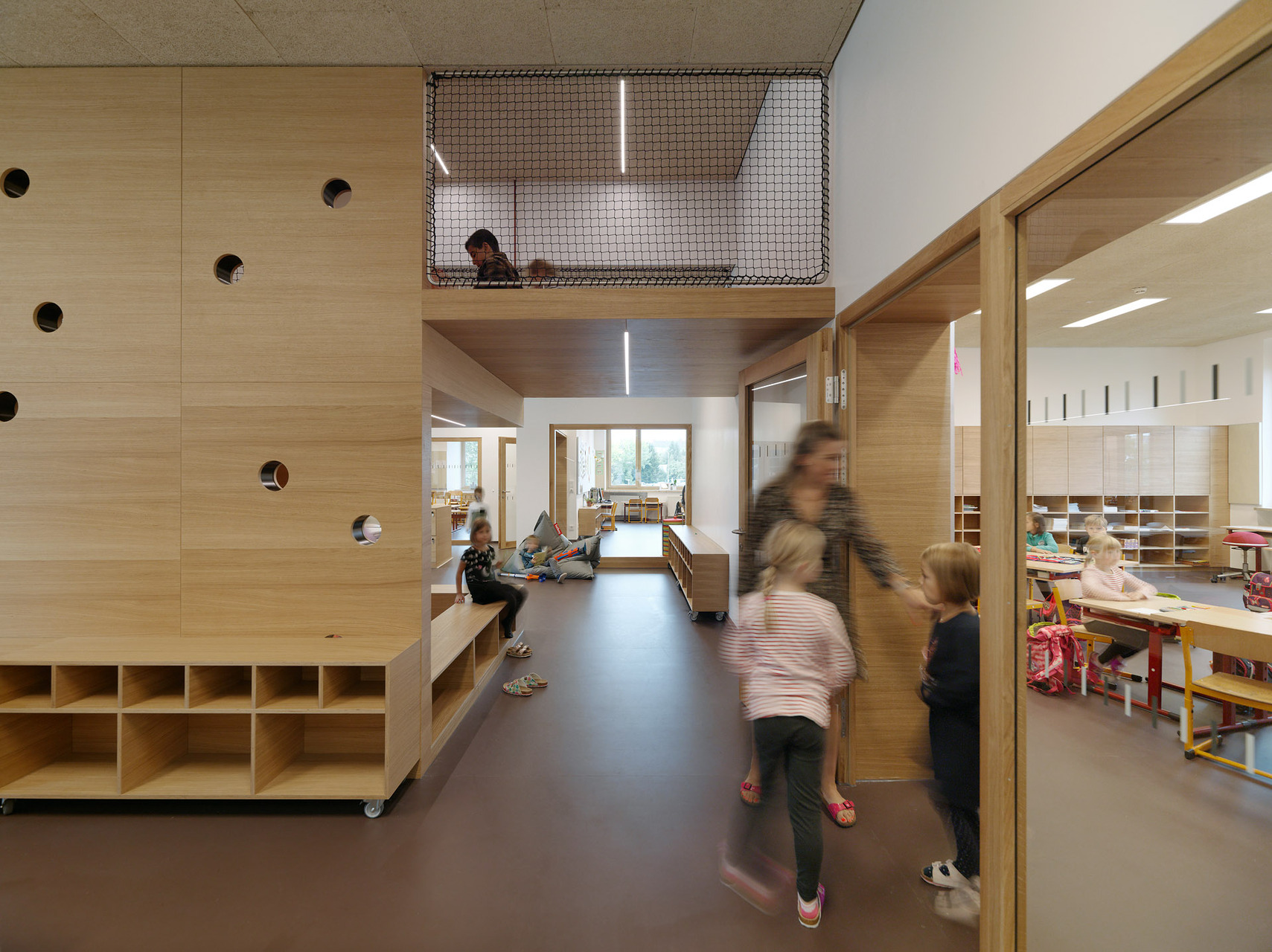 Die VS- und NMS-Cluster, bestehend aus dorfartig vernetzten Klassen, Gruppenräumen und offenen Lernzonen, geben den Lehrer:innen die erforderlichen Möglichkeiten in der zeitgemäßen Unterrichtsgestaltung. Alle Funktionen in den Gebäuden wurden in sinnvollen Raumgruppen organisiert, so zum Beispiel die gemeinsame Verwaltung von VS und NMS im Zentrum des Bildungscampus. Die so genannte „Magistrale“, die die Volksschule über die gemeinsame Bibliothek, Aula, Mehrzweckraum und Verwaltung mit den Werkräumen der NMS und dem Hauptplatz verbindet, bildet eine neue innere Verbindung mit hohen Aufenthaltsqualitäten.