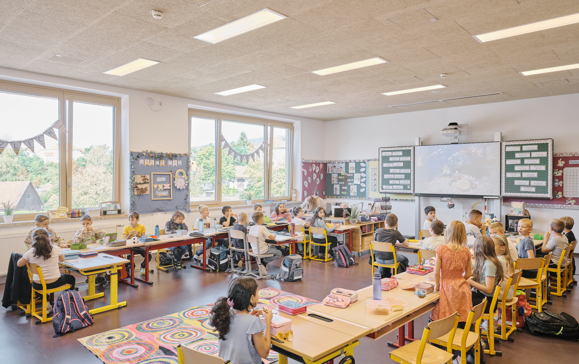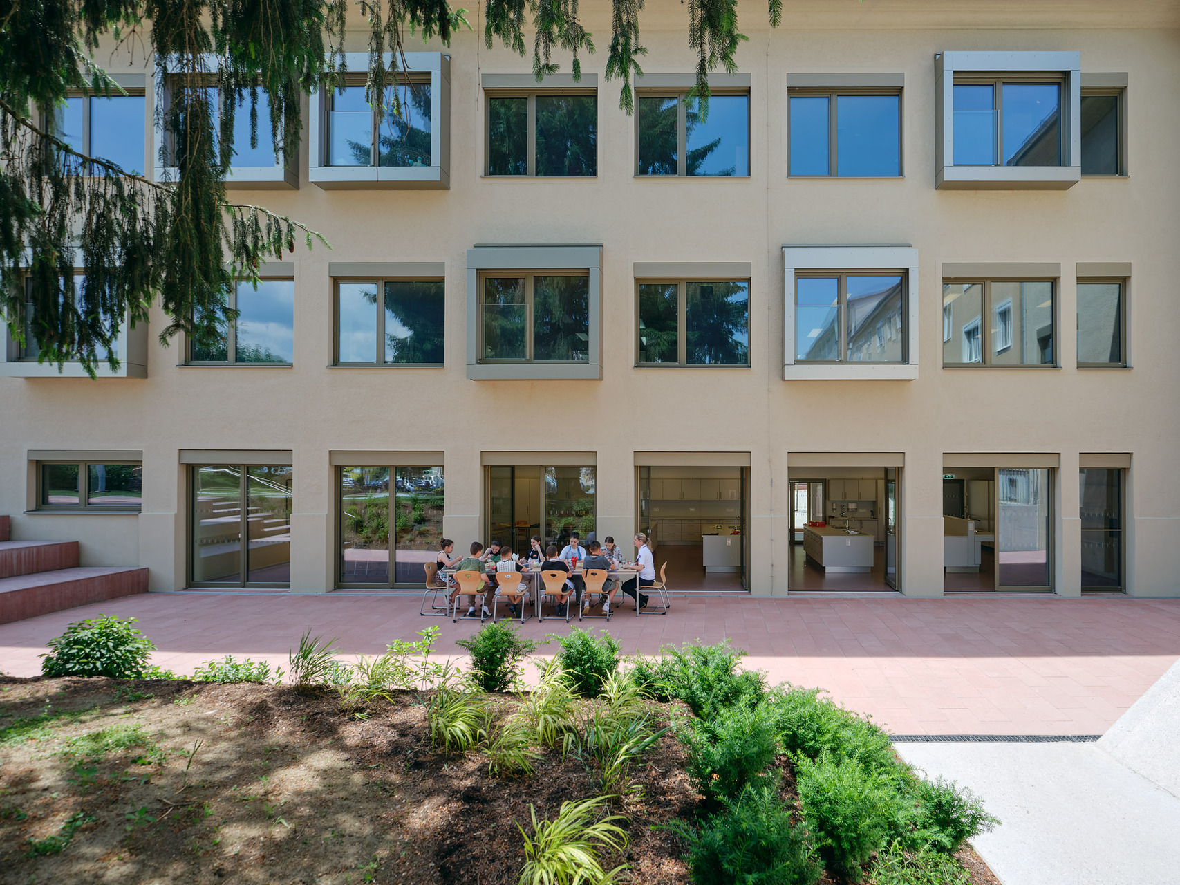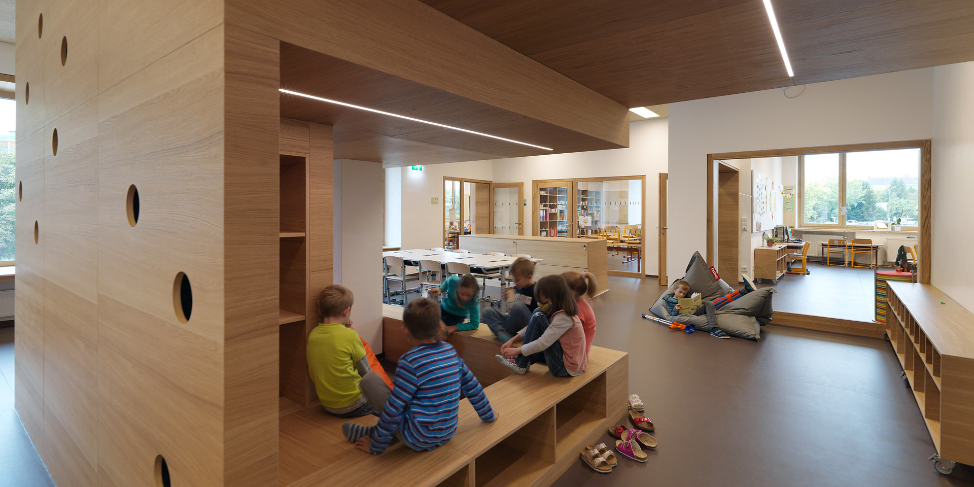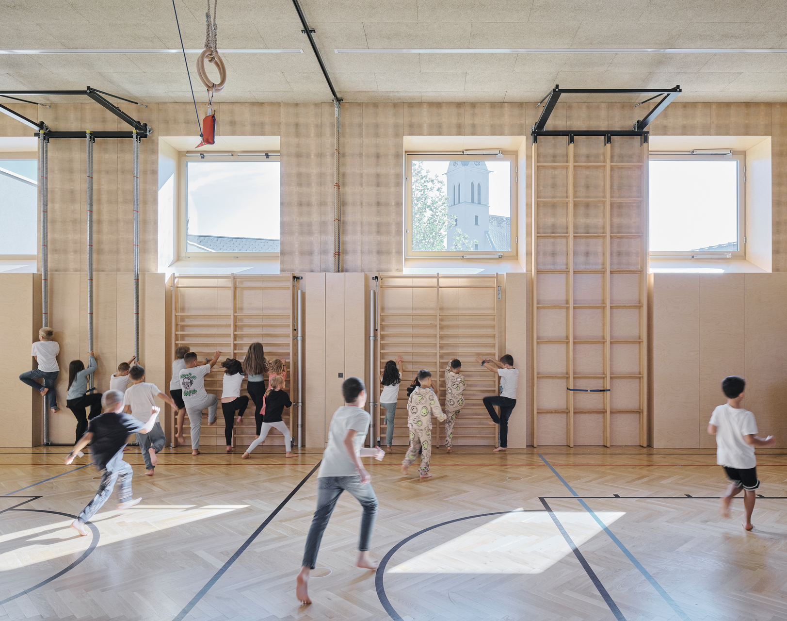 Die VS- und NMS-Cluster, bestehend aus dorfartig vernetzten Klassen, Gruppenräumen und offenen Lernzonen, geben den Lehrer:innen die erforderlichen Möglichkeiten in der zeitgemäßen Unterrichtsgestaltung. Alle Funktionen in den Gebäuden wurden in sinnvollen Raumgruppen organisiert, so zum Beispiel die gemeinsame Verwaltung von VS und NMS im Zentrum des Bildungscampus. Die so genannte „Magistrale“, die die Volksschule über die gemeinsame Bibliothek, Aula, Mehrzweckraum und Verwaltung mit den Werkräumen der NMS und dem Hauptplatz verbindet, bildet eine neue innere Verbindung mit hohen Aufenthaltsqualitäten.