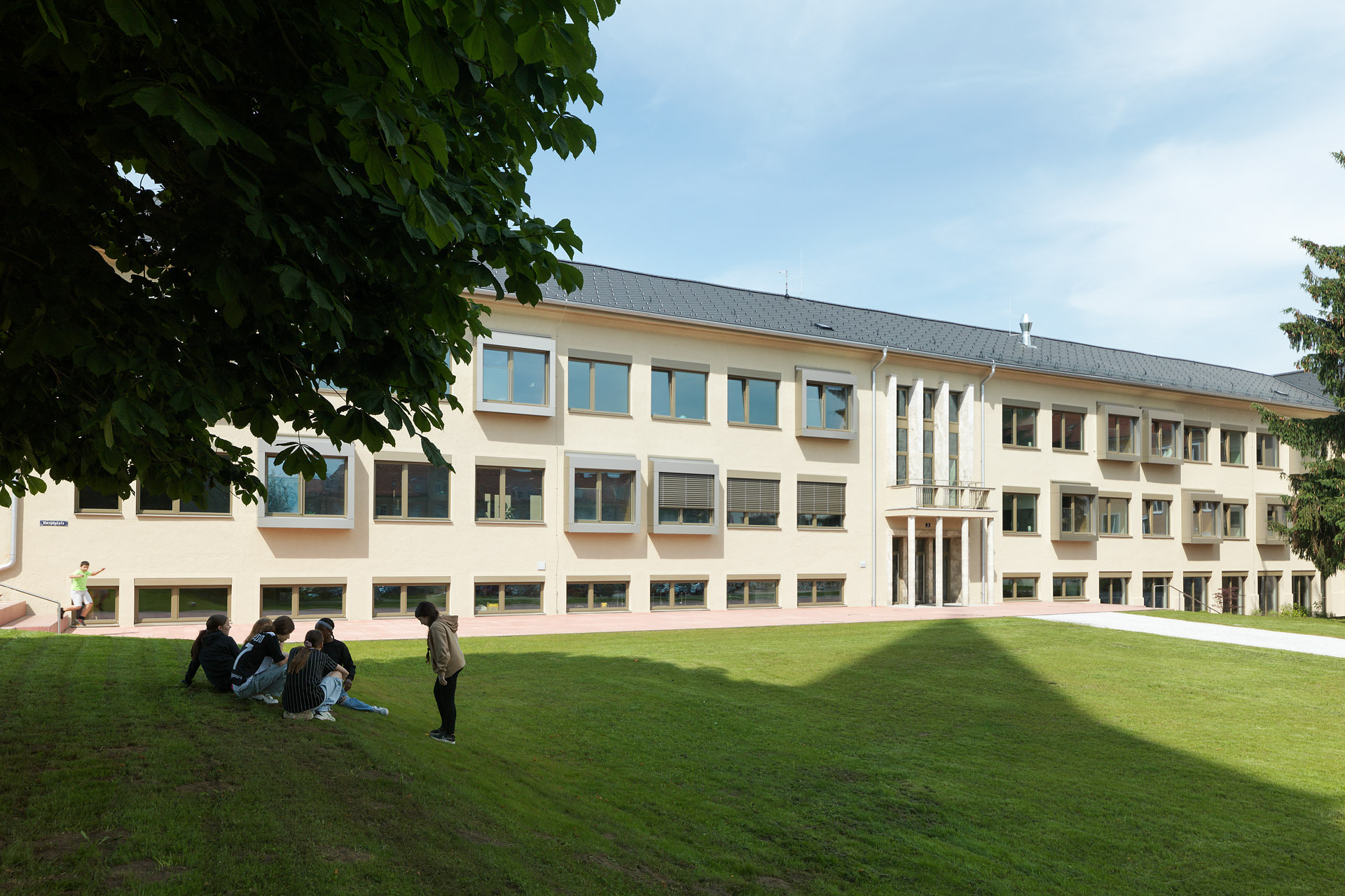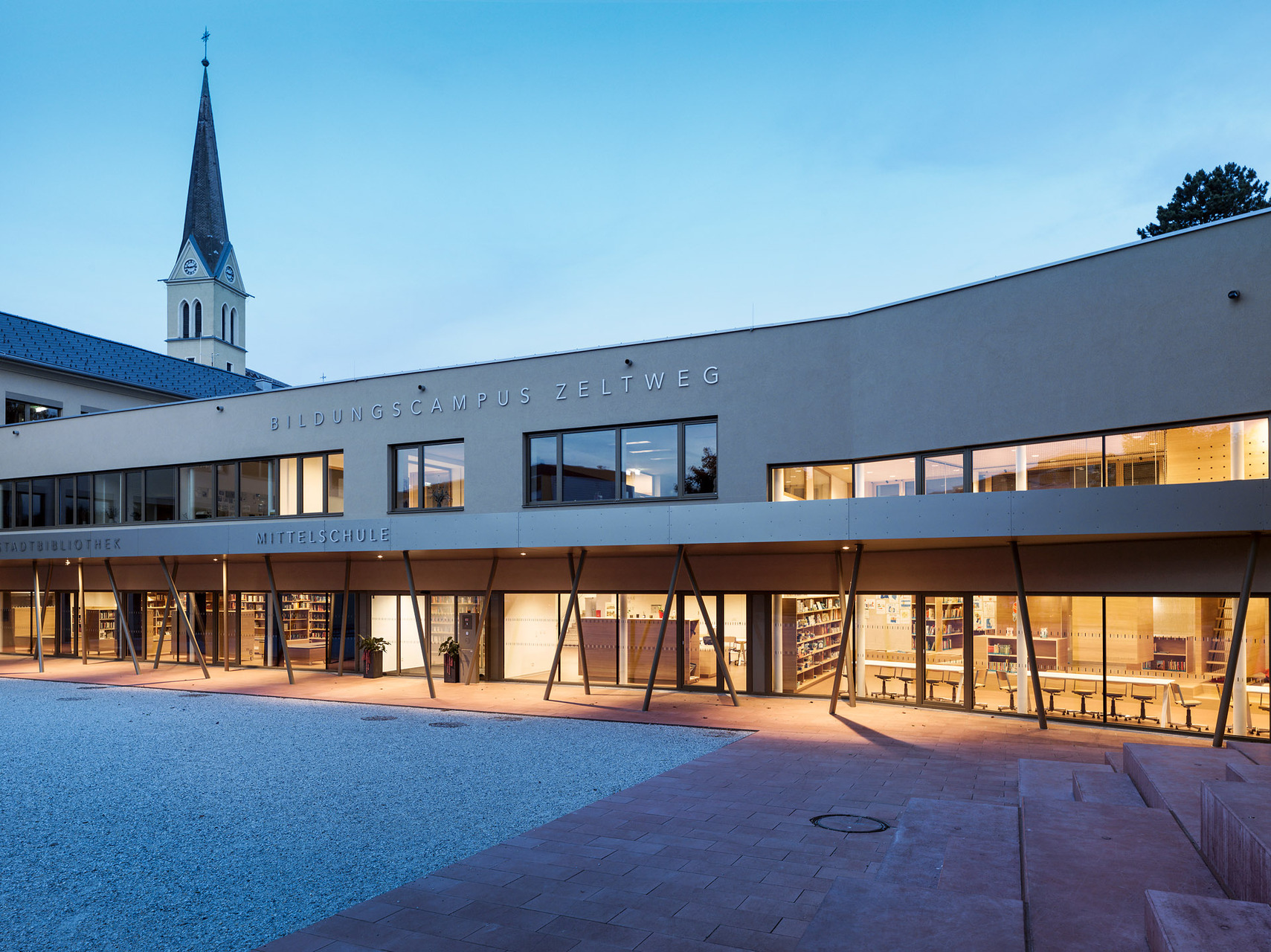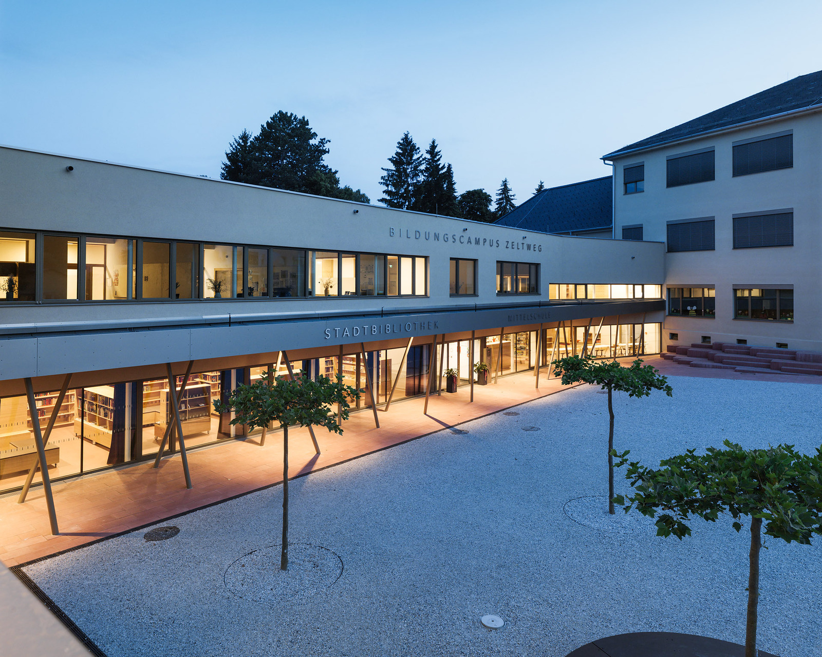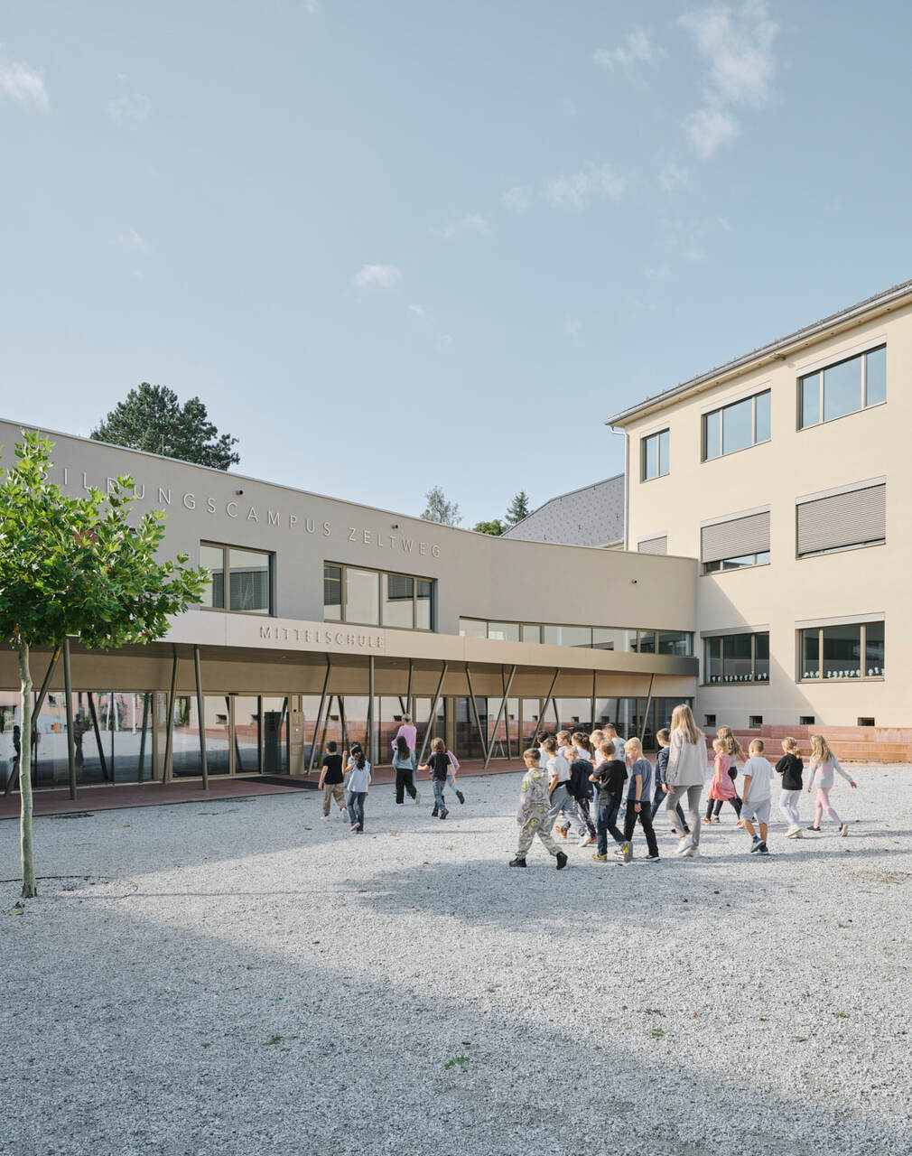 In ihrer äußeren Gestalt fügt sich die Schule in die Struktur des von historistischen und in den 50er- und 60er-Jahren des 20. Jahrhunderts errichteten Bauwerken geprägten Stadtzentrums ein. Die verkehrsberuhigte öffentliche Freizeit- und Sportanlage, die die Bildungseinrichtungen im Außenraum verbindet und mit der Stadt vernetzt, vermag, die bislang recht unbelebte Ortsmitte der Sportstadt Zeltweg gestalterisch wie funktional aufzuwerten. (Autor: Achim Geissinger, nach einem Text der Architekten)