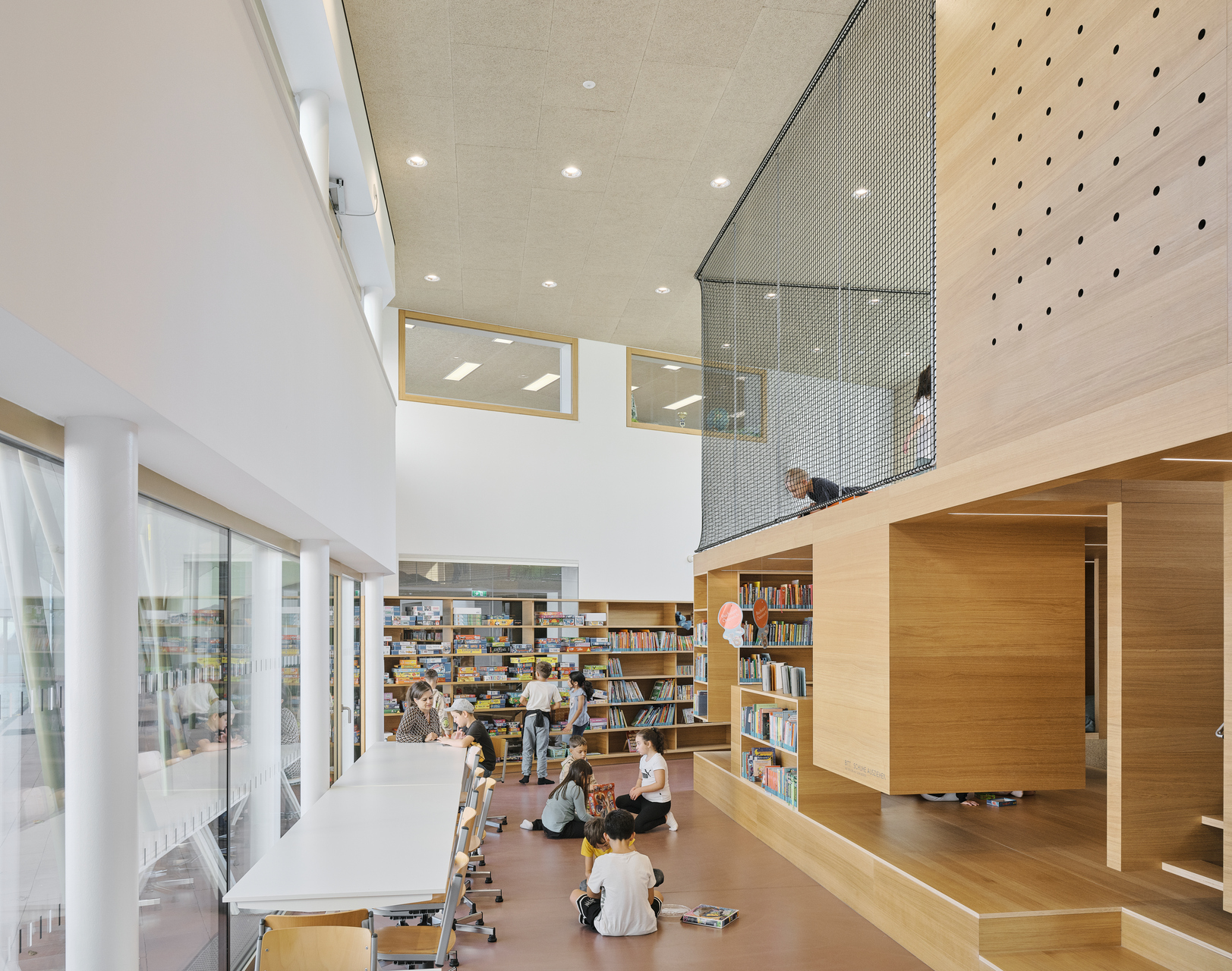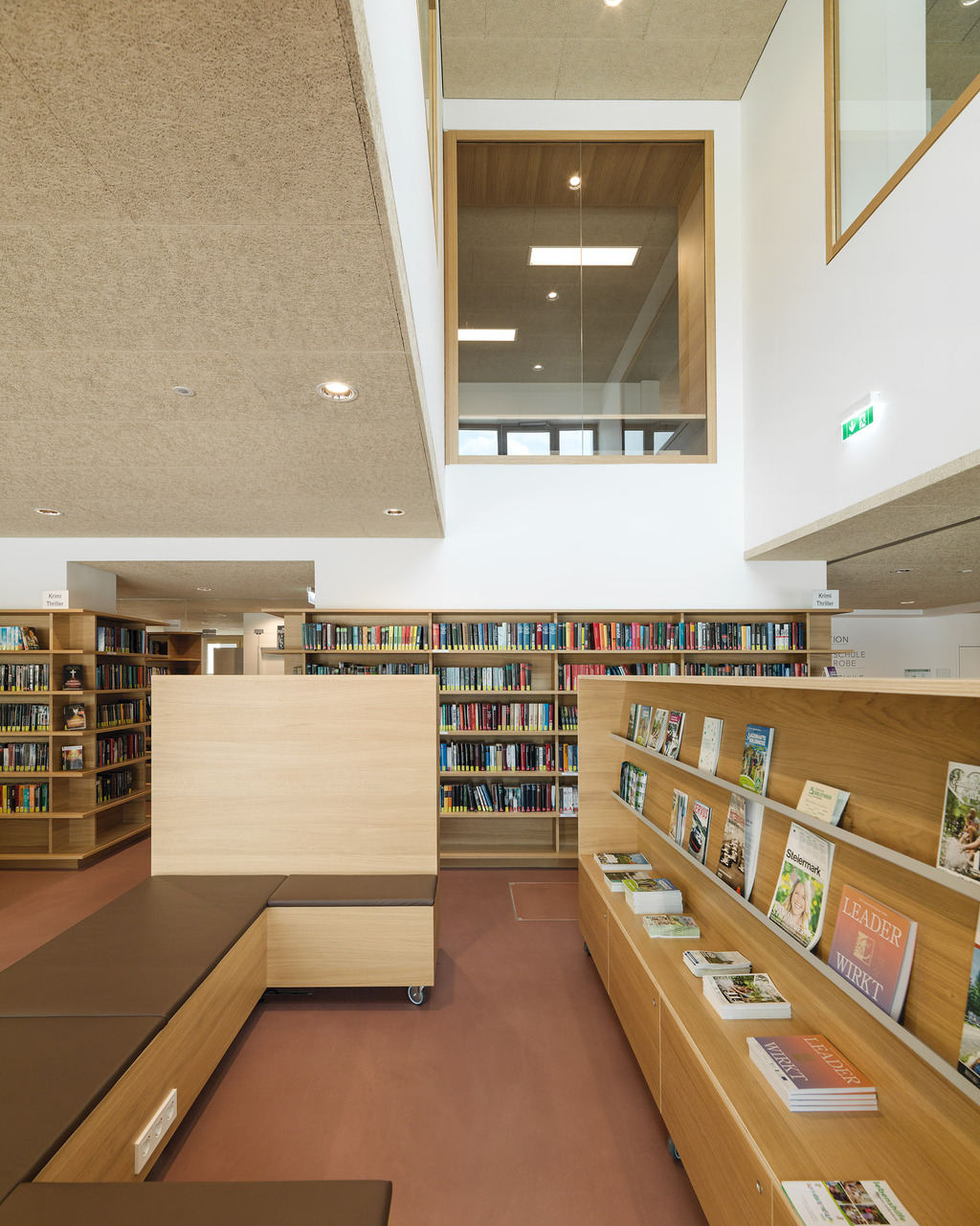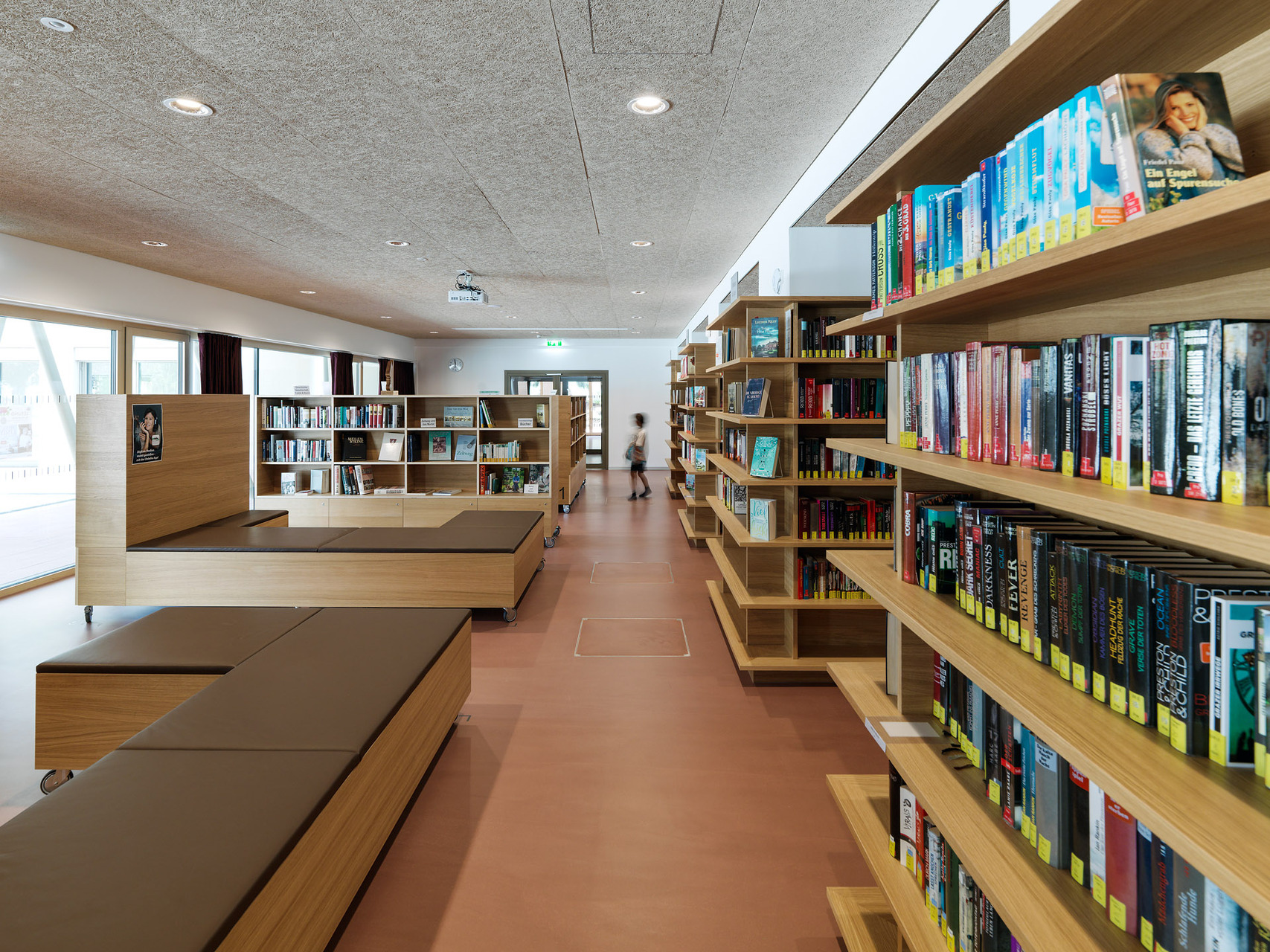 Die zentrale Aula mit Stadt- und Schülerbibliothek im Eingangsbereich kann für Veranstaltungen auch zu einem Großraum zusammengelegt werden. Die Bibliothek ist mit Bücherausgabe, Lesegalerie und eigenen Sanitärräumen ausgestattet und entfaltet mit ihrer zentralen Lage und der räumlichen Qualität bereits jetzt ihr Potenzial als neues kulturelles Zentrum der Schule, aber auch für die Bürger:innen der Stadt.