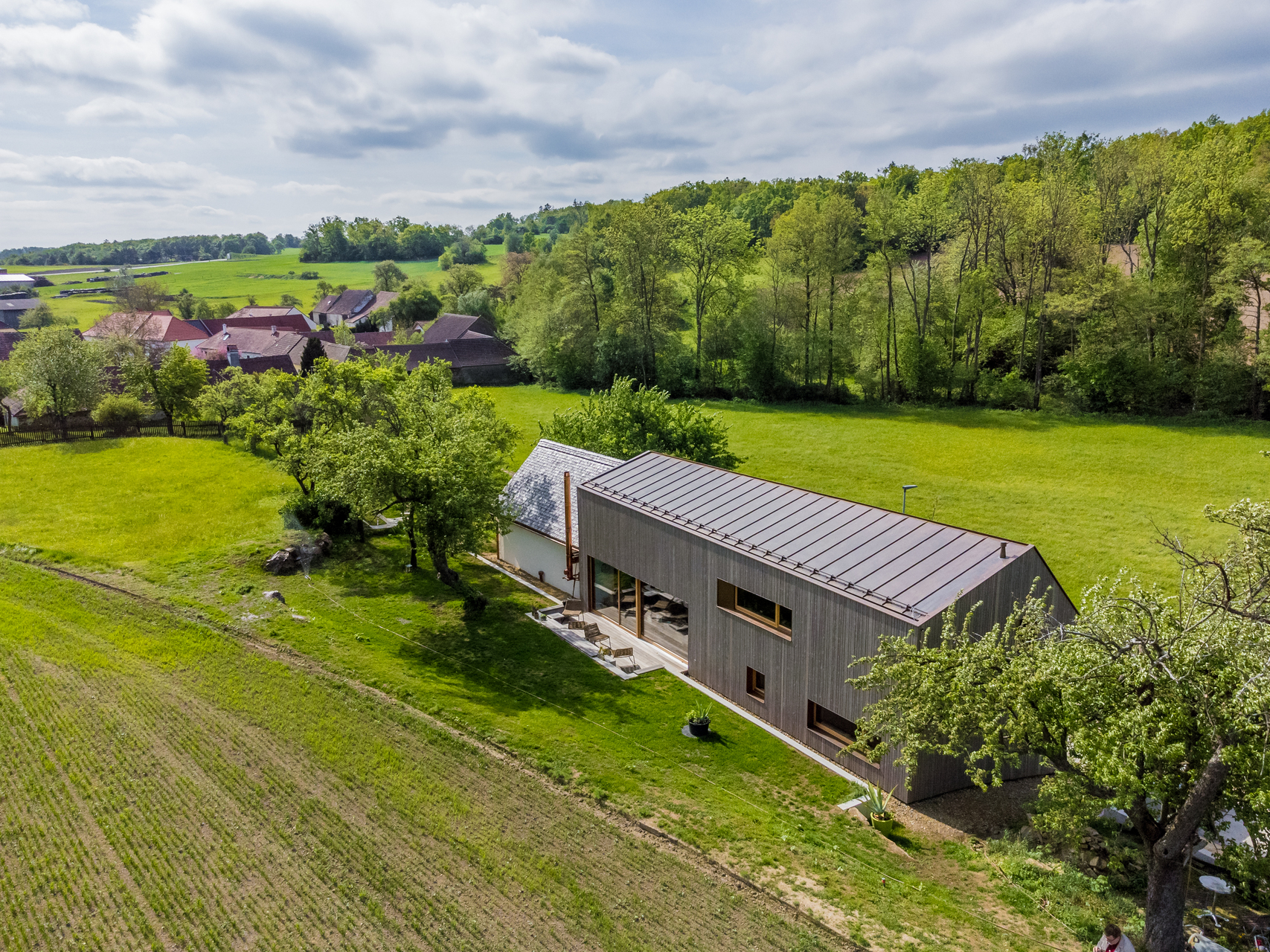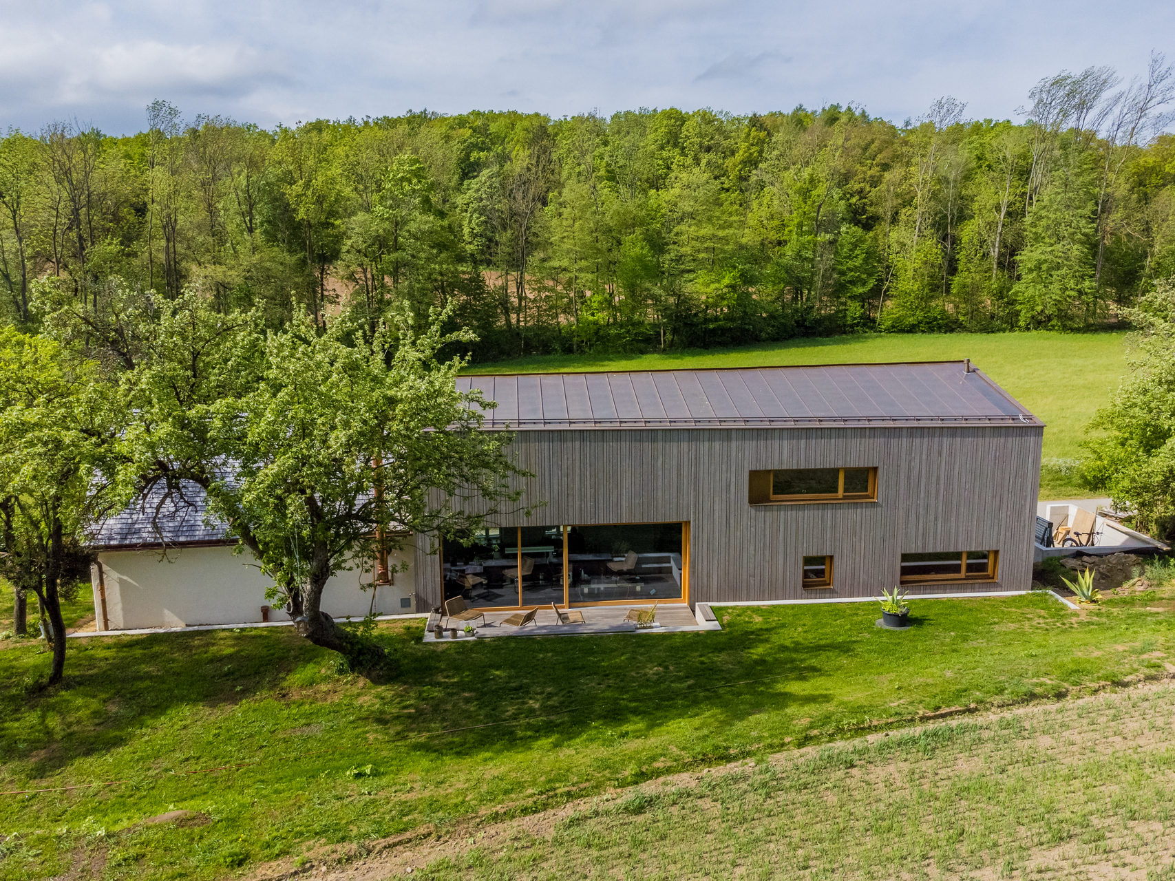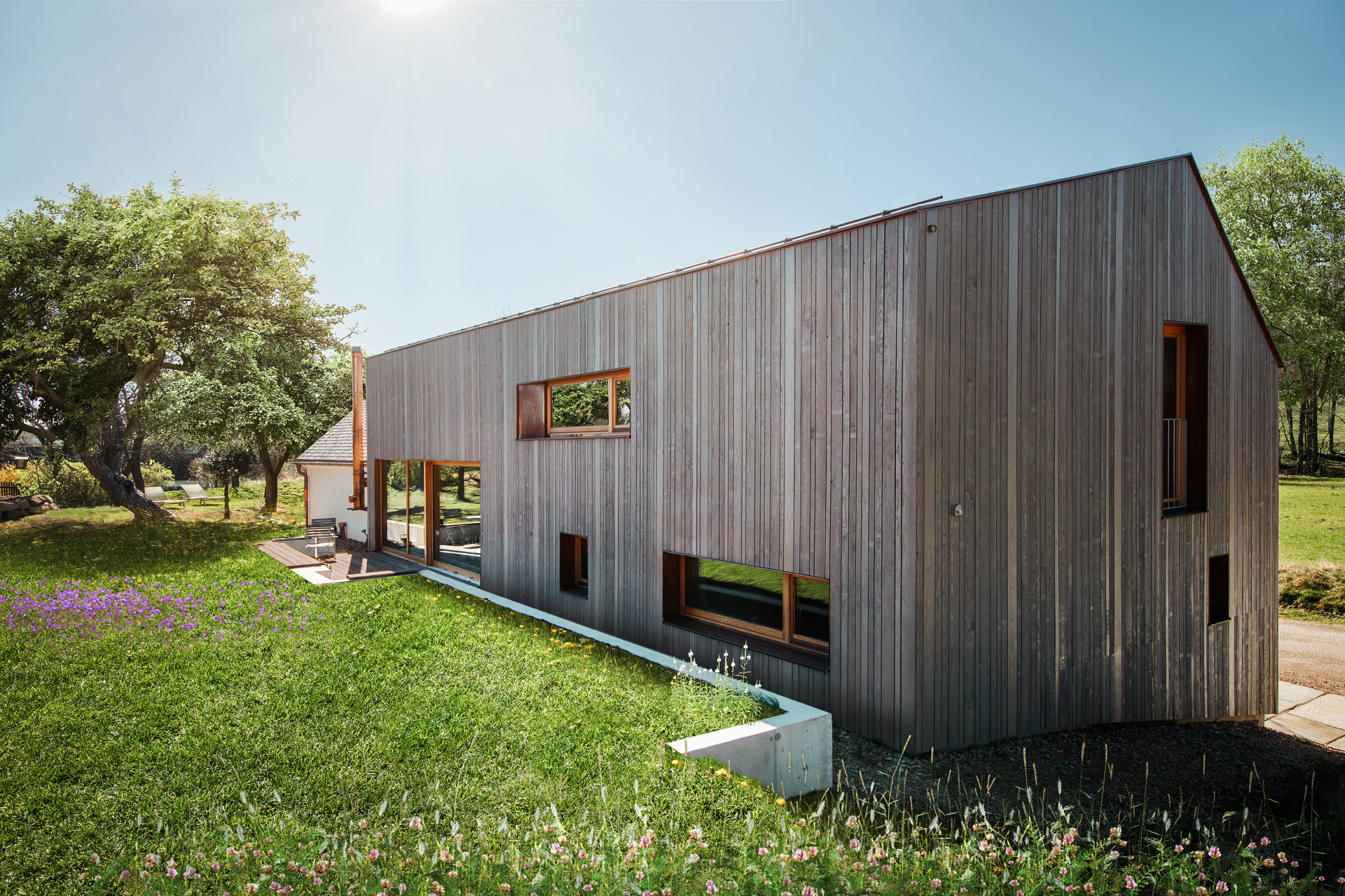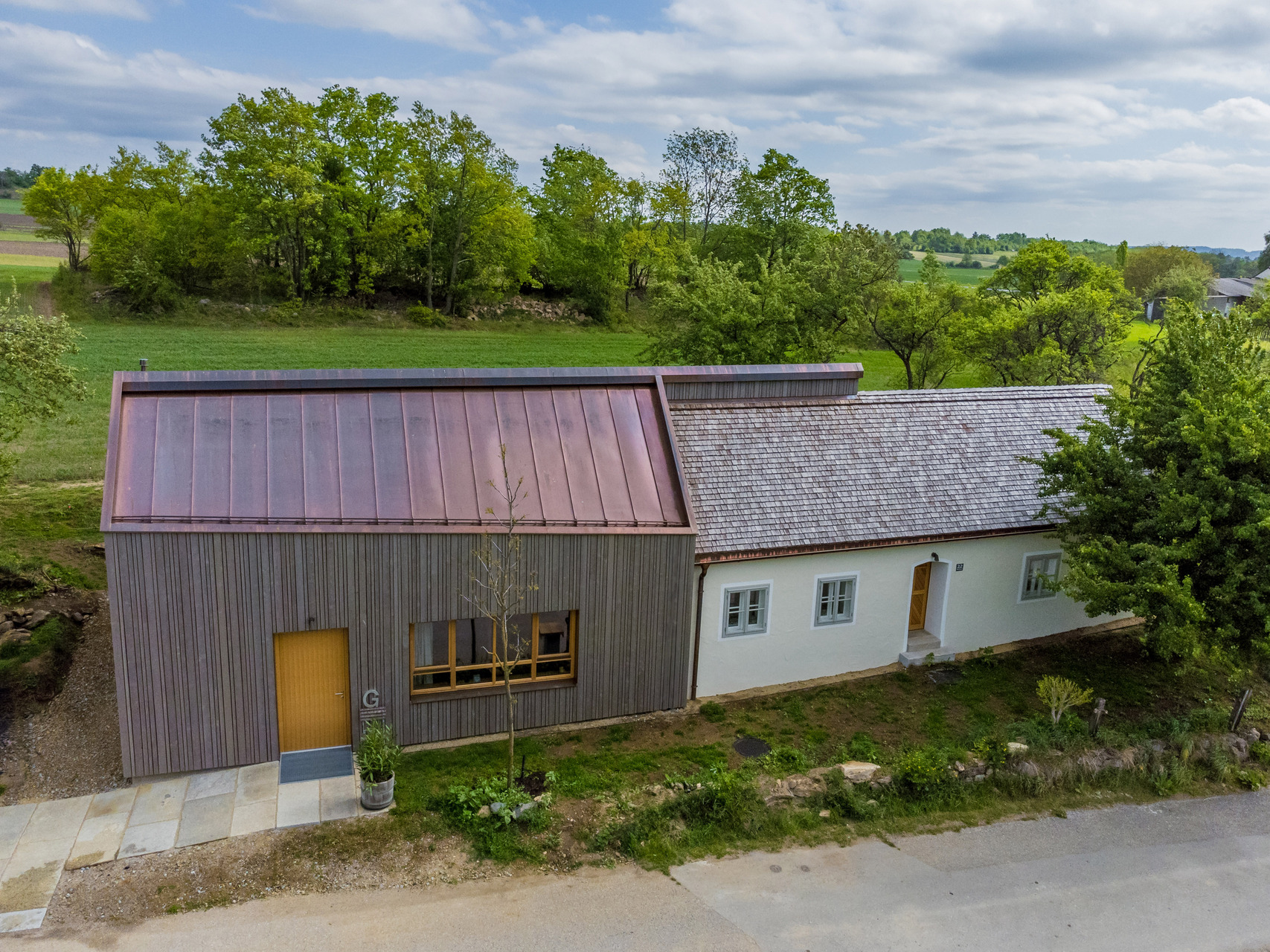 Die Fassade des Erweiterungsbaus besteht aus einer hinterlüfteten vertikalen Lärchenholzverschalung und orientiert sich an den landwirtschaftlichen Nebengebäuden des Ortes. Die Fenstergrößen sind dem Maßstab des Hauses angepasst und entsprechend klein bzw. schlitzförmig gehalten. Im Bereich der Erweiterung kommt ein hinterlüftetes Stegfalz-Kupferblechbahnendach mit Kastenrinne zur Anwendung.