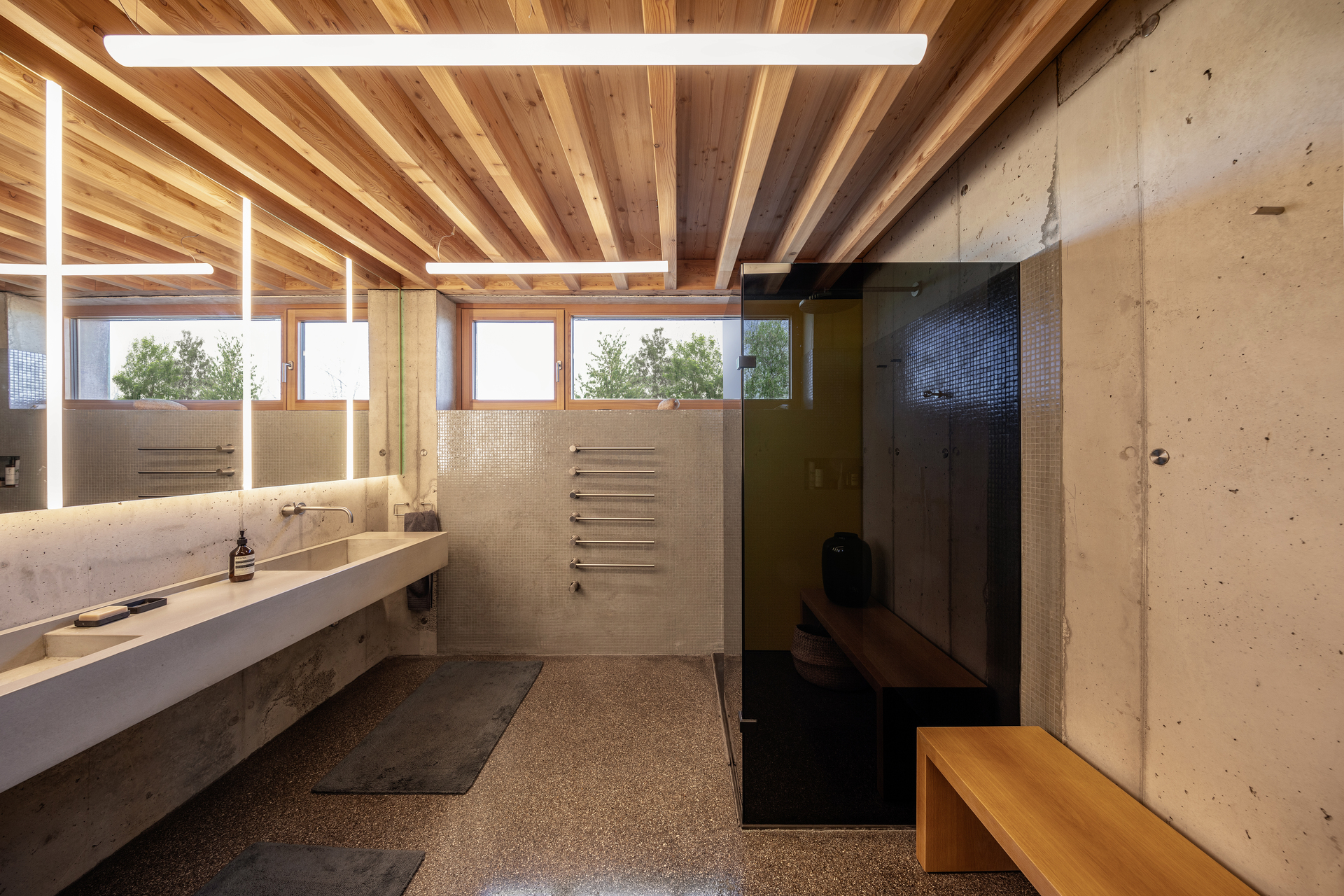 Das an das Bestandsgebäude angrenzende Geländeniveau wird nicht bzw. nur geringfügig angepasst (+/-20 cm), um die Hanglage mit den felsigen Einschlüssen als ein Wesensmerkmal dieses Projektes und der Landschaft zu erhalten. (Text: Architekt, bearbeitet)