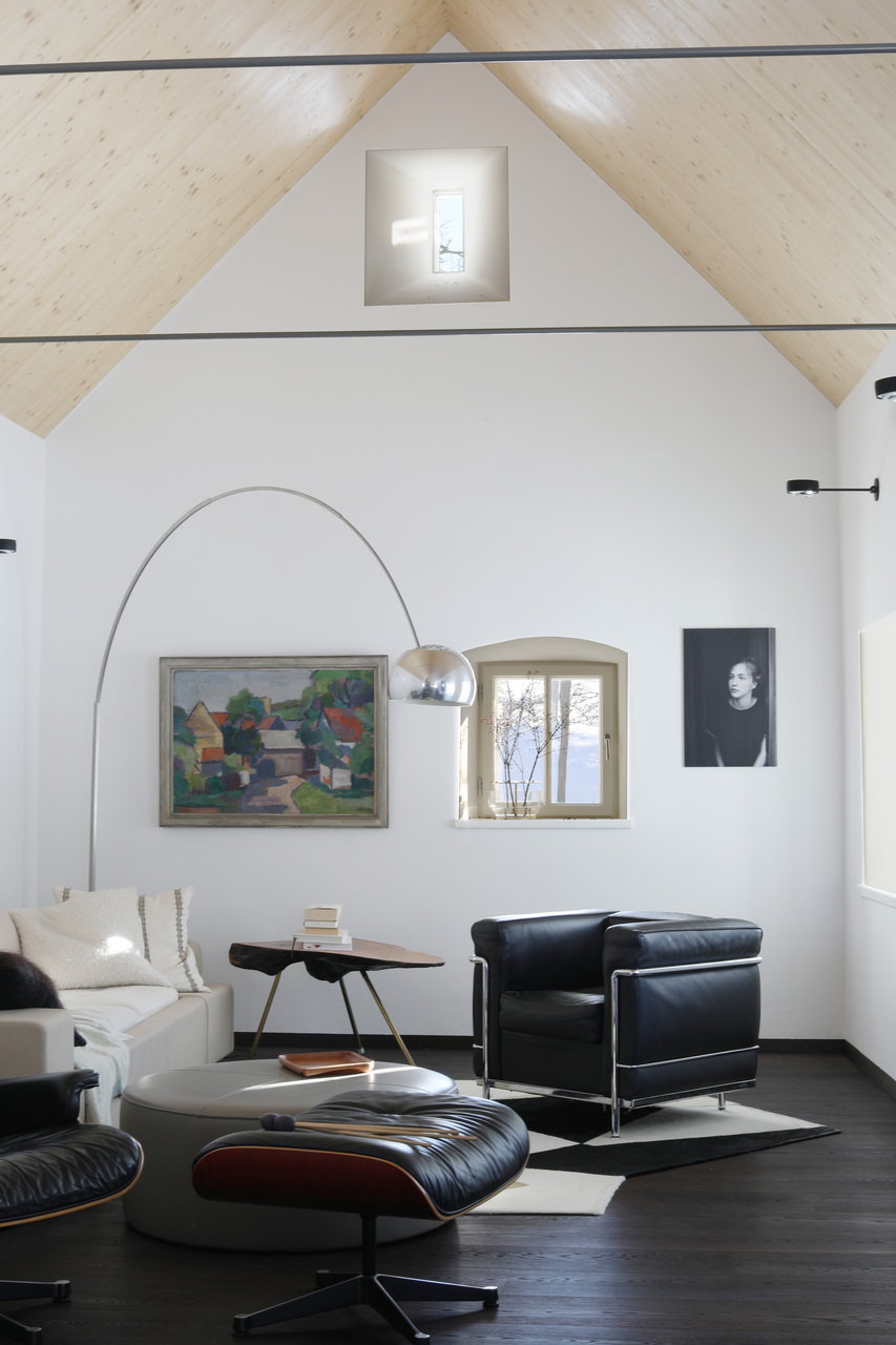 Neue Schmalprofil-Kastenfenster aus Vollholz mit Dichtung der Innenflügel ersetzen nun die bestehenden Kastenfenster unter Einhaltung der Proportionen. Nordostseitig klappt das Dach zu einer Gaupe auf, sodass der Innenraum über Glas-Schiebeelemente mit angenehm diffusem nordseitigen Tageslicht versorgt wird.
