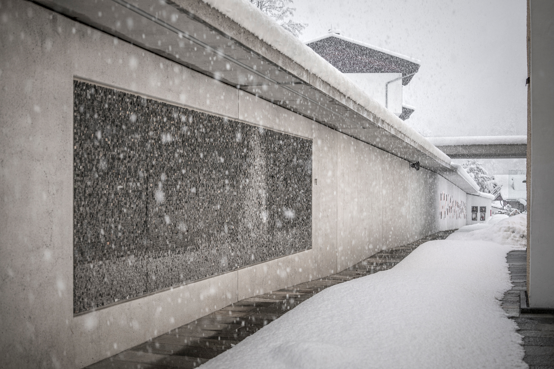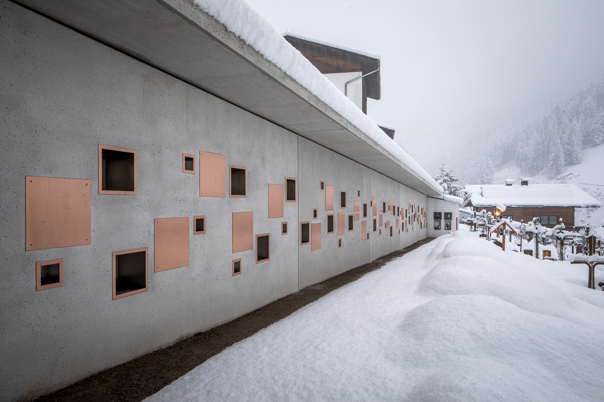 Die insgesamt 60 m lange Mauer verläuft zunächst parallel zur Kirche und lässt einen nach oben offenen, intimen Zwischenraum als Zugang zum Friedhof entstehen. Im Eingangsbereich befindet sich als wesentlicher Bestandteil des Gesamtkonzeptes ein Kunst-am-Bau-Projekt des Künstlers Peter Niedertscheider – ein abstraktes Mosaik, für das Steine aus aller Welt, darunter auch solche von aufgelassenen Gräbern des Friedhofes, verwendet wurden.