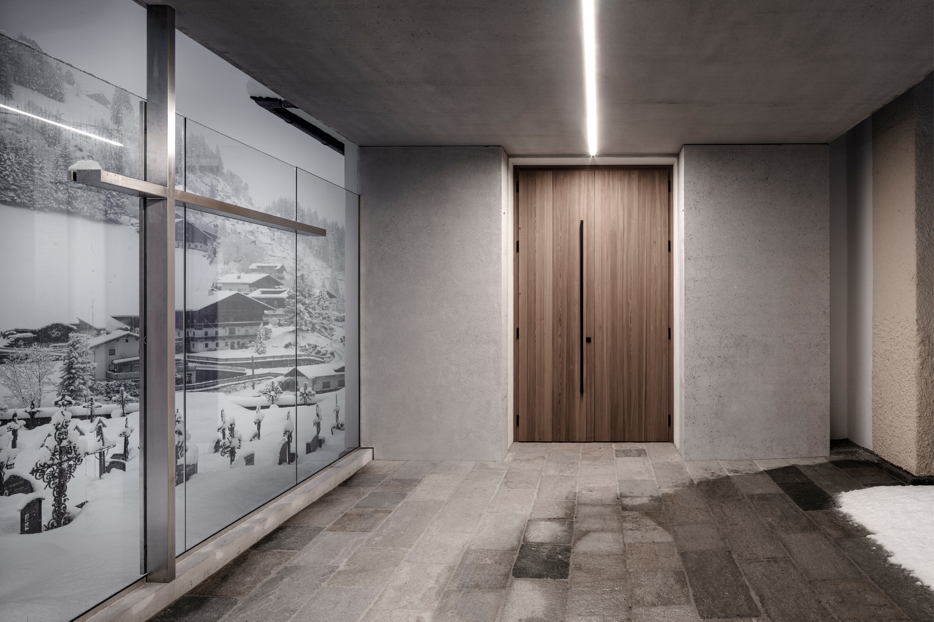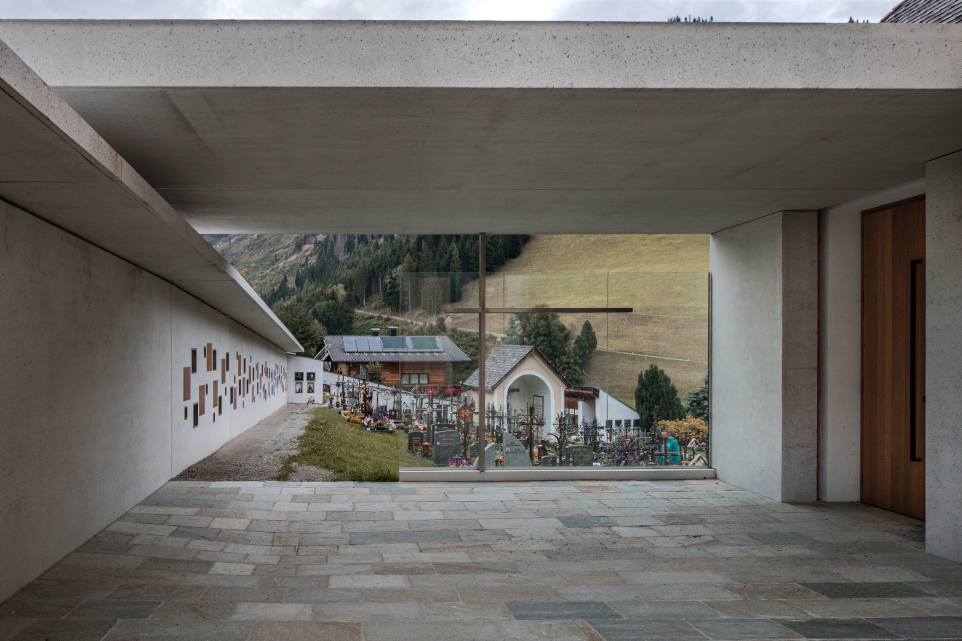 Im Bereich der an die Pfarrkirche angebauten Aufbahrungskapelle verbindet ein schlankes, quer zur Mauer angeordnetes Dachelement die Urnenwand mit der Kapelle, ohne diese direkt zu berühren. Die Überdachung bietet Witterungsschutz beim Warten vor und beim Betreten der Kapelle, die eine neue raumhohe Tür aus Eichenholz erhielt.
