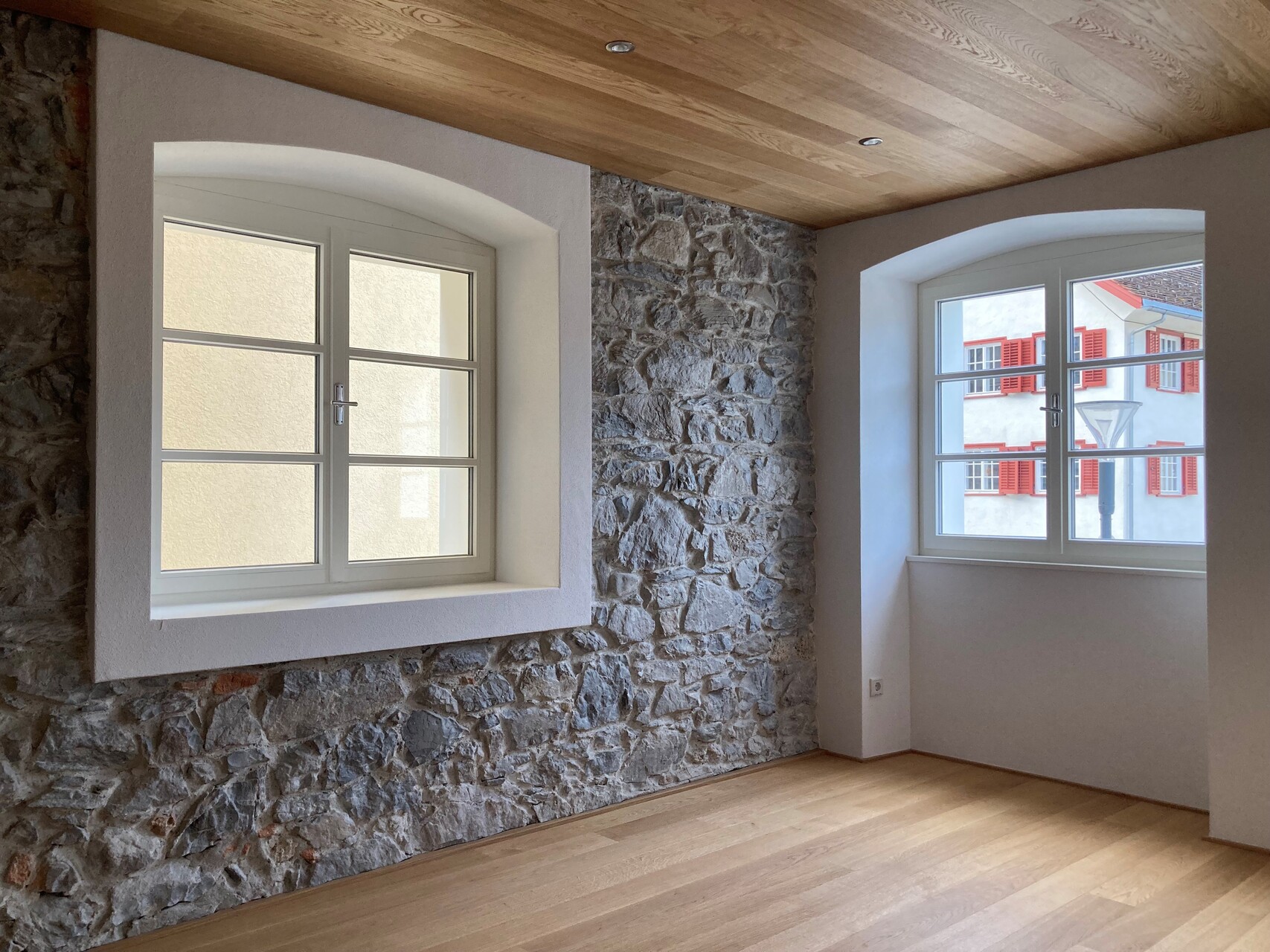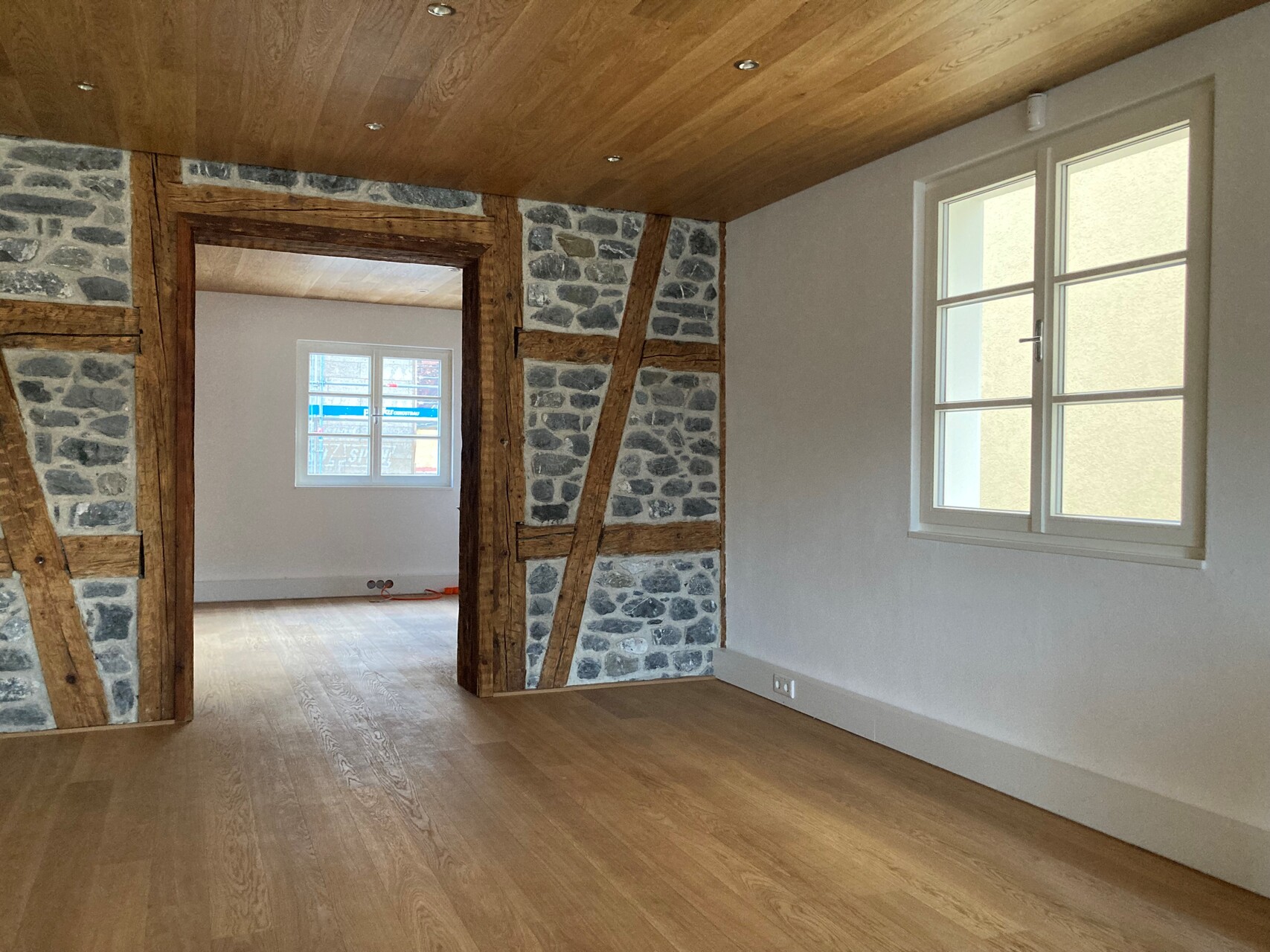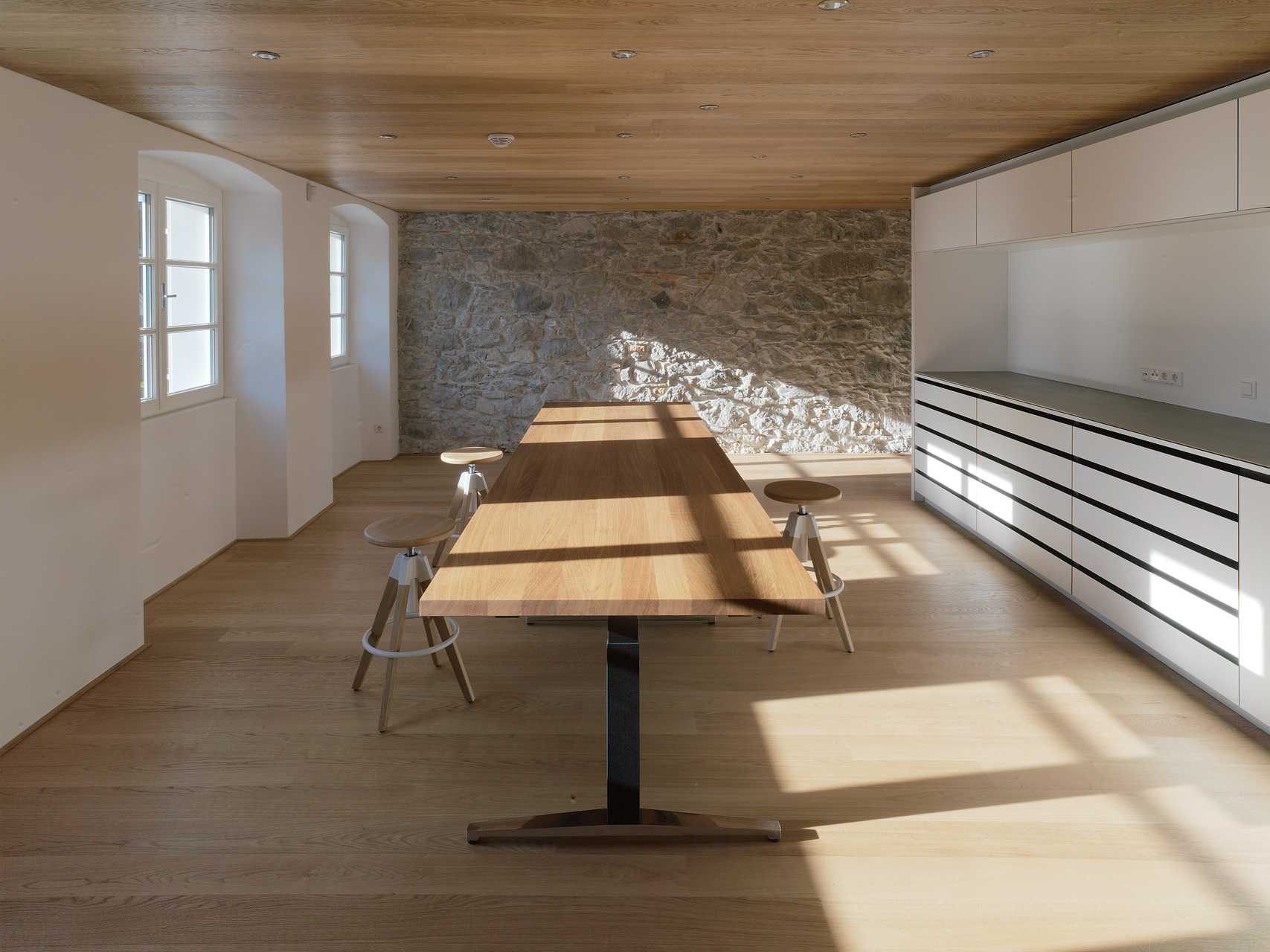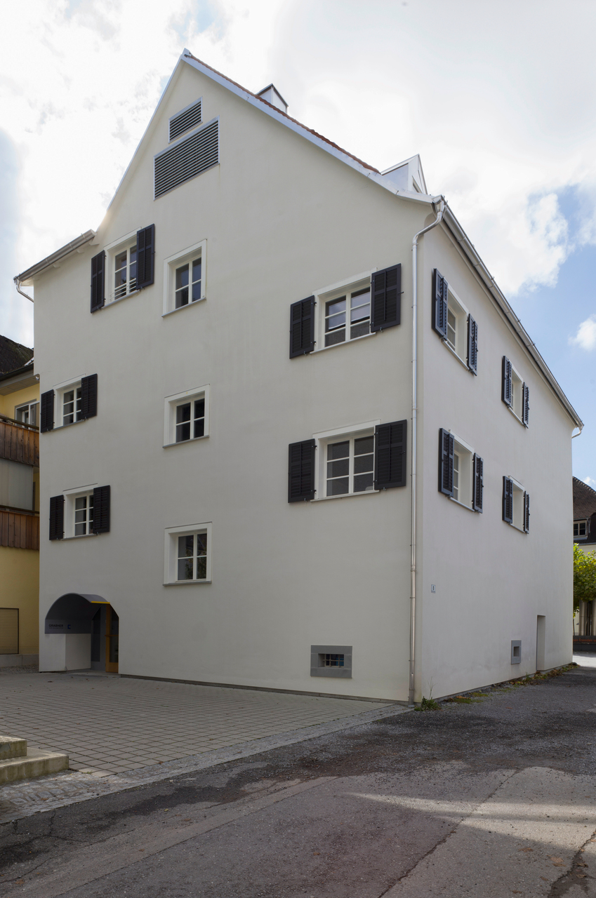 Während der Umbauarbeiten zeigte sich der konstruktive Aufbau sehr deutlich. Das Erdgeschoß ist in massivem Bruchsteinmauerwerk mit einem Meter Wandstärke ausgebildet und daher sehr stark belastbar. Im hinteren Teil sind Gewölbe aus Tuffstein, der klimatisch für die Lebensmittellagerung von Vorteil war. Die Geschosse darüber sind als Holzständerbau mit ausfachenden Bruchsteinen ausgeführt und bilden sozusagen das Bindeglied zur darüberliegenden Dachkonstruktion aus Holz. Je höher, desto leichter.