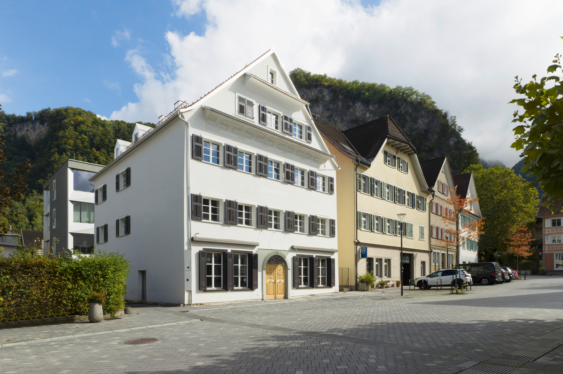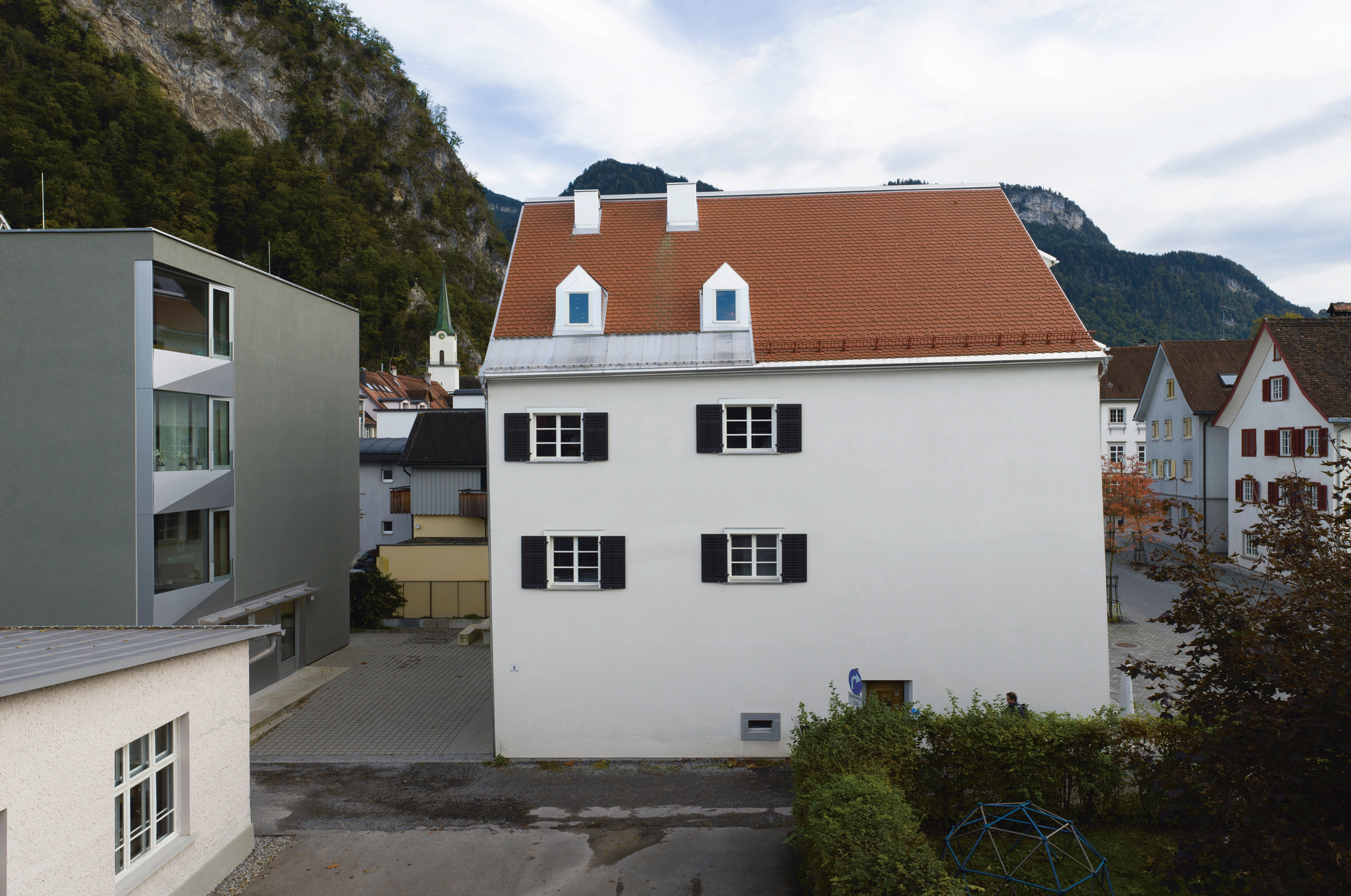 Die platzseitige Giebelfassade ist einem steingefassten Bogentorn, aneinandergereihtn Fenstern und Gesimsen sehr aufwändig gestaltet, während alle anderen bis auf die notwendigsten kleinen Öffnungen geschlossen sind. Man hätte jederzeit direkt anbauen können, doch das geschah nicht – und so steht es bis heute relativ frei.