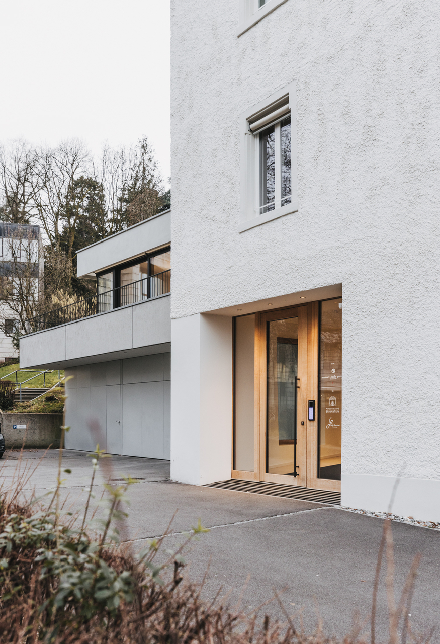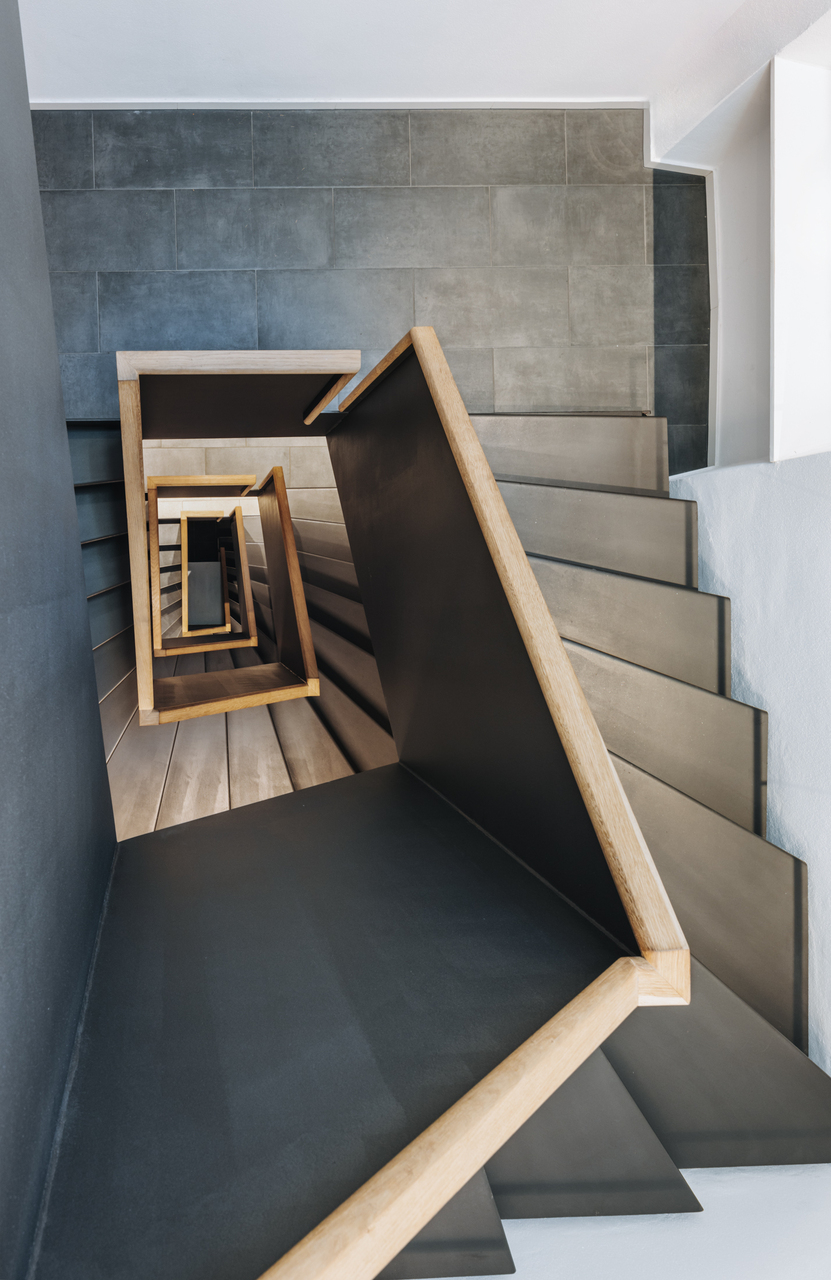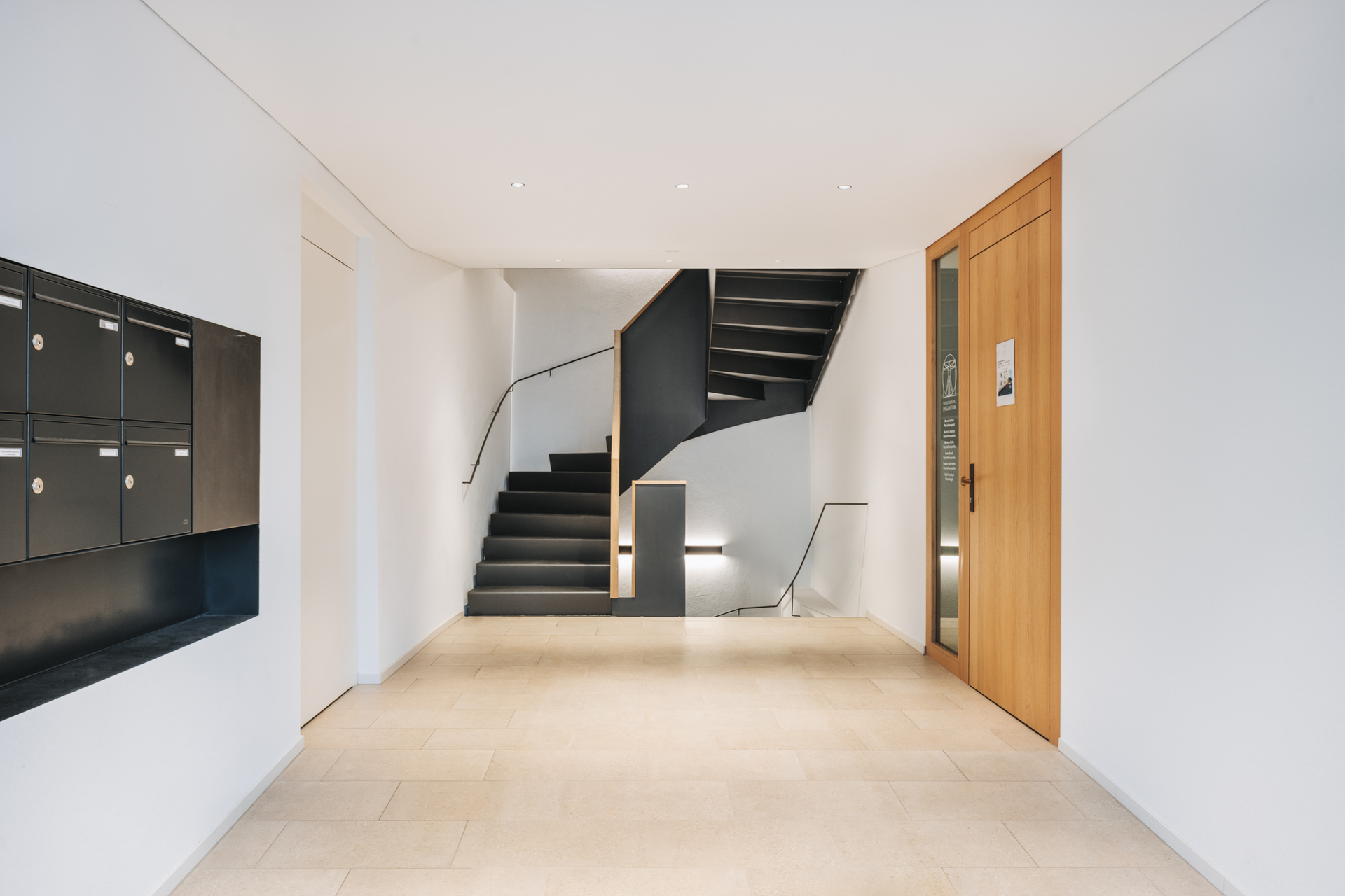 Die Neuorganisation der Erschließung verbessert die Orientierung. Am Eingang wurde am Übergang zur Garage ein neues Portal ergänzt und transparent gestaltet. Das neue Stiegenhaus ist als eigener Brandabschnitt durch das ganze Haus gezogen. Die neue Rampe in der Halle erschließt das gesamte Erdgeschoss barrierefrei. Die dunkle, dreiläufige Stiege mit dem hölzernen Handlauf, die sich um ein großes Stiegenauge windet, ist so effizient wie formschön. Die Möglichkeit eines späteren Lifteinbaus ist vorgesehen und eingeplant.