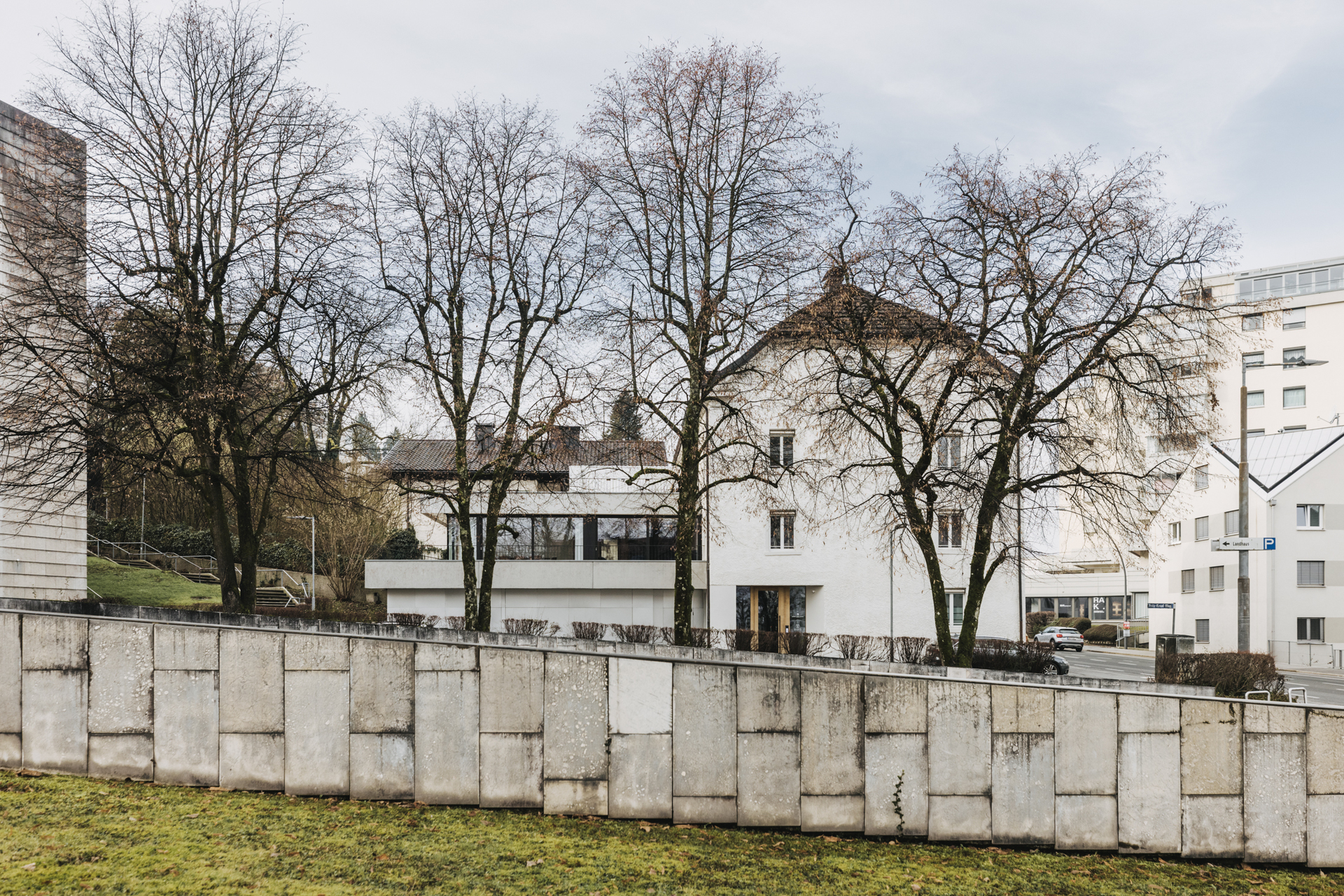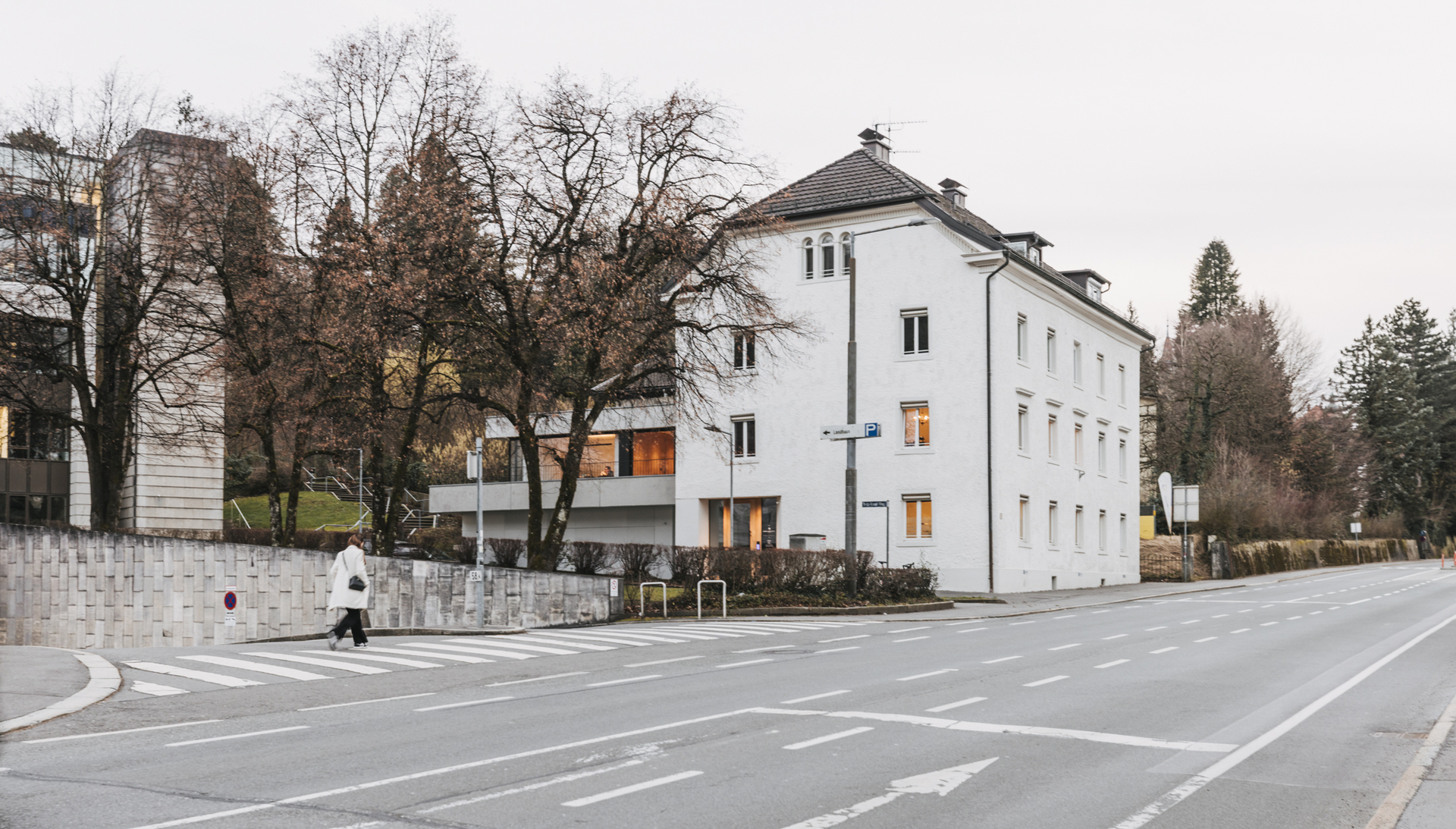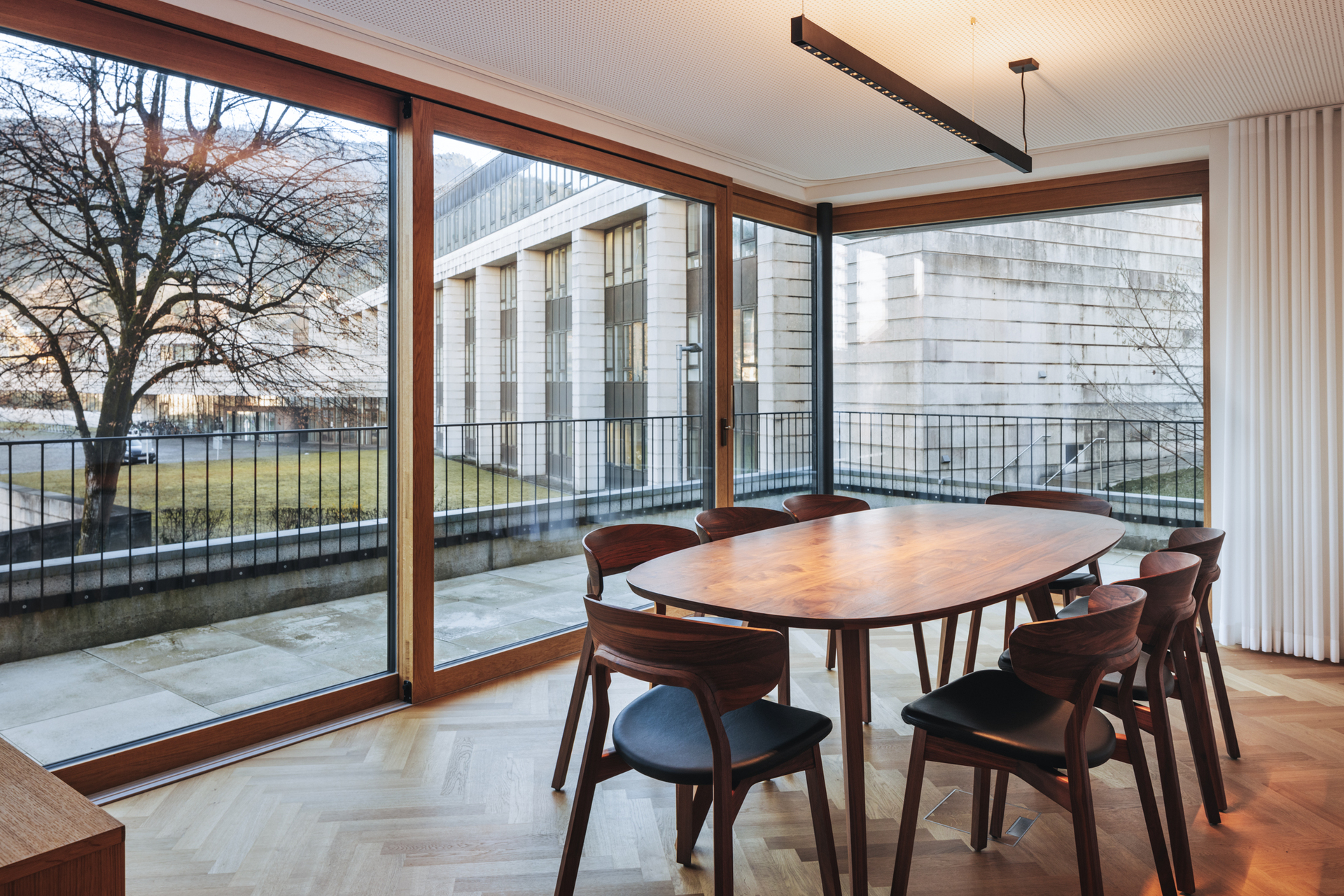 Die Neuorganisation der Erschließung verbessert die Orientierung. Am Eingang wurde am Übergang zur Garage ein neues Portal ergänzt und transparent gestaltet. Das neue Stiegenhaus ist als eigener Brandabschnitt durch das ganze Haus gezogen. Die neue Rampe in der Halle erschließt das gesamte Erdgeschoss barrierefrei. Die dunkle, dreiläufige Stiege mit dem hölzernen Handlauf, die sich um ein großes Stiegenauge windet, ist so effizient wie formschön. Die Möglichkeit eines späteren Lifteinbaus ist vorgesehen und eingeplant.