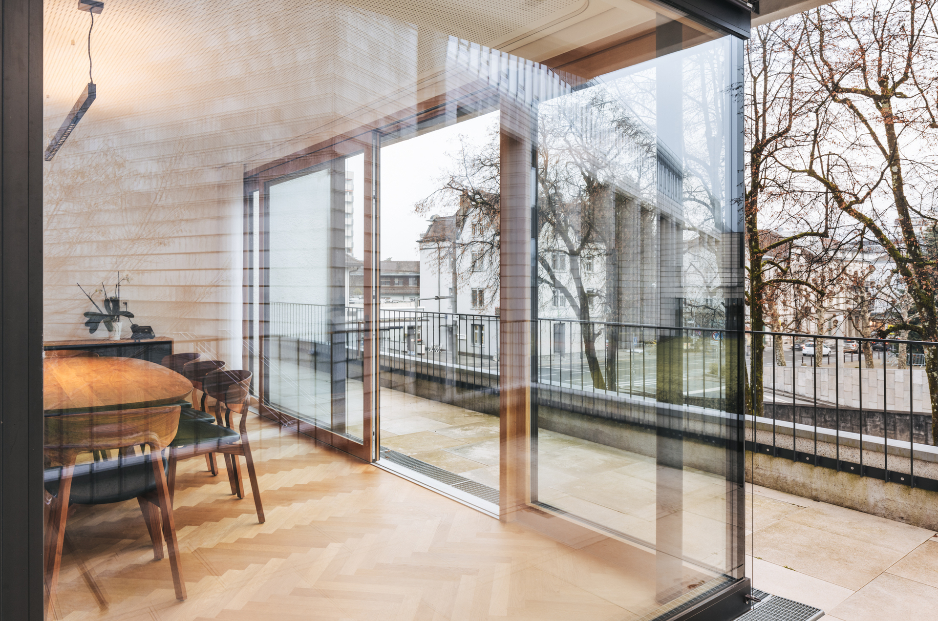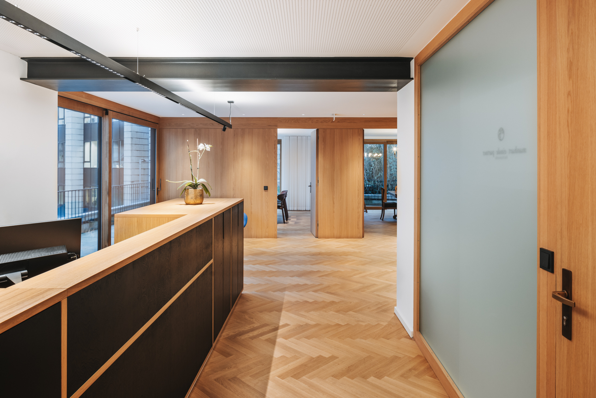Im Erdgeschoss befindet sich eine Physiotherapiepraxis, die bestehende Kanzlei im ersten Obergeschoss ist um großzügige neue Besprechungs-, Sozialräume und um eine schmale Terrasse erweitert. Die Gestaltung ist reduziert und schlicht: raumhohe Türen, Holz oder Glas, Parkett, weiße Wände, Holzschränke. Im zweiten Stock wurde die große Bestandswohnung in zwei Wohnungen geteilt und um neue, ruhige Terrassen auf das Flachdach des Zubaus erweitert. Das dritte Obergeschoss ist nur im Bereich des neuen Stiegenhauses umgebaut, eine neue Stahltreppe erschließt alle Stockwerke. (Isabella Marboe, nach einem Text der Architekten)