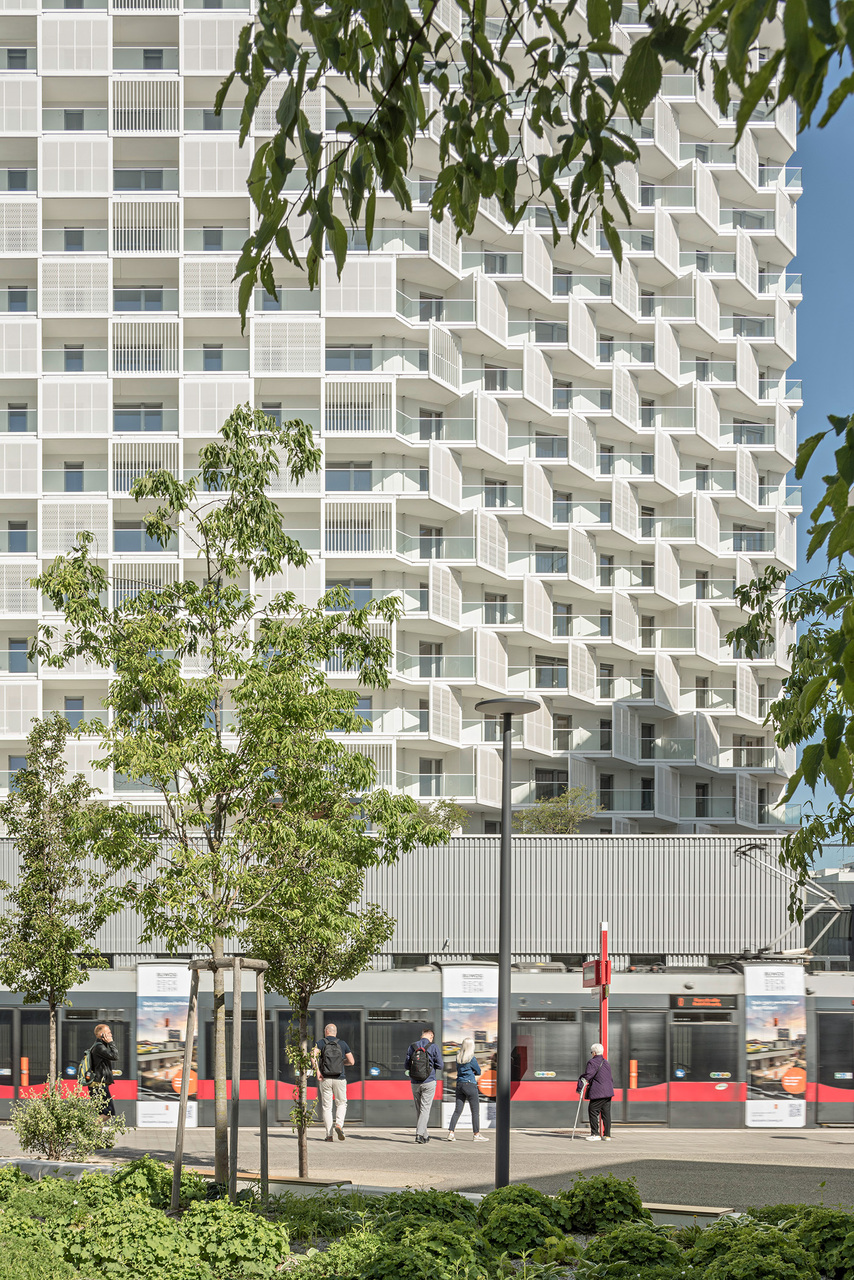 Einer dieser prägenden Eckpfeiler im nördlichen Teil des Areals und gleichzeitig Schlussstein in der Entwicklung des neuen Quartiers ist das 21-geschossige Wohnhochhaus gegenüber dem alten Wasserturm an der neuen Straßenbahn. An diesem markanten Punkt bietet es imposante Ausblicke rundum auf die Stadt und im Westen auf die freie Mitte. Es beinhaltet 200 Wohnungen.