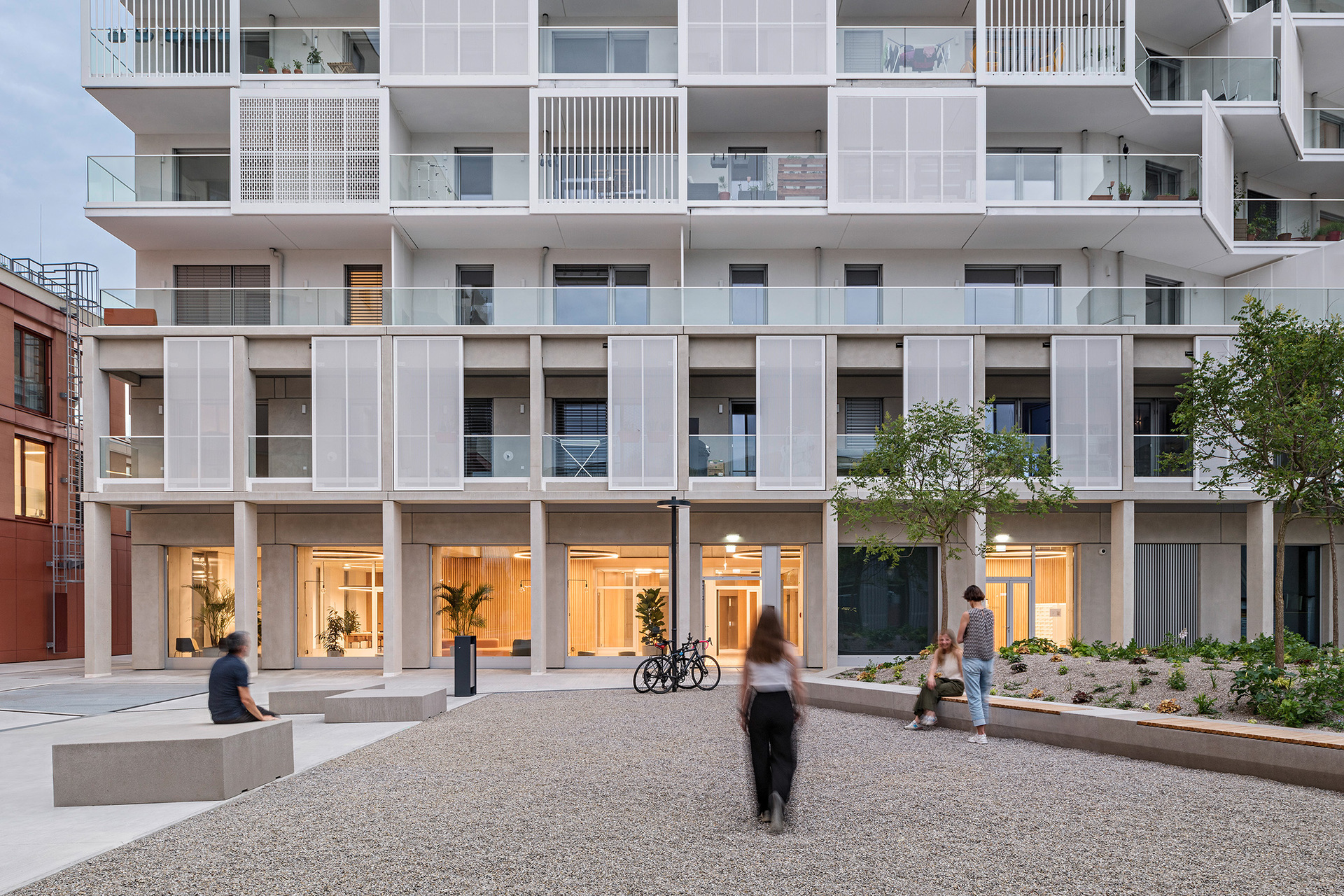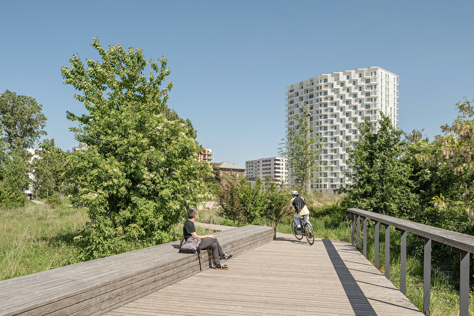 Ein Teil der ehemaligen Brachfläche bleibt als große, naturbelassene Stadtwildnis – die „freie Mitte“ – erhalten. Mit insgesamt sechs Wohntürmen wird die urbane Verdichtung am Rand der Freifläche in die Höhe getrieben.