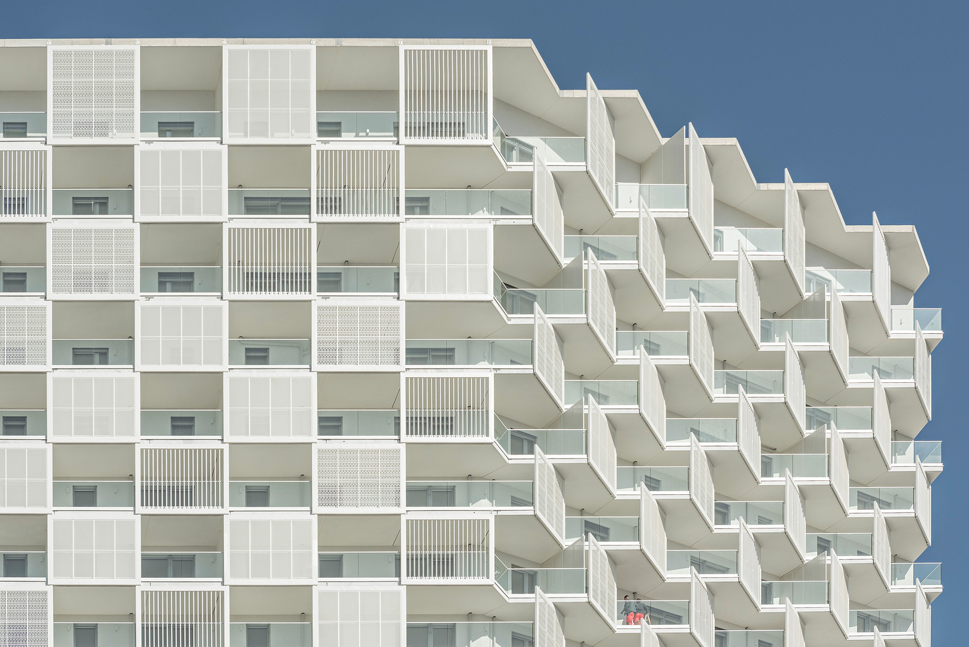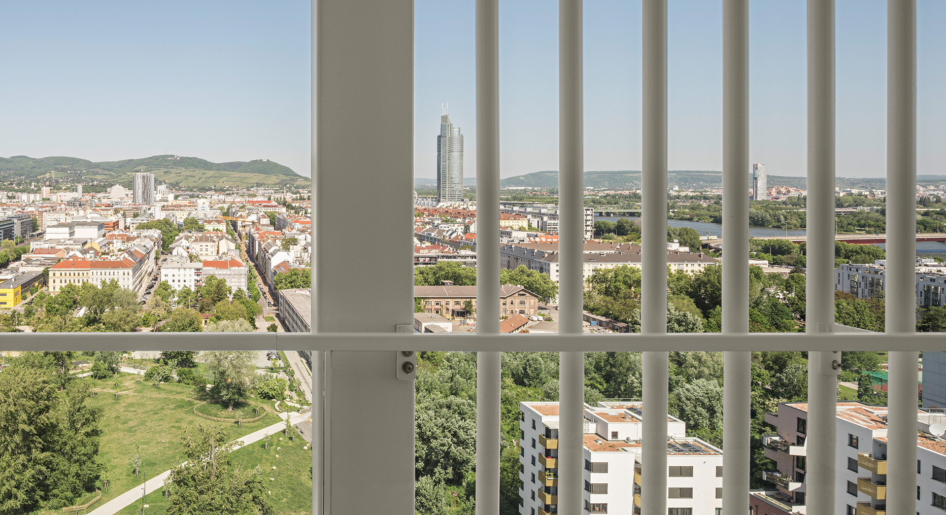 Der Wohnturm steht dynamisch, elegant und luftig an der Stadtwildnis und wendet sich den Grünflächen zu. Die loggienartig gestalteten Balkone entlang der Längsseiten zeigen ein luftig-leichtes Schachbrett aus offenen Bereichen mit verglasten Brüstungen und geschlossen wirkenden Verschattungselementen, die mit unterschiedlicher Dichte an orientalische Maschrabiyyas erinnern. Das Gesamtbild nimmt Anleihen an Großmutters Strickschals mit Mustern aus glatten und verkehrten Maschen. (Autor: Achim Geissinger, nach einem Text der Architekten)