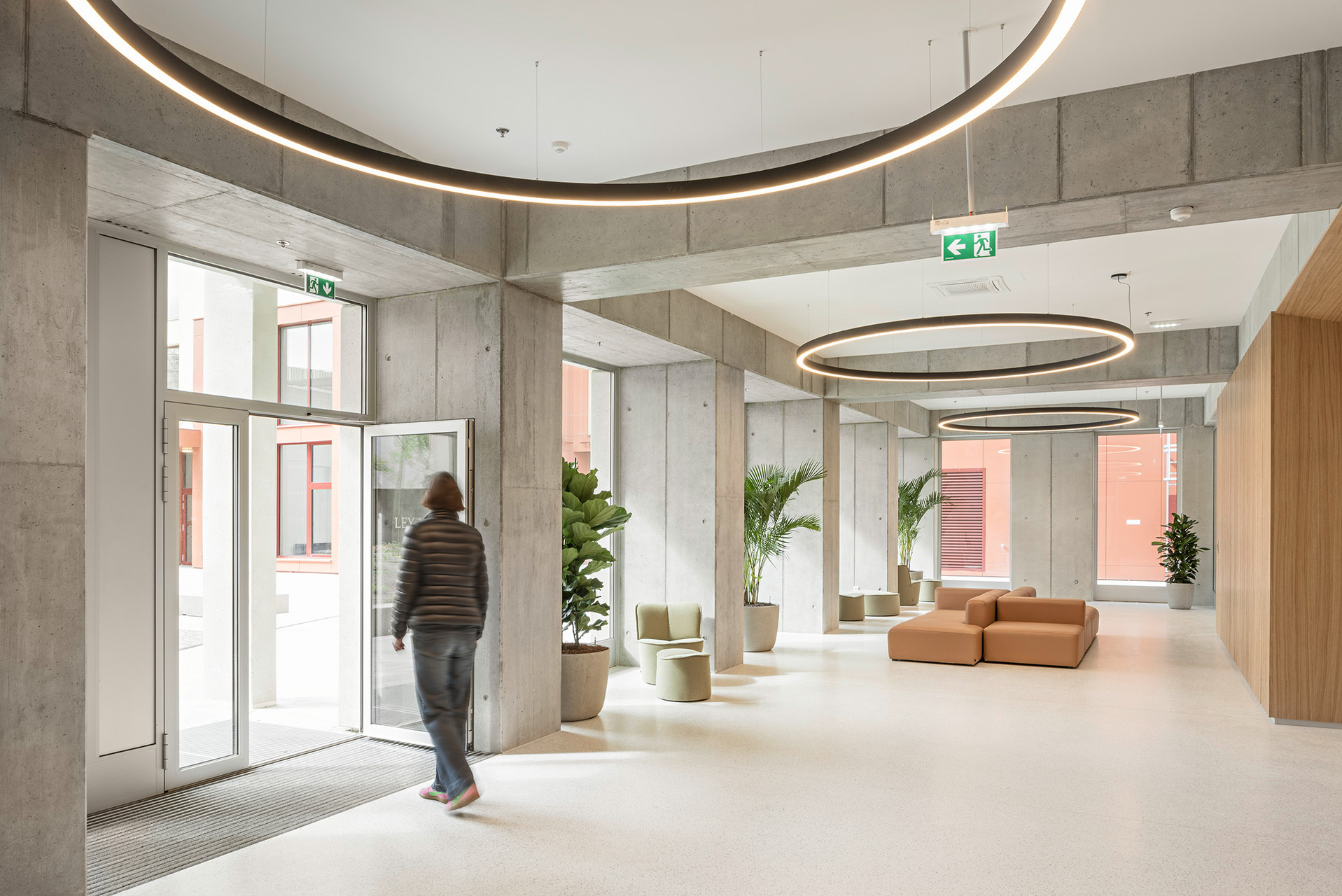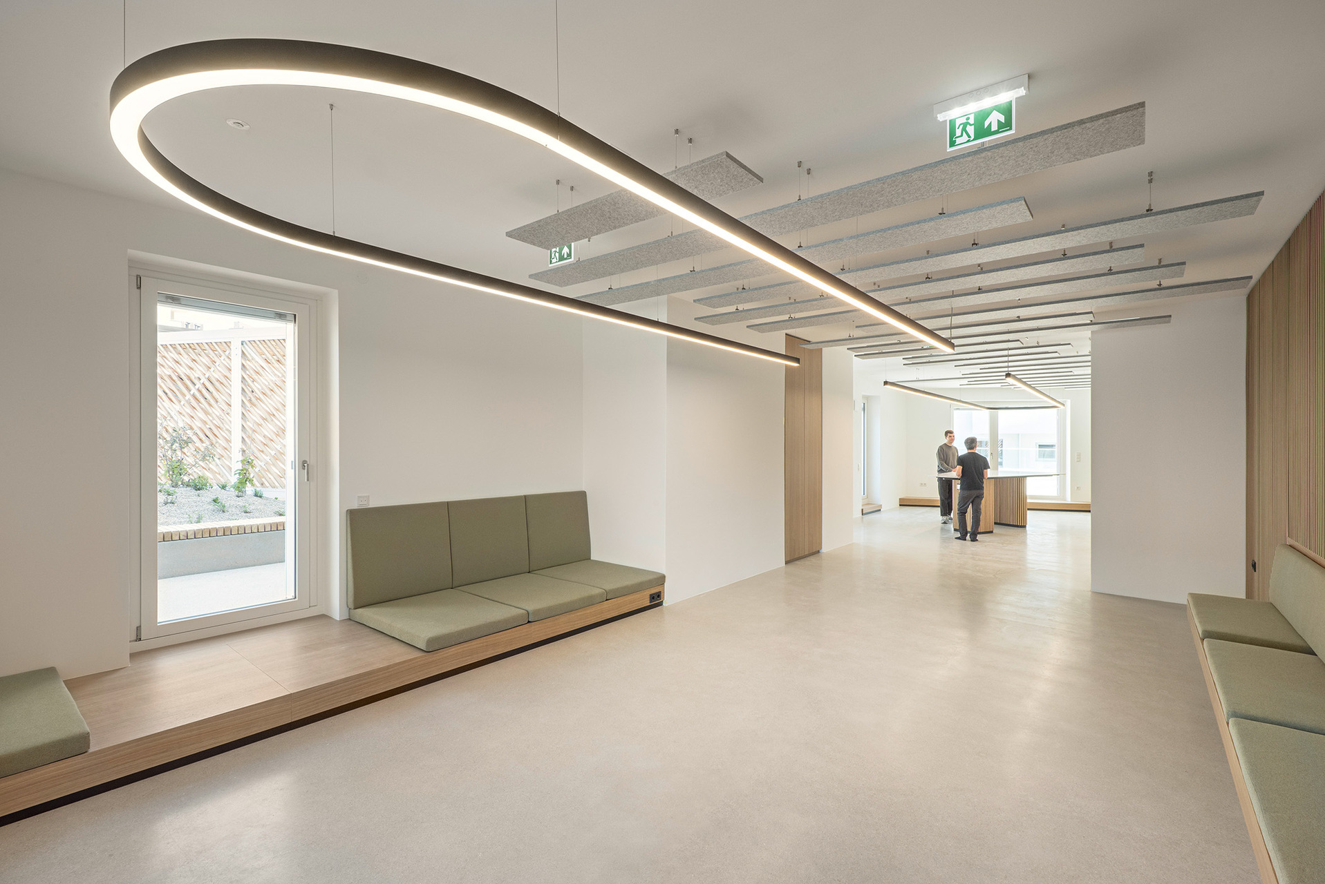 Die identitätsstiftende Form ergibt sich aus dem Knick zweier Hausseiten und somit einer scheinbaren leichten Verdrehung der Wohngeschosse gegenüber dem Sockel. Das EG bietet Raum für Lounge, Co-Working, Fitness, Fahrräder und obenauf eine Gemeinschaftsterrasse.