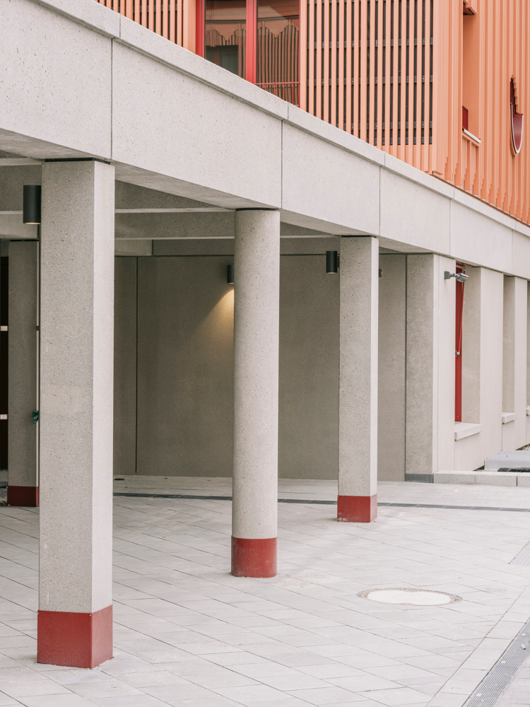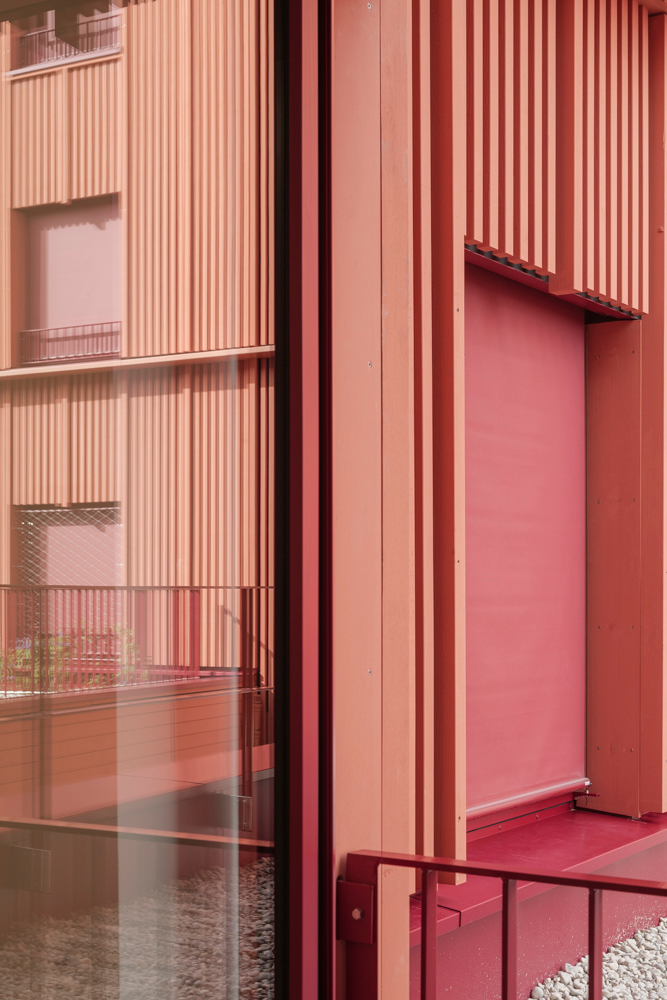 Auffälligstes Mittel ist die terracottafarbene Holzfassade mit ihren schlanken, vertikal verlegten Latten aus Weißtanne sowie die verspielte, rokokohafte Bordüre aus insgesamt 720 Opferbrettern, die sich ganz oben wie Omamas Häkeldeckchen um das Haus legt. Ab und zu schummelt sich ein rundes Bullauge dazwischen. Kenner der Architekturgeschichte werden darin leicht ein Zitat auf das 1927 errichtete Ledigenheim im Münchner Westend erkennen, das Architekt Theodor Fischer als Antwort auf die damals schon dramatische Wohnungsnot geplant hat. Während Fischers Ledigenheim bis heute ein Auffangbecken für all jene ist, die für eine reguläre Miete in München nicht genug verdienen, landen hier, im roten Haus in der Lotte-Branz-Straße, all die anderen, die durch alle sozialen und kommunalen Netze gefallen sind.