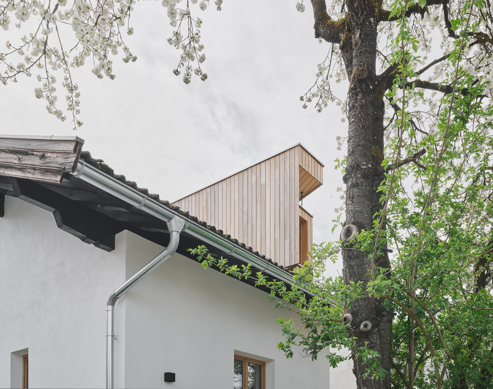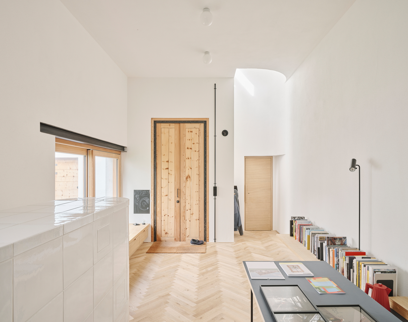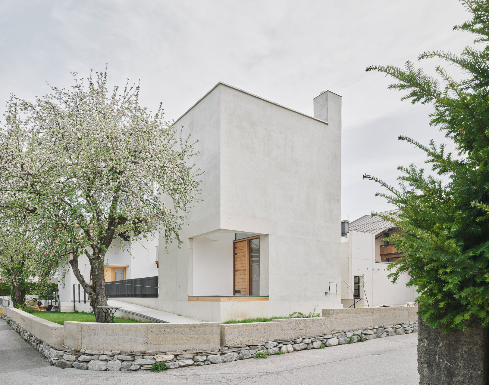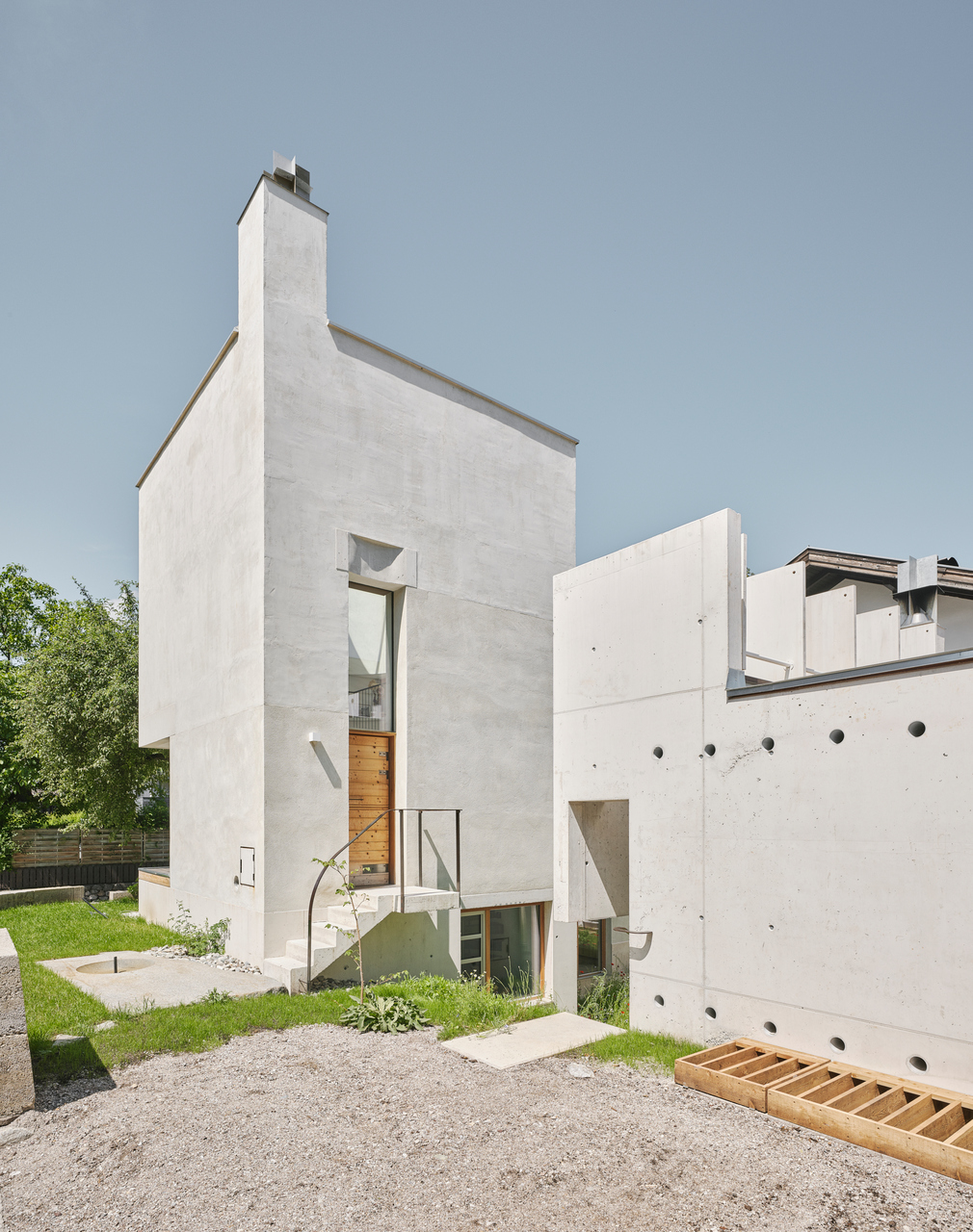 Die kleine, 68 m² große Wohnung bildet den südwestlichen Teil der Hausgruppe. Angedockt an das Bestandgebäude verläuft ein dem Atrium zugeordneter eingeschoßiger Wohnraum, der in einen kleinen Turm mündet. Dieser ist ebenfalls nahezu fensterlos, das Tageslicht wird über eine sehr große Dachoberlichte in die vertikale, skulpturartige Raumstruktur geführt. Von der Eingangsebene mit Koch- und Essbereich führt eine frei in den Raum gestellte Treppe hinauf zu einer Galerie und hinunter zu Umkleide, Bad und dem als Schlafraum genutzten Atriumzimmer. In die straßenseitige Ecke des Turms wurde eine kleine Terrasse eingeschnitten, die als Essplatz im Freien dient. (Text: Claudia Wedekind, nach einem Text des Architekten)