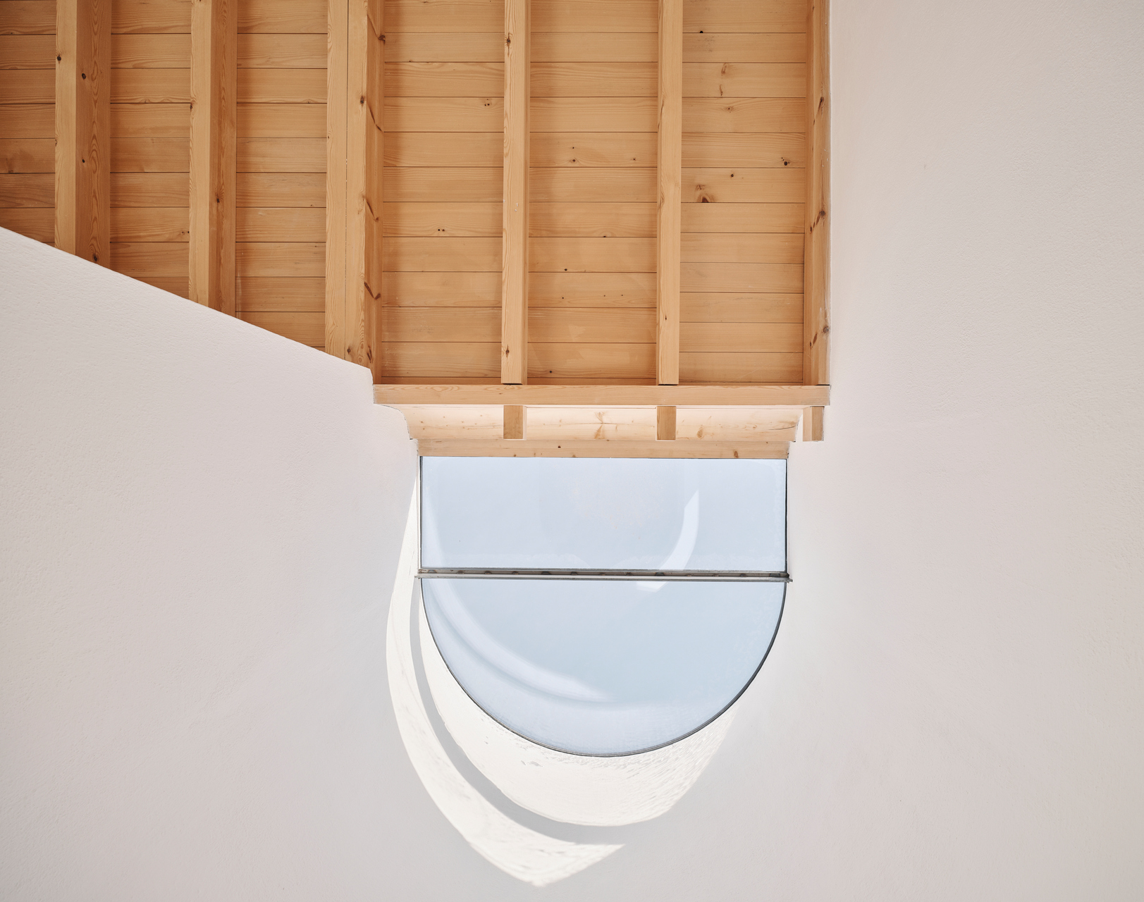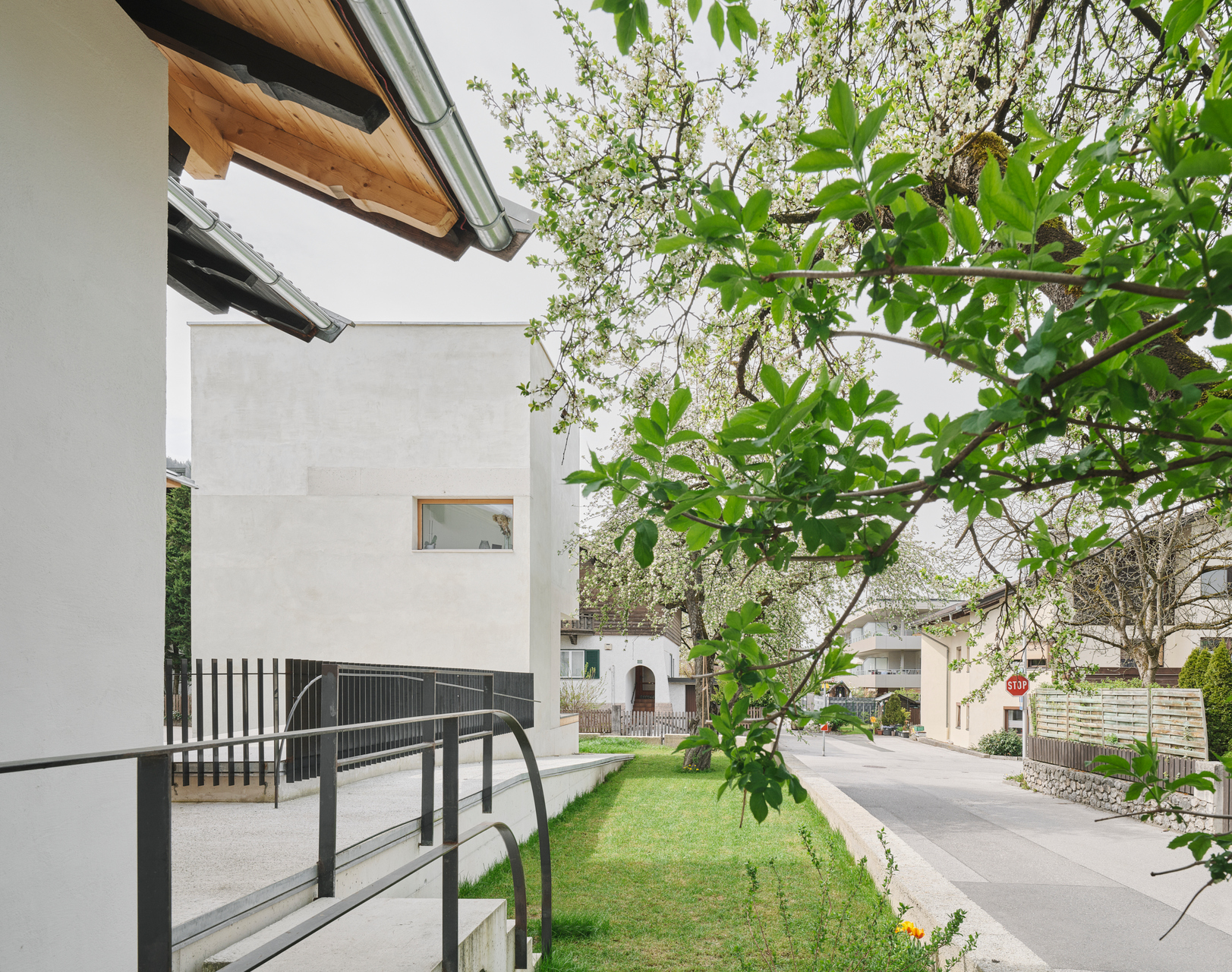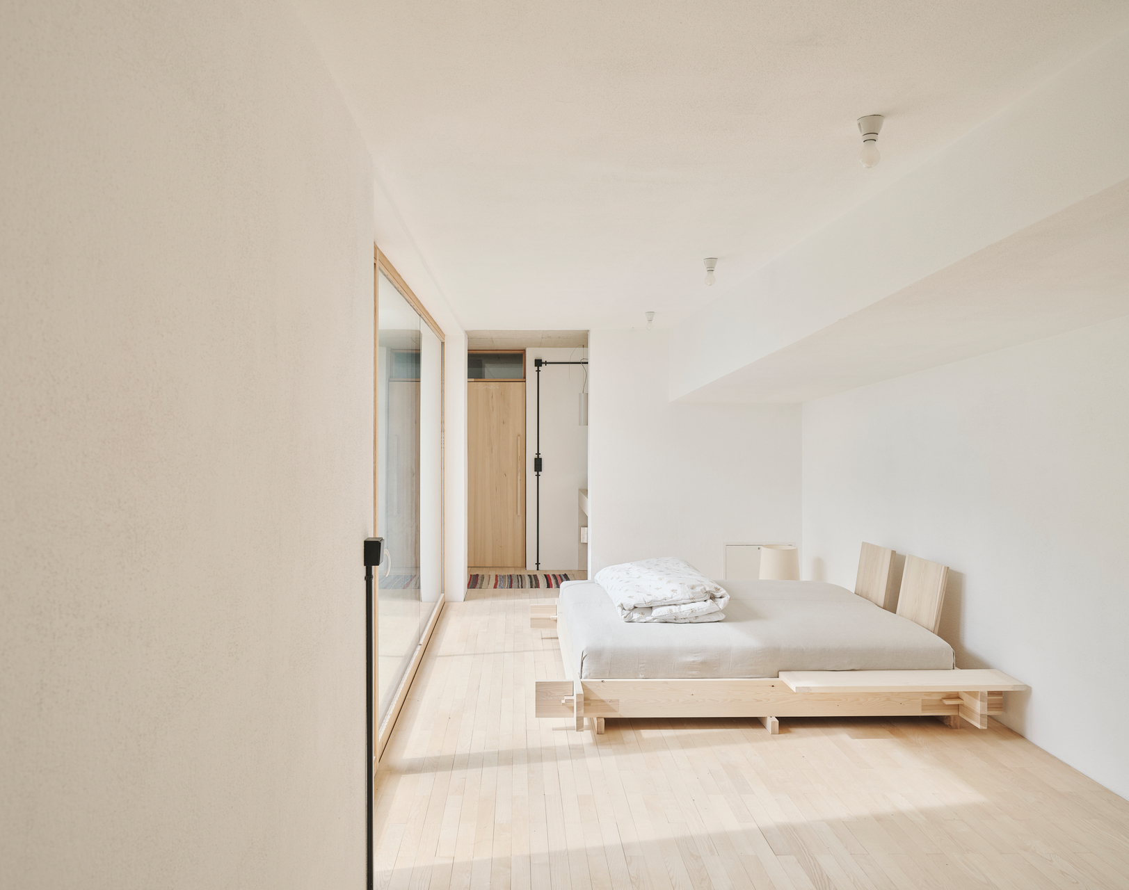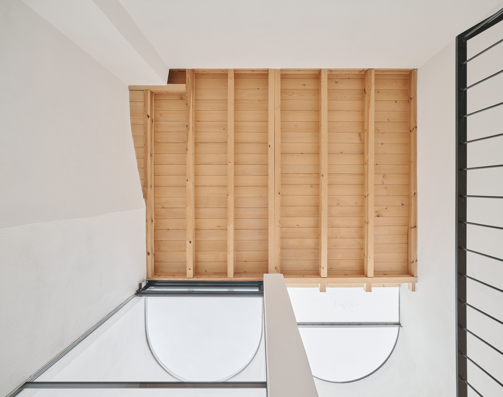 Die kleine, 68 m² große Wohnung bildet den südwestlichen Teil der Hausgruppe. Angedockt an das Bestandgebäude verläuft ein dem Atrium zugeordneter eingeschoßiger Wohnraum, der in einen kleinen Turm mündet. Dieser ist ebenfalls nahezu fensterlos, das Tageslicht wird über eine sehr große Dachoberlichte in die vertikale, skulpturartige Raumstruktur geführt. Von der Eingangsebene mit Koch- und Essbereich führt eine frei in den Raum gestellte Treppe hinauf zu einer Galerie und hinunter zu Umkleide, Bad und dem als Schlafraum genutzten Atriumzimmer. In die straßenseitige Ecke des Turms wurde eine kleine Terrasse eingeschnitten, die als Essplatz im Freien dient. (Text: Claudia Wedekind, nach einem Text des Architekten)