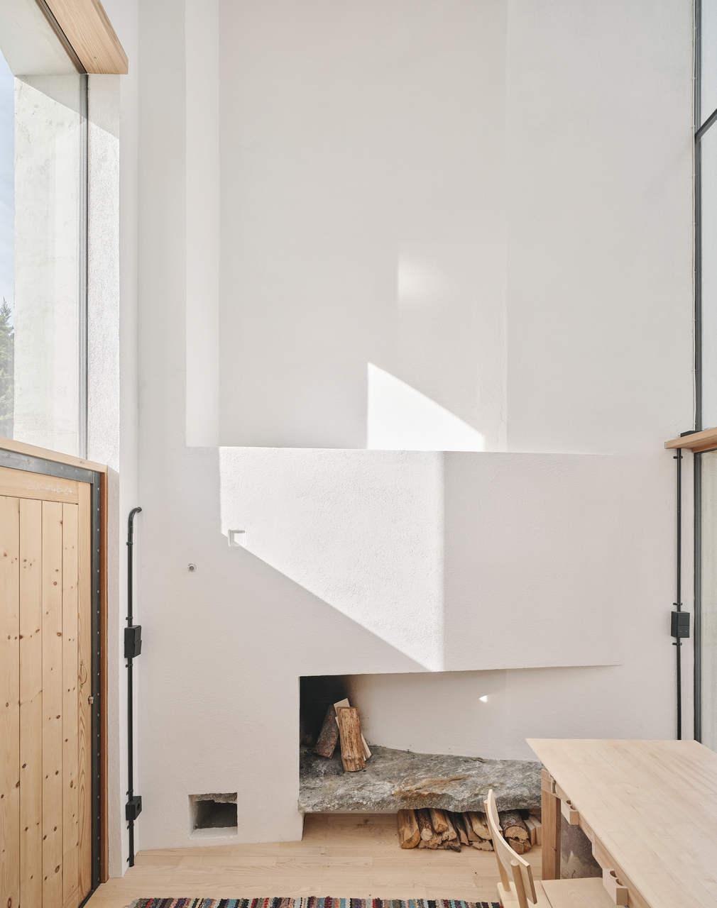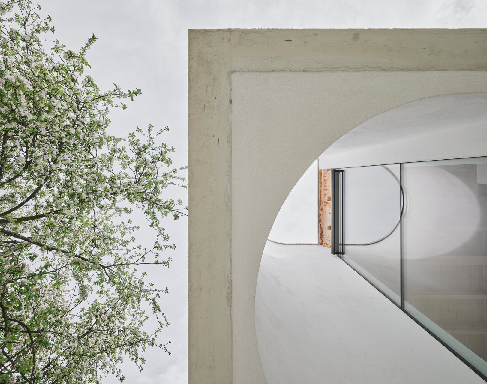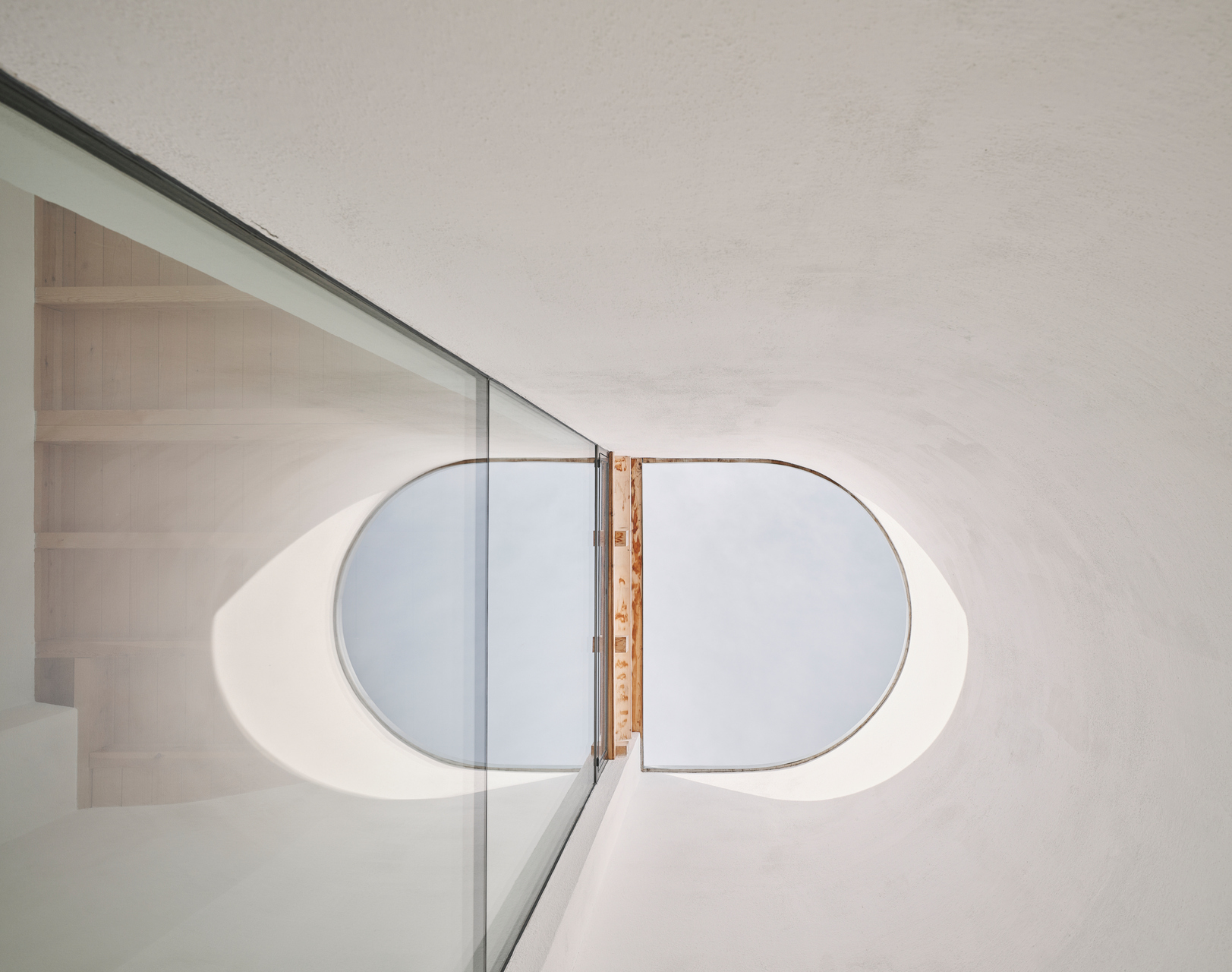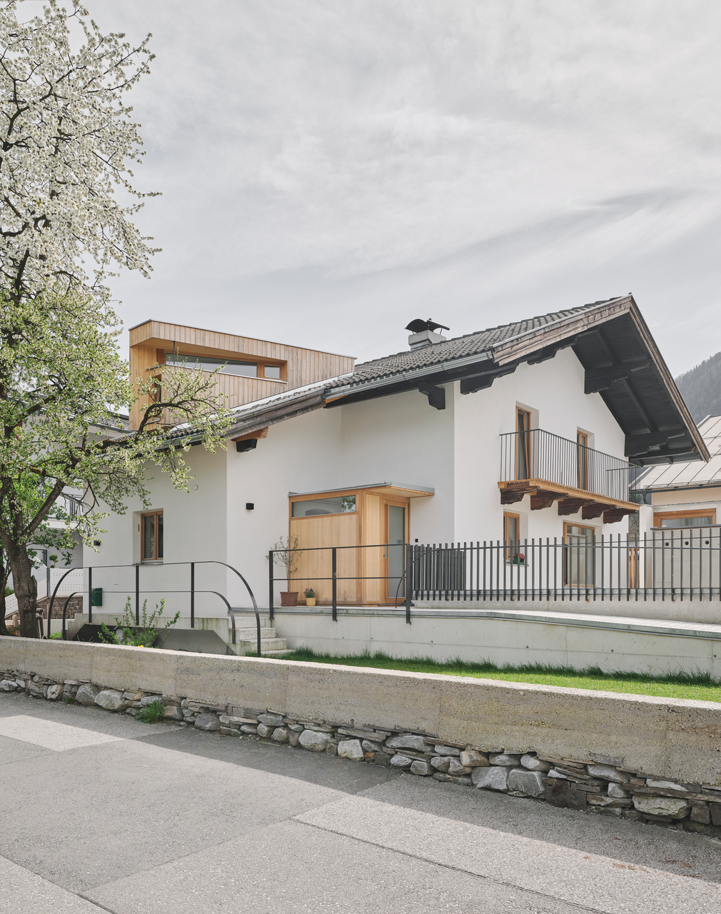 Die kleine, 68 m² große Wohnung bildet den südwestlichen Teil der Hausgruppe. Angedockt an das Bestandgebäude verläuft ein dem Atrium zugeordneter eingeschoßiger Wohnraum, der in einen kleinen Turm mündet. Dieser ist ebenfalls nahezu fensterlos, das Tageslicht wird über eine sehr große Dachoberlichte in die vertikale, skulpturartige Raumstruktur geführt. Von der Eingangsebene mit Koch- und Essbereich führt eine frei in den Raum gestellte Treppe hinauf zu einer Galerie und hinunter zu Umkleide, Bad und dem als Schlafraum genutzten Atriumzimmer. In die straßenseitige Ecke des Turms wurde eine kleine Terrasse eingeschnitten, die als Essplatz im Freien dient. (Text: Claudia Wedekind, nach einem Text des Architekten)
