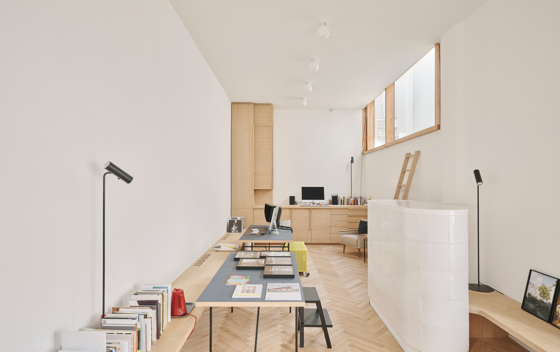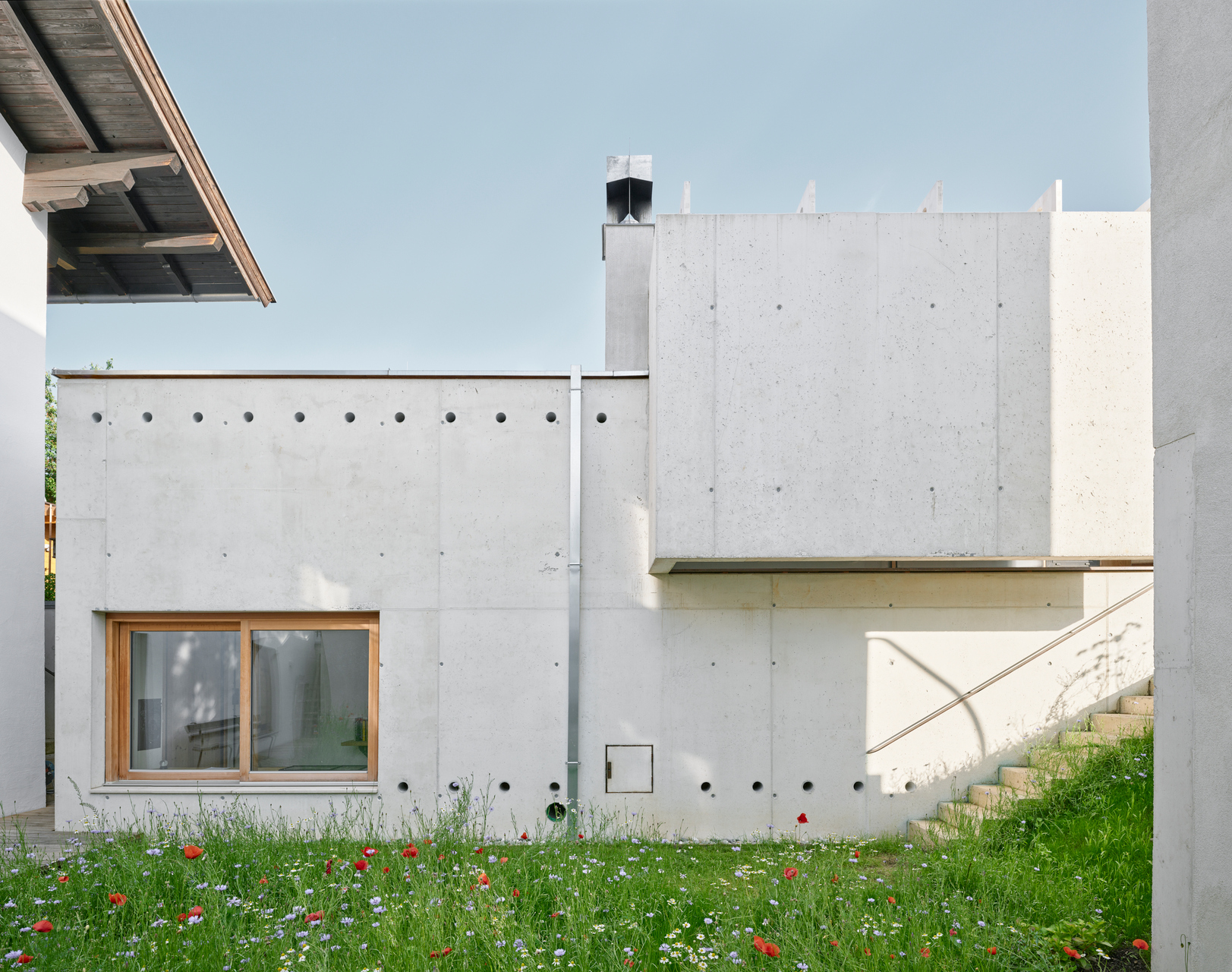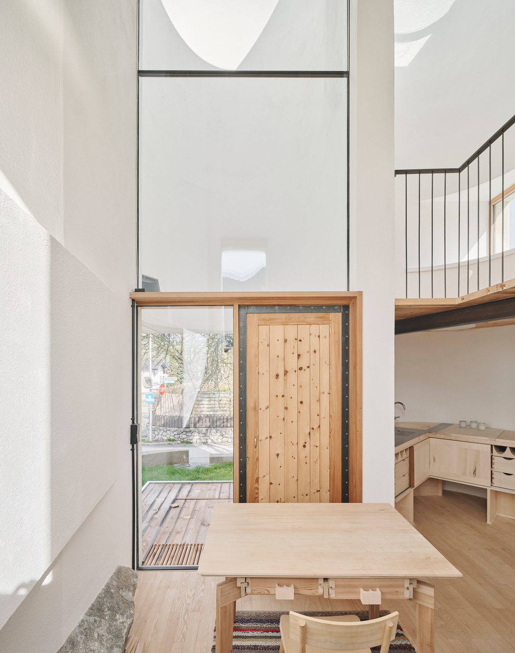 Der neue, vom Garten aus betretbare Arbeitsraum wurde an die Längsseite des Grundstücks gesetzt. Durch die Absenkung des Gartens und die Ausnutzung der maximal möglichen Bebauungshöhe konnte ein 4 m hoher Innenraum geschaffen werden, der über ein großes Fenster Richtung Atrium und vor allem durch indirektes Tageslicht von oben belichtet wird. Der Innenraum wurde bewusst sehr einfach gestaltet und bietet so einen neutralen Rahmen für konzentriertes Arbeiten.