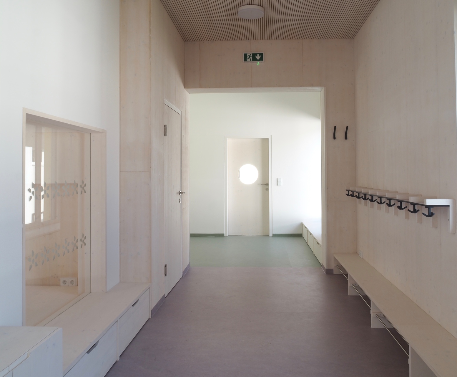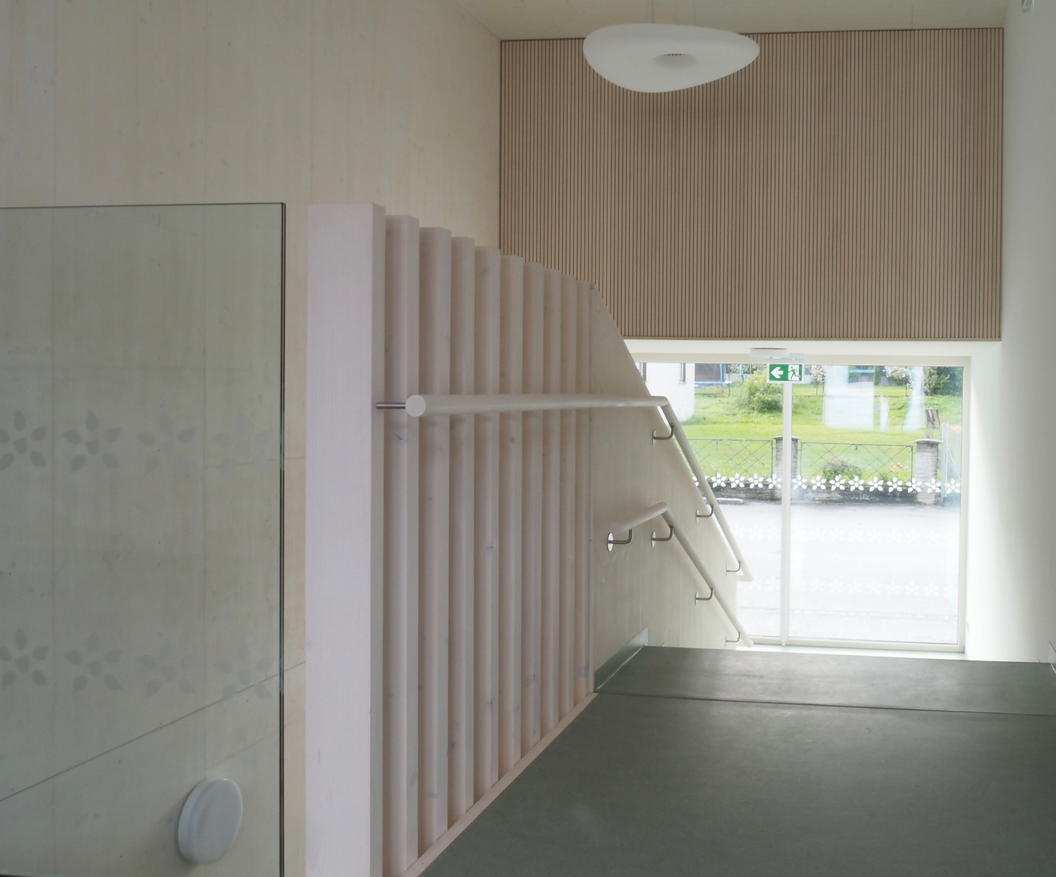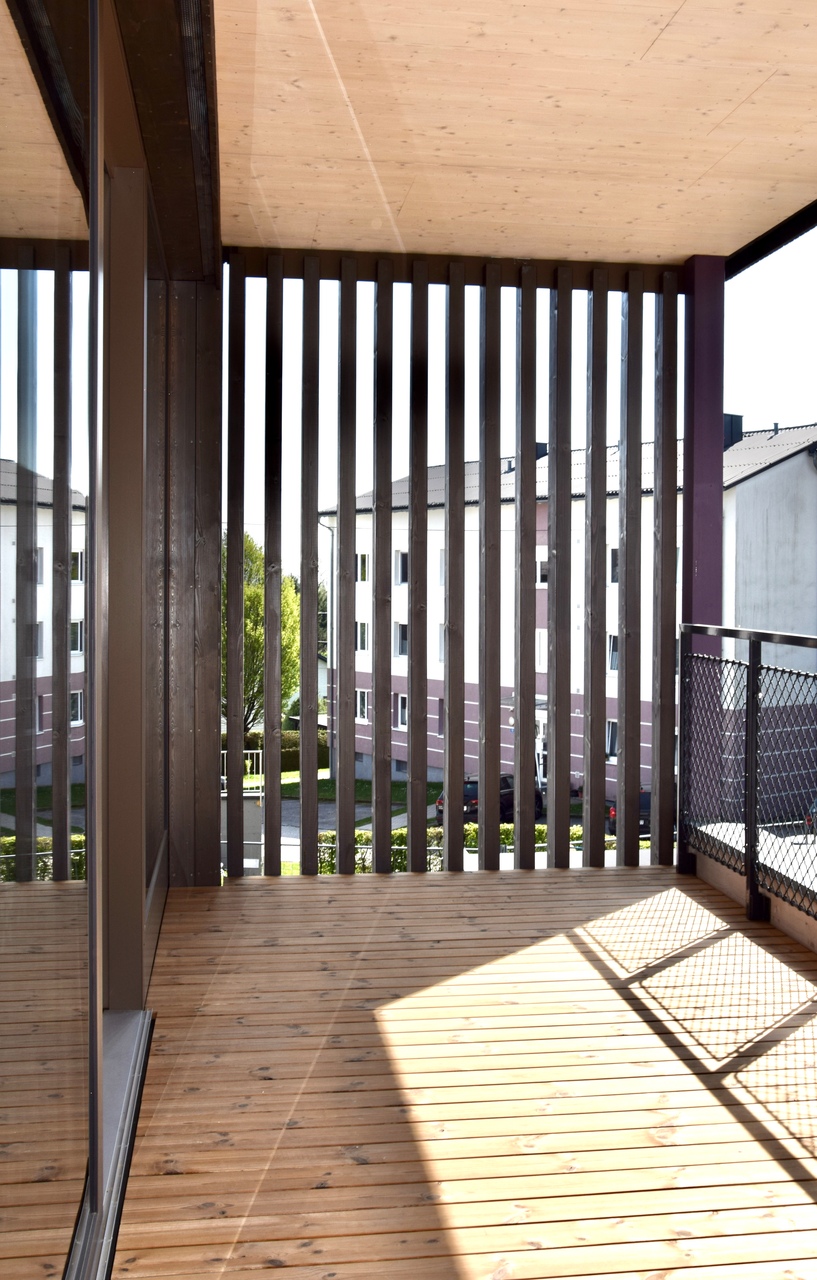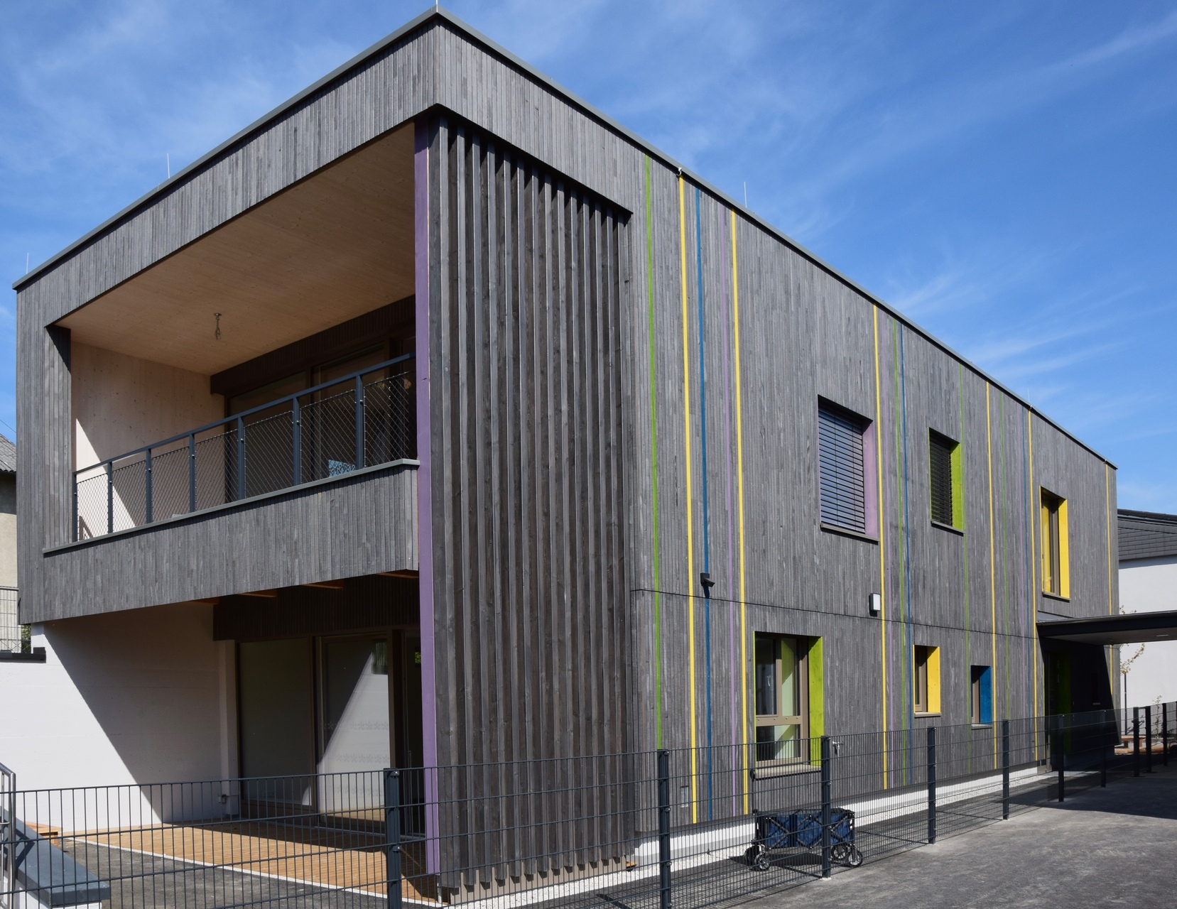 Ein Anbau in Holzbauweise nimmt die Erschließung, die Sanitär- und Personalräume auf. Die Aufstockung, ebenfalls in Holz, bietet Platz für die zweite Gruppe. Der Nebeneingang im Halbgeschoss erleichtert die Erreichbarkeit des Gartens. Großzügige Loggien im Süden ermöglichen solare Gewinne ohne die Räume zu überhitzen. Ein Holzkleid aus vertikalen Fassadenbrettern hüllt das gesamte Gebäude ein und gewährleistet auch für den Bestand eine optimale Dämmung.