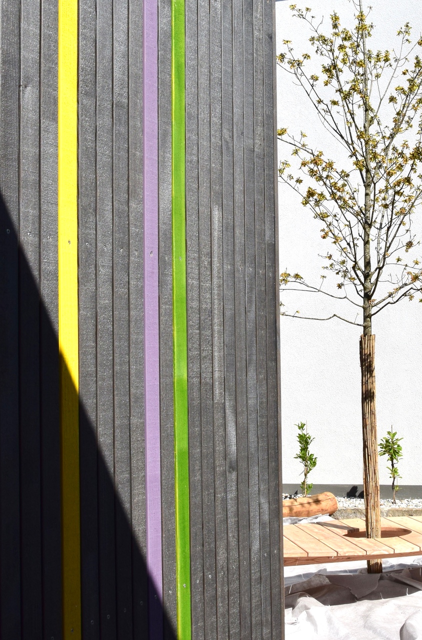 In das Schulensemble der 1970er Jahre mit seinen typischen Pultdächern fügt sich der dunkle Baukörper unaufdringlich ein. Einzelne Farbakzente verweisen auf die Funktion und bilden zugleich eine thematische Verbindung mit dem Kindergarten in unmittelbarer Nähe, bei dessen Sanierung und Erweiterung ebenfalls Holzlasuren in diesen Farben zur Anwendung kamen. (Text: Architekt:innen, bearbeitet)