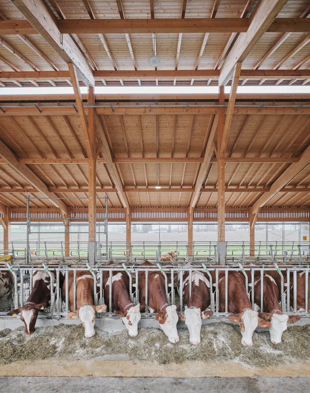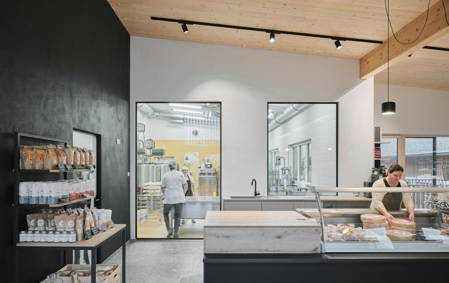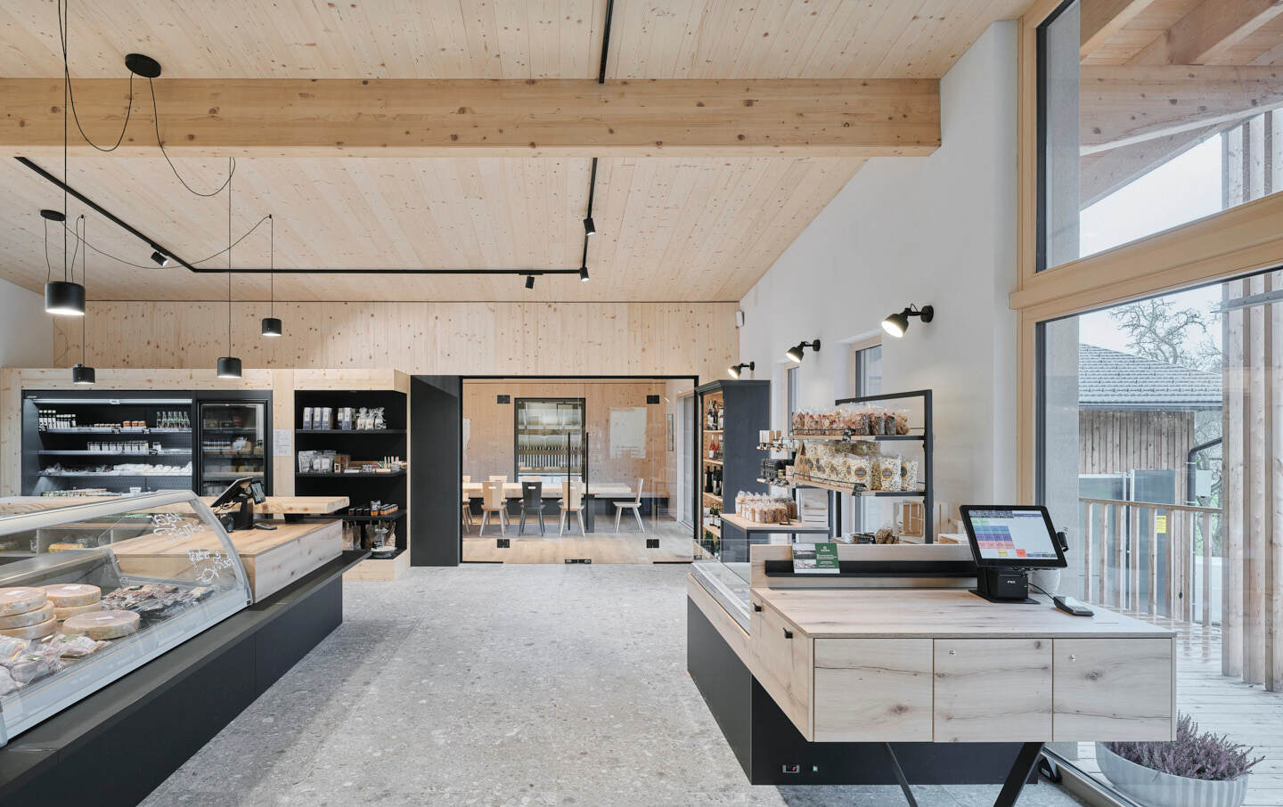Der Hofladen wird über eine vorgelagerte Zugangsterrasse von Westen her erschlossen. Die Produktionsräume sind gut einsehbar, transparent und damit kundenfreundlich organisiert. Vom Seminarraum ist der direkte Blick in den Kuhstall möglich. Das Konzept der sichtbaren Holzkonstruktion wurde, wo die Hygieneanforderungen dies zulassen, auch im Innenbereich an Wänden und Decken eingesetzt. (Text: Architekt:innen, bearbeitet)