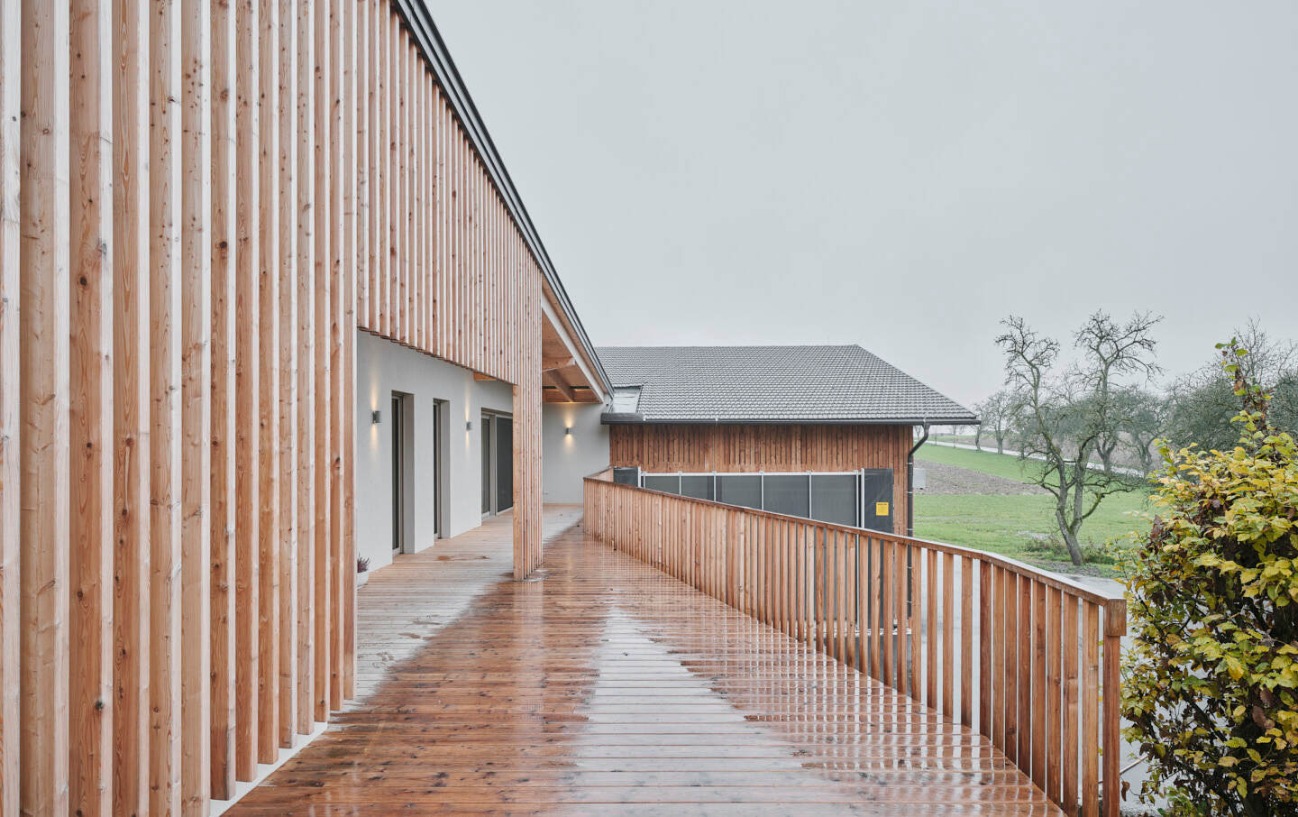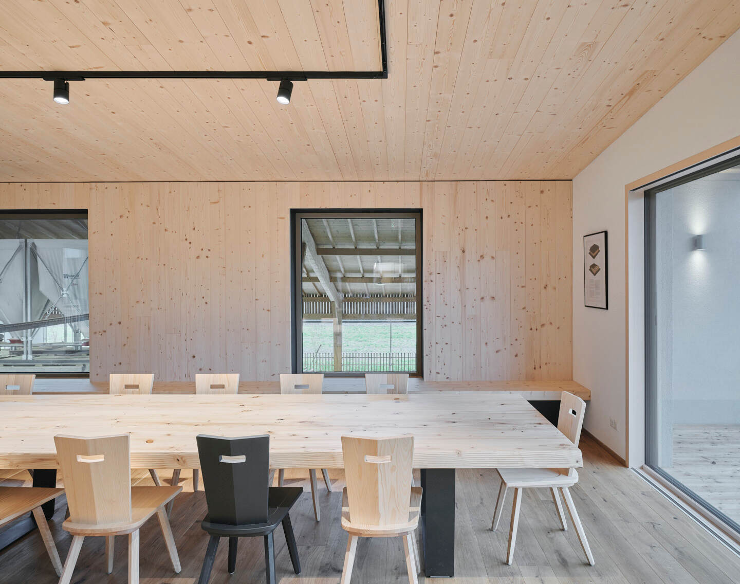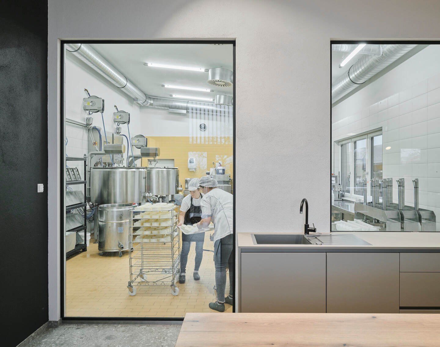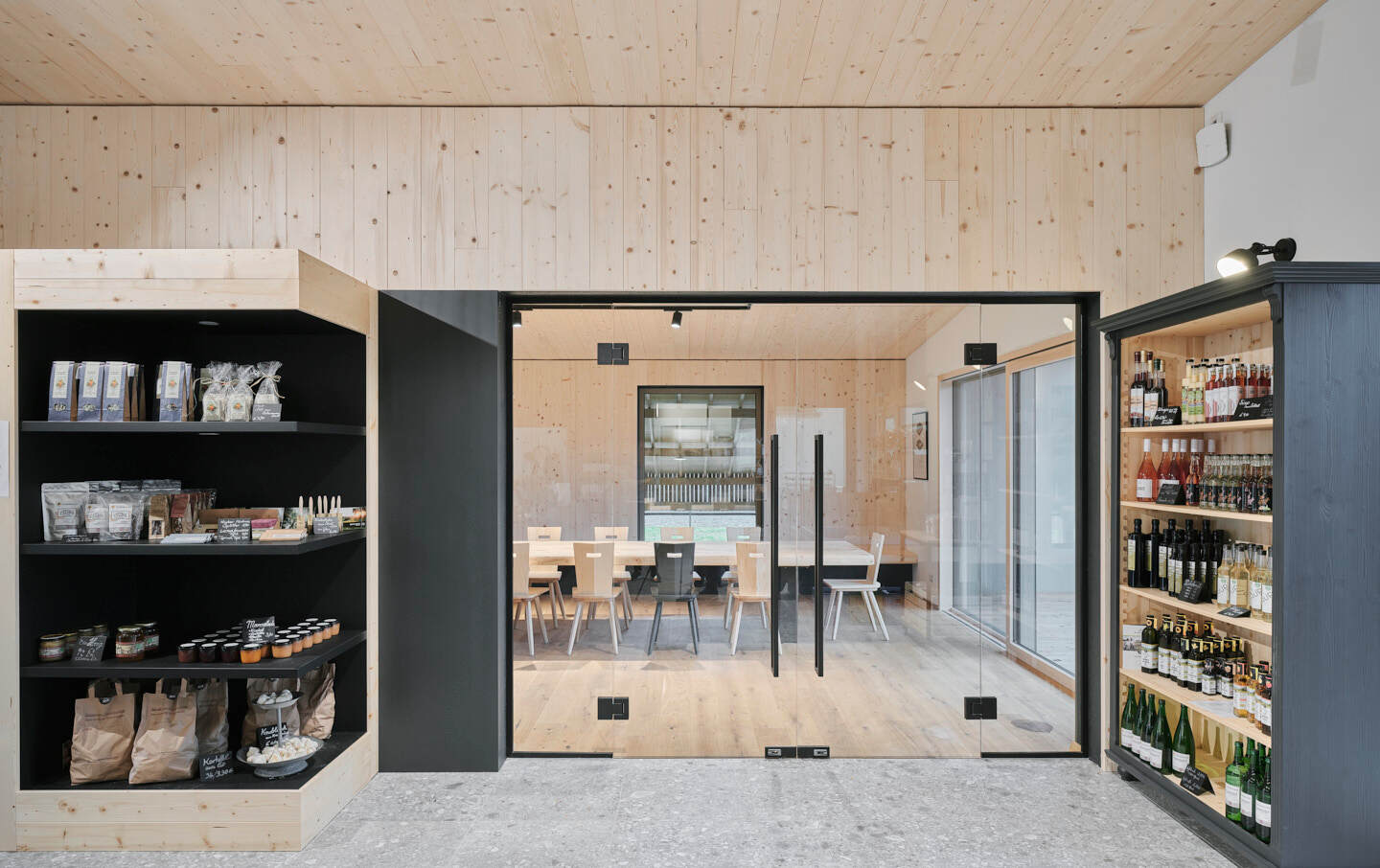 Der Hofladen wird über eine vorgelagerte Zugangsterrasse von Westen her erschlossen. Die Produktionsräume sind gut einsehbar, transparent und damit kundenfreundlich organisiert. Vom Seminarraum ist der direkte Blick in den Kuhstall möglich. Das Konzept der sichtbaren Holzkonstruktion wurde, wo die Hygieneanforderungen dies zulassen, auch im Innenbereich an Wänden und Decken eingesetzt. (Text: Architekt:innen, bearbeitet)