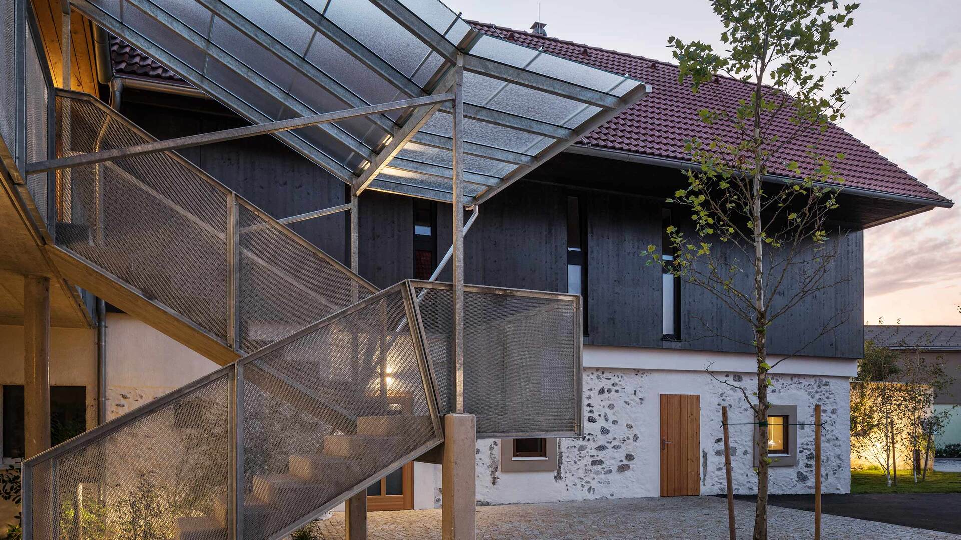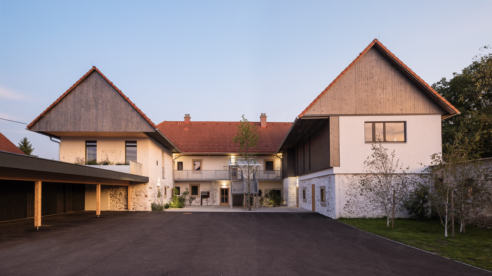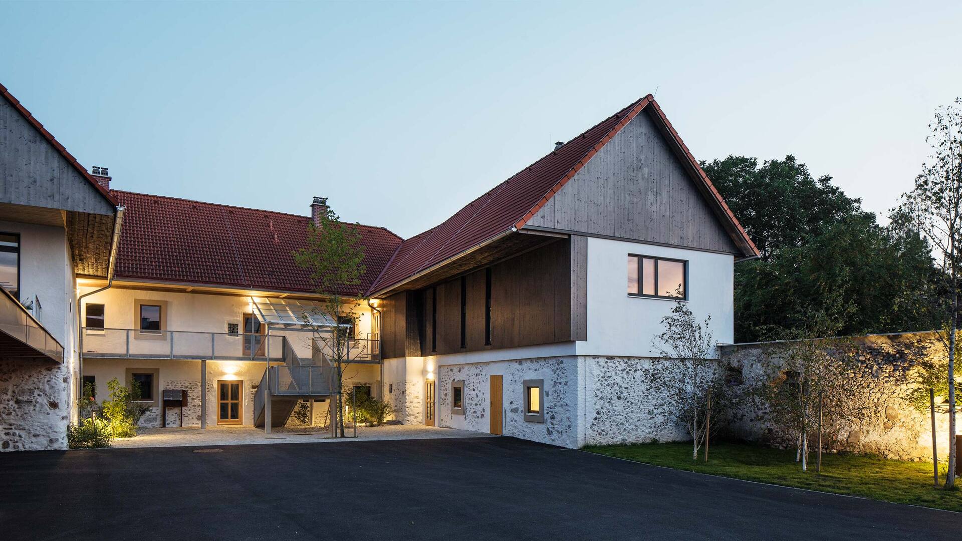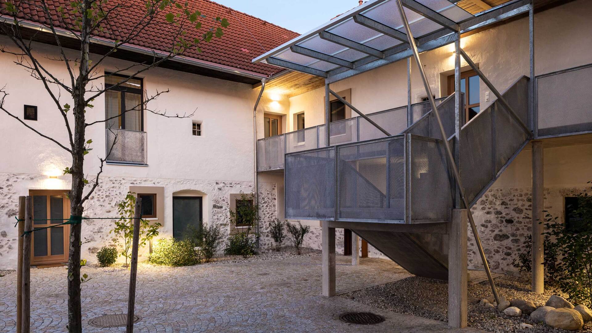 Die barrierefreie Erschließung des Obergeschosses wurde über einen neuen Laubengang und ein frei im Hof stehendes Treppenobjekt geschaffen. Die historische schmale und gewundene Bestandstreppe samt Balkendecke im Innenraum konnte dadurch erhalten bleiben. Die südseitigen Wohneinheiten Richtung Mühlbach wurden im Obergeschoss mit leichten Balkonkonstruktionen aus verzinktem Stahl ergänzt. Die Giebel- und Wandflächen der Seitenflügel wurden, in Analogie zum ursprünglichen Erscheinungsbild, mit einer vertikalen Holzverschalung eingekleidet. (Text: Tobias Hagleitner, nach einem Text des Architekten)