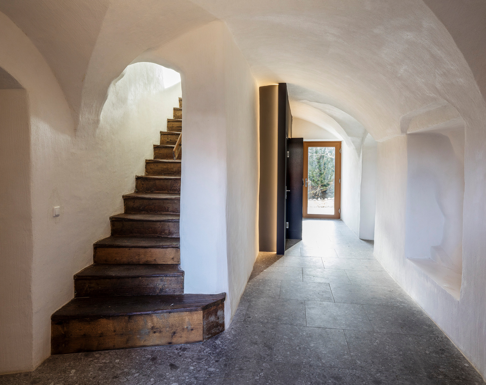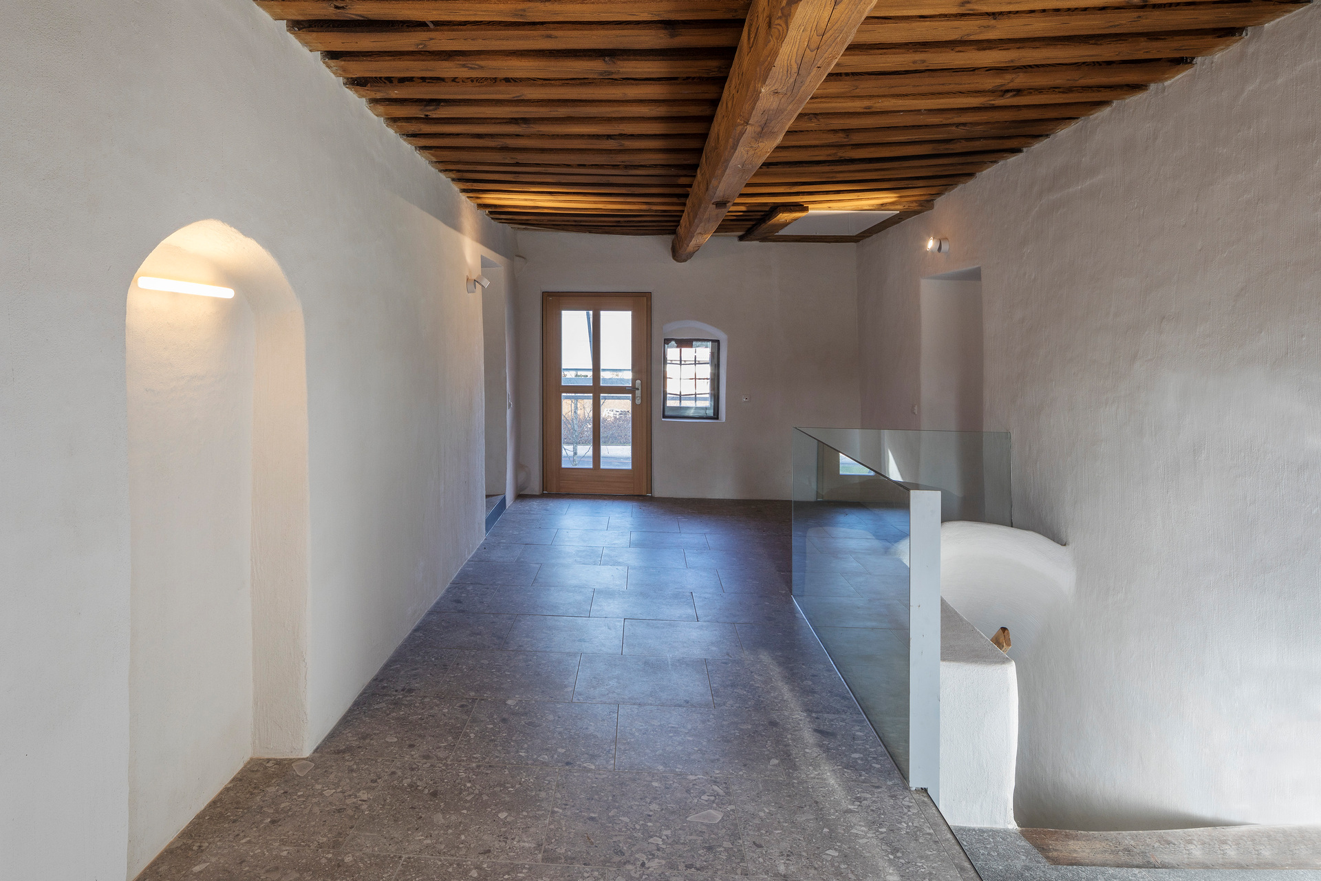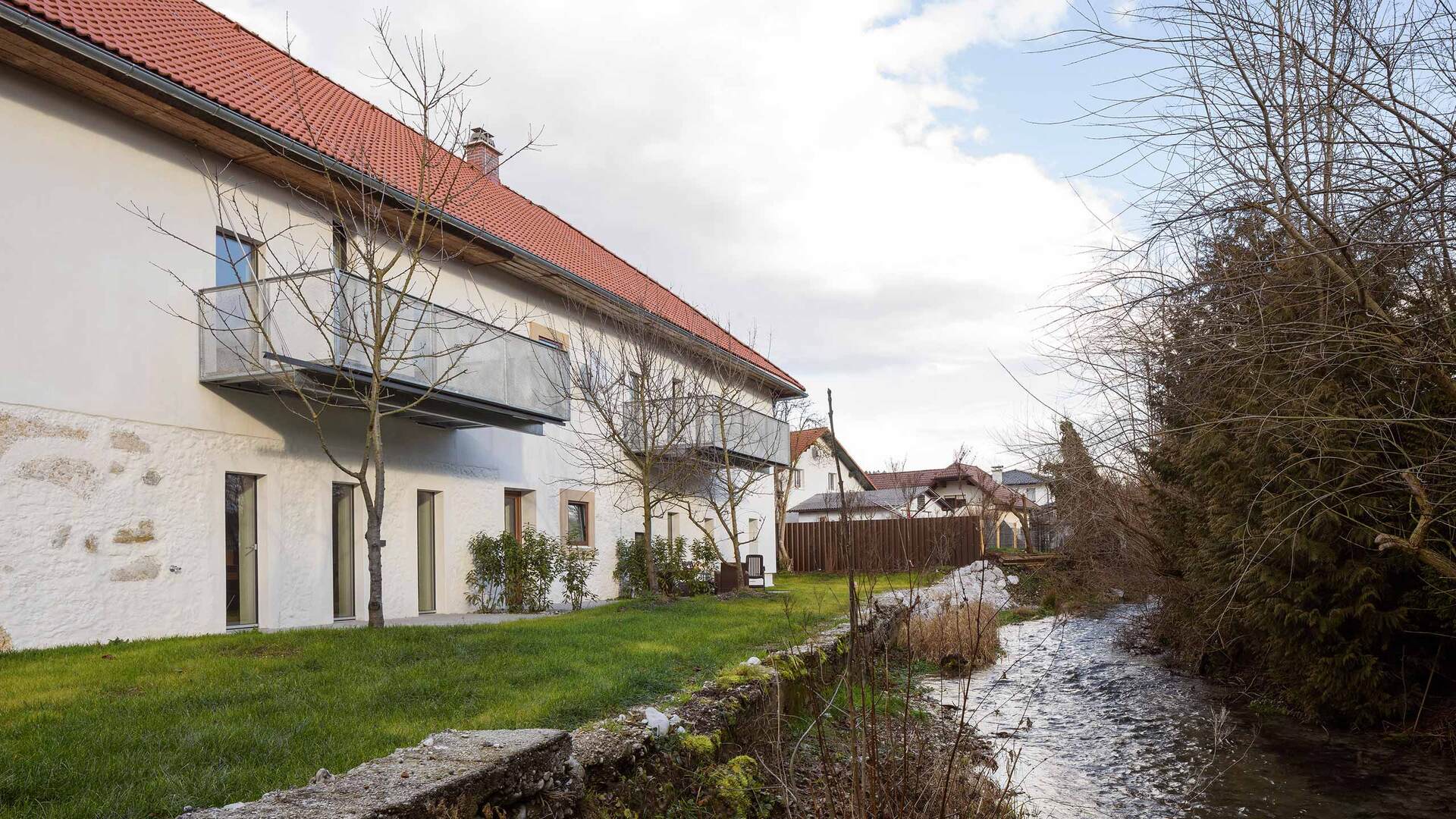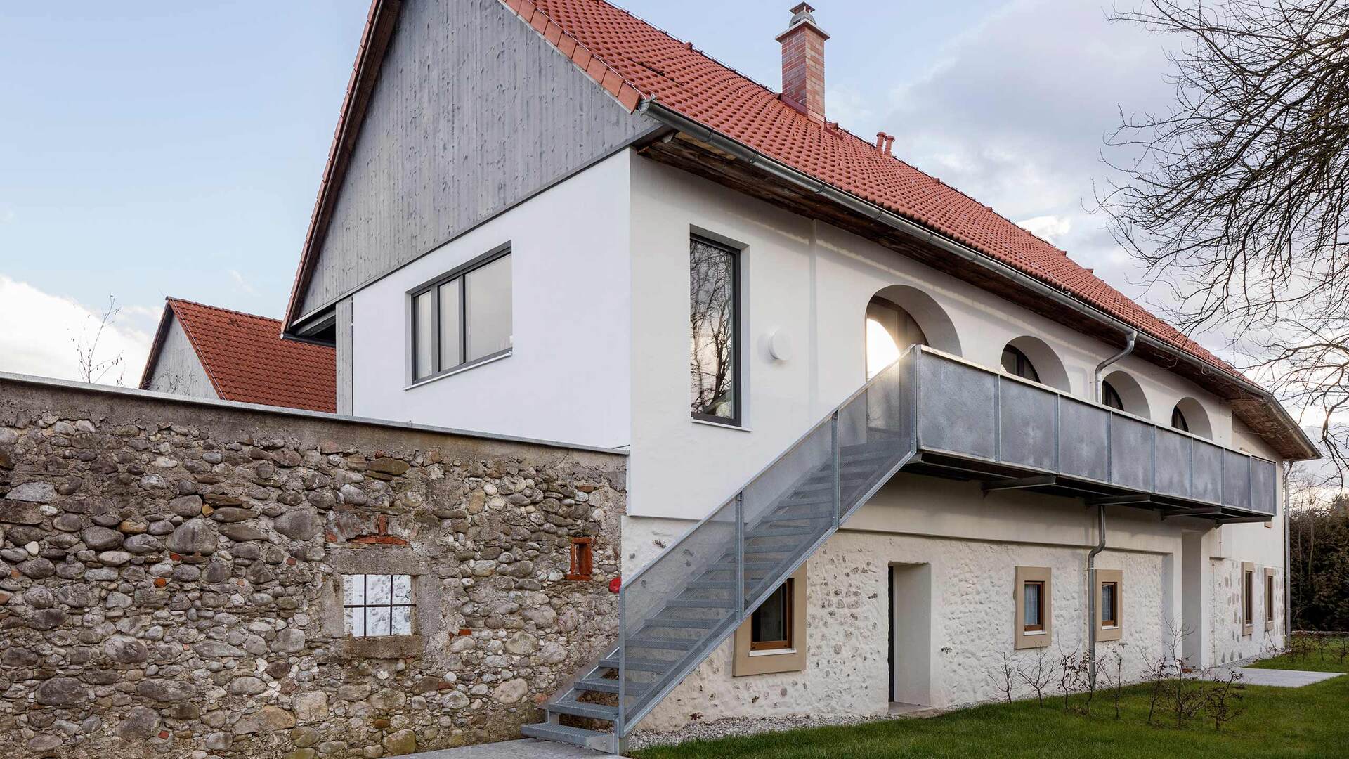 Die barrierefreie Erschließung des Obergeschosses wurde über einen neuen Laubengang und ein frei im Hof stehendes Treppenobjekt geschaffen. Die historische schmale und gewundene Bestandstreppe samt Balkendecke im Innenraum konnte dadurch erhalten bleiben. Die südseitigen Wohneinheiten Richtung Mühlbach wurden im Obergeschoss mit leichten Balkonkonstruktionen aus verzinktem Stahl ergänzt. Die Giebel- und Wandflächen der Seitenflügel wurden, in Analogie zum ursprünglichen Erscheinungsbild, mit einer vertikalen Holzverschalung eingekleidet. (Text: Tobias Hagleitner, nach einem Text des Architekten)