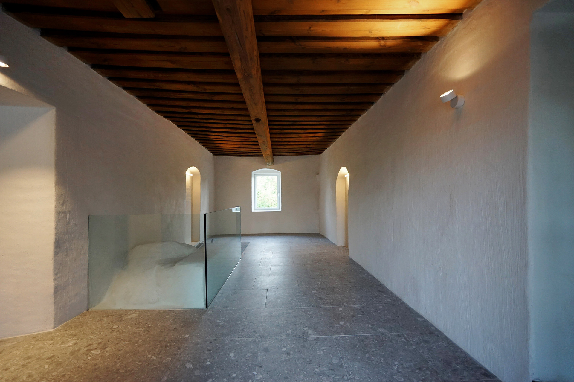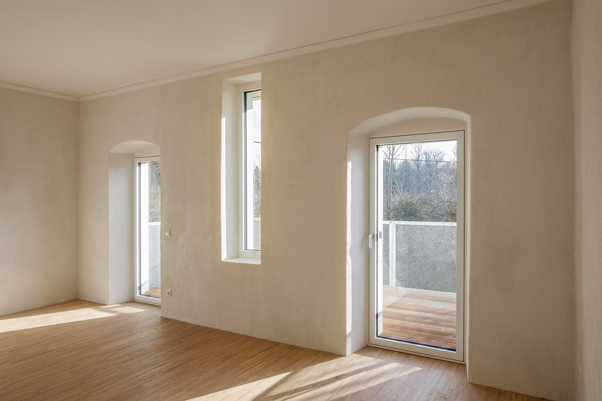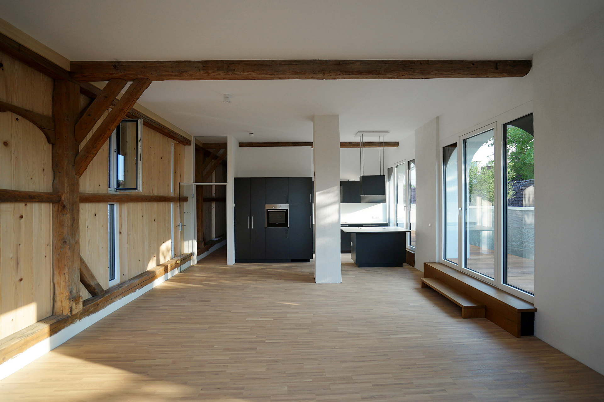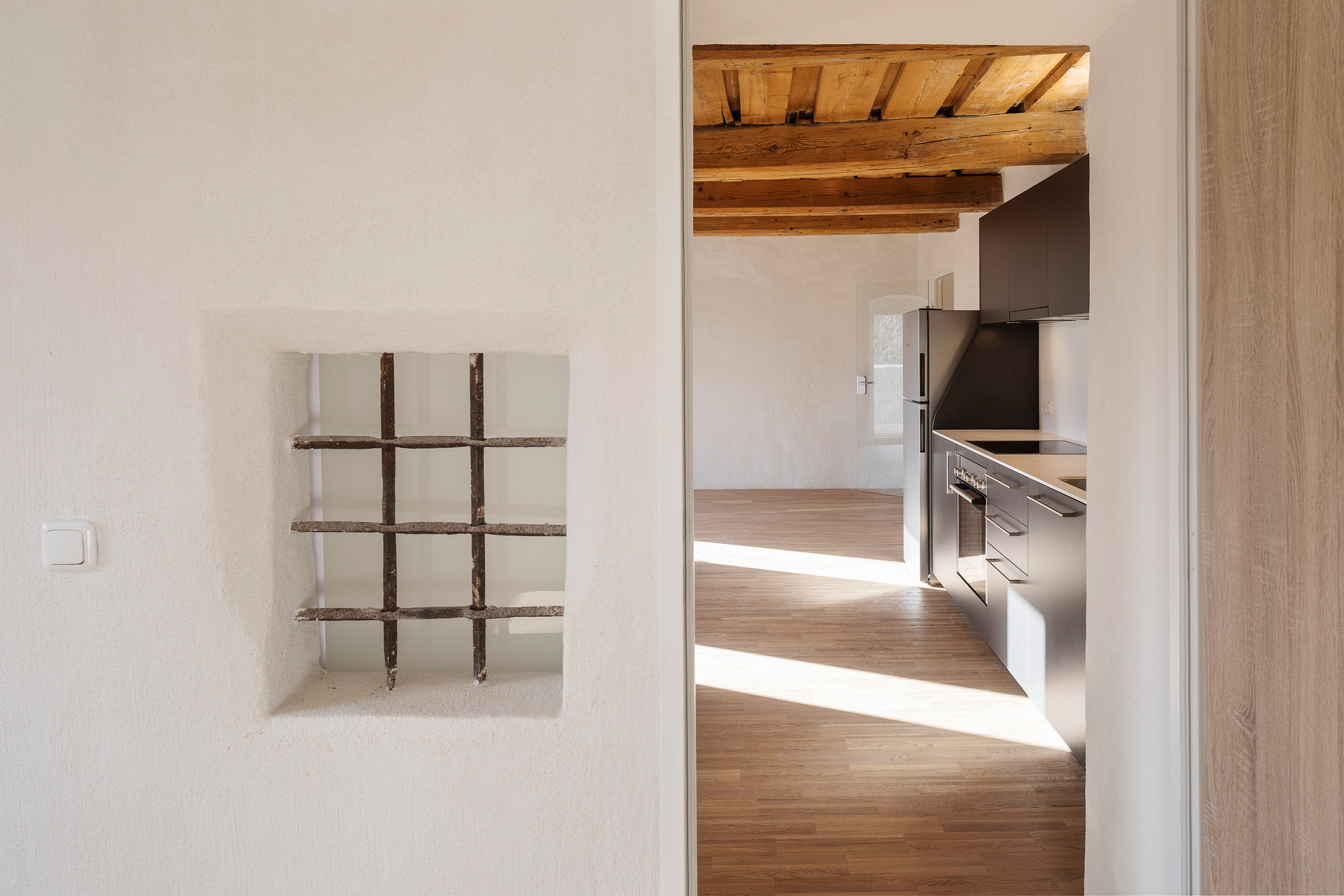 Die barrierefreie Erschließung des Obergeschosses wurde über einen neuen Laubengang und ein frei im Hof stehendes Treppenobjekt geschaffen. Die historische schmale und gewundene Bestandstreppe samt Balkendecke im Innenraum konnte dadurch erhalten bleiben. Die südseitigen Wohneinheiten Richtung Mühlbach wurden im Obergeschoss mit leichten Balkonkonstruktionen aus verzinktem Stahl ergänzt. Die Giebel- und Wandflächen der Seitenflügel wurden, in Analogie zum ursprünglichen Erscheinungsbild, mit einer vertikalen Holzverschalung eingekleidet. (Text: Tobias Hagleitner, nach einem Text des Architekten)