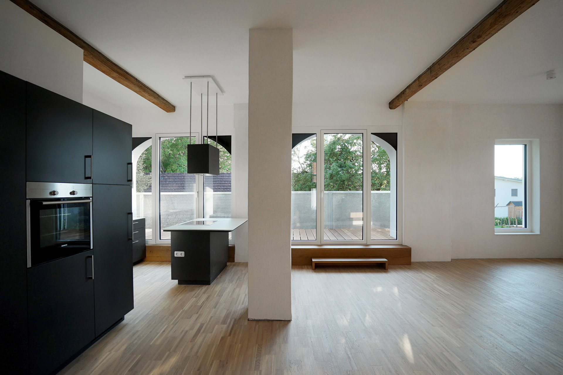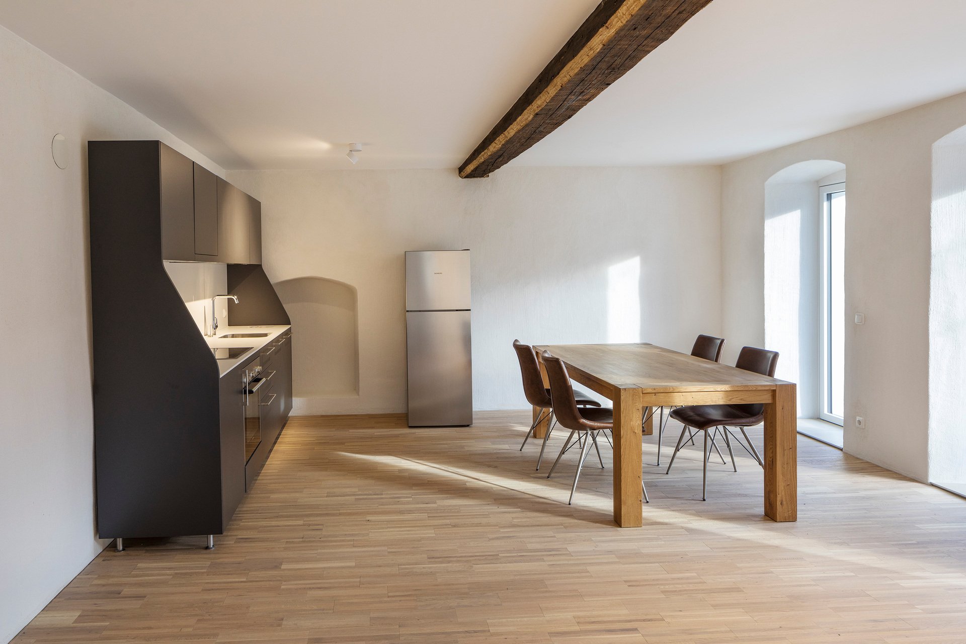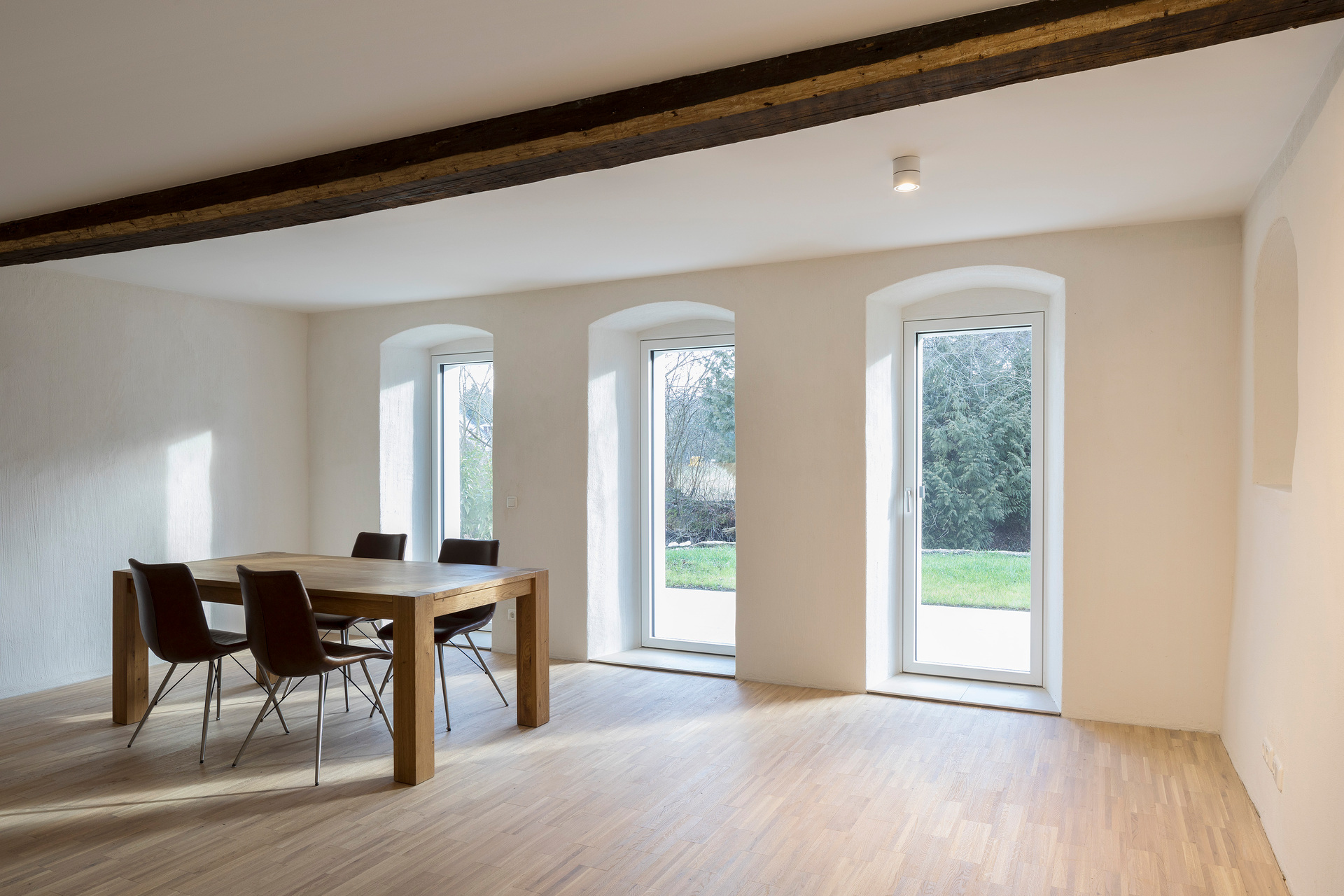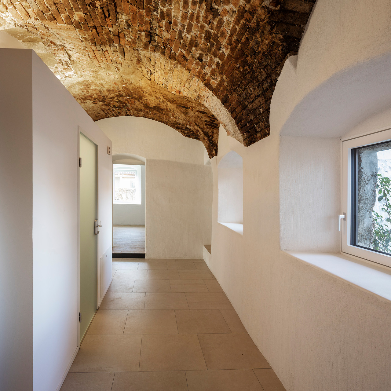Die barrierefreie Erschließung des Obergeschosses wurde über einen neuen Laubengang und ein frei im Hof stehendes Treppenobjekt geschaffen. Die historische schmale und gewundene Bestandstreppe samt Balkendecke im Innenraum konnte dadurch erhalten bleiben. Die südseitigen Wohneinheiten Richtung Mühlbach wurden im Obergeschoss mit leichten Balkonkonstruktionen aus verzinktem Stahl ergänzt. Die Giebel- und Wandflächen der Seitenflügel wurden, in Analogie zum ursprünglichen Erscheinungsbild, mit einer vertikalen Holzverschalung eingekleidet. (Text: Tobias Hagleitner, nach einem Text des Architekten)
